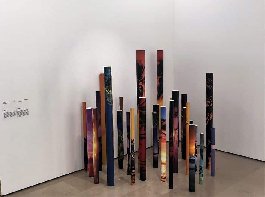In this work the artist has transformed the most banal piece of decoration that exists – posters of exotic landscapes in a setting sun – into a unique installation in which stand tubes of rolled-up glossy paper. it almost makes one think of Guy de Rougemont’s sculptures…