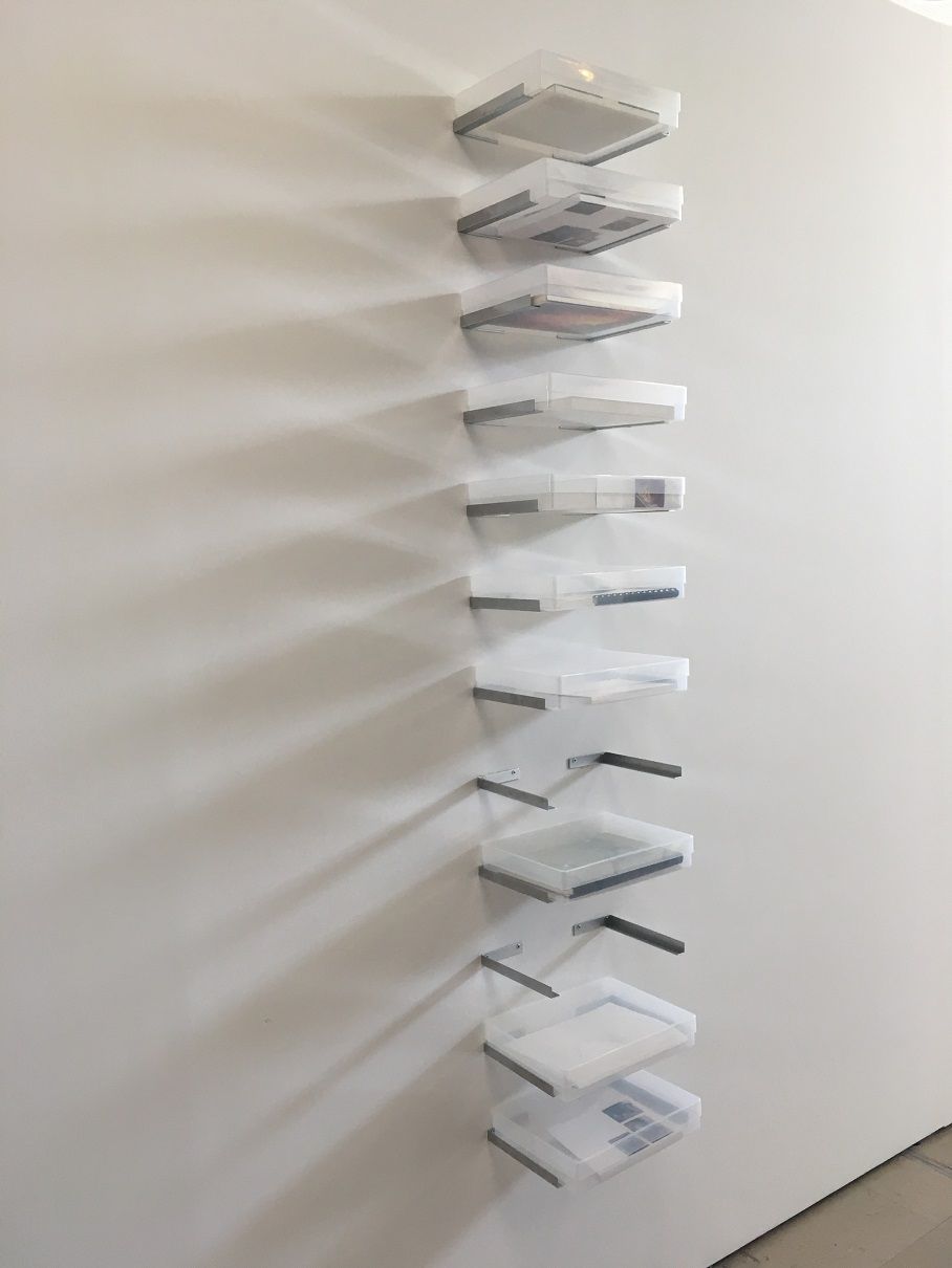 A tribute to “Stacks” by Donald Judd? Here this Parisian artist has mounted on a wall transparent plastic boxes each containing a different sized book. The peculiar thing about these volumes is that the text has not yet been printed : only images occupy the middle of this practical manual’s white pages. Without the context these images are very puzzling…