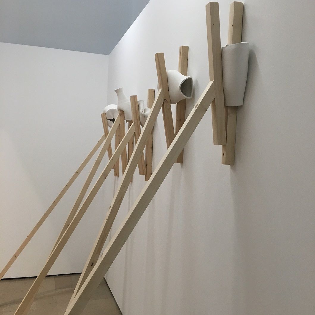 This installation by British artist Fenwick evokes a wooden buttress structure which provides support for an edifice. Here we get an impression of the fragile balance between the strength of the wood and the vulnerability of the earthenware.