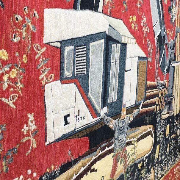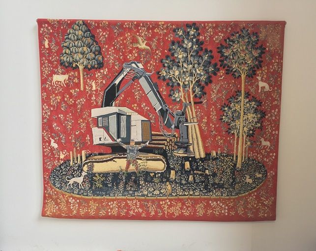 Directement inspirée de “La Dame à la Licorne”, une tapisserie du XVIème siècle, l’œuvre de cette jeune artiste américaine confronte ici la nature riche et luxuriante, celle du décor de “La Dame à la Licorne”, à des préoccupations contemporaines, politiques et écologiques, incarnées par cet activiste barrant la route à un engin d’agriculture.