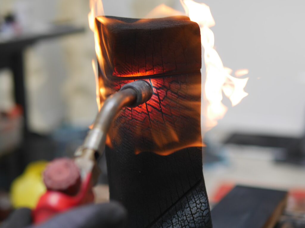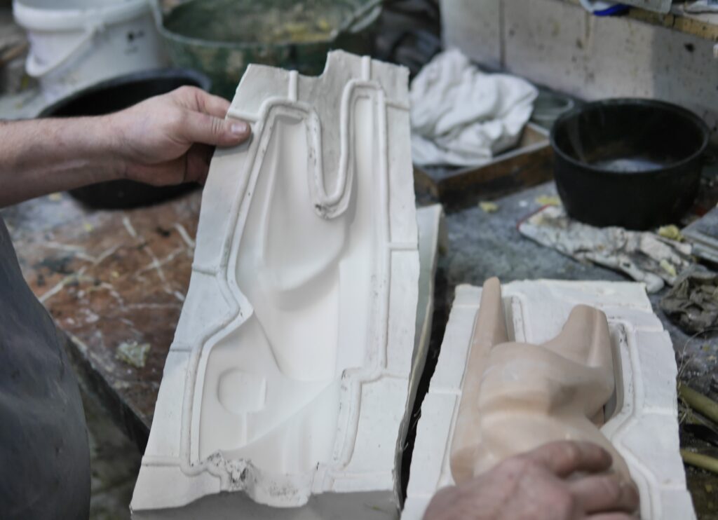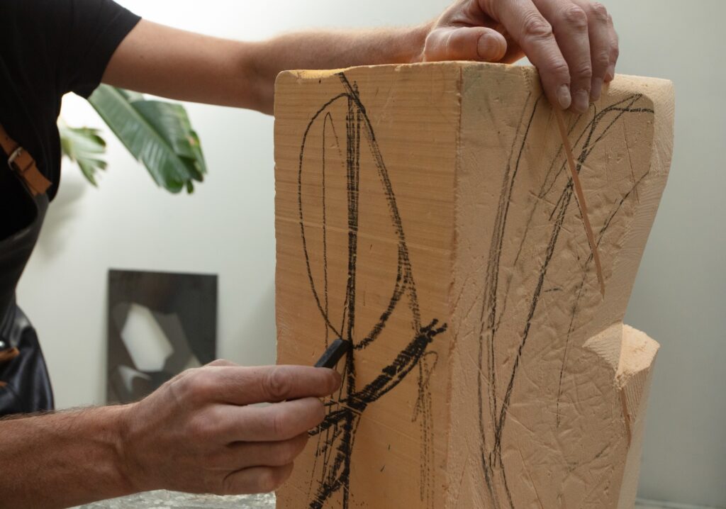 Avant de confier une œuvre à la fonderie, Antoine Vidal la façonne d’abord en bois ou, plus fréquemment, dans une mousse de polyuréthane très dense et dure. Pendant plusieurs jours, il dessine et trace des lignes directement sur le bloc, l’observe sous tous les angles et en photographie chaque face. Les sessions de travail sont volontairement courtes, afin de préserver sa concentration. Lorsqu’il se sent suffisamment confiant — car une fois taillé, il n’est plus possible de revenir en arrière — il commence à travailler le bloc avec des outils simples et traditionnels tels que des gouges, des scies et des râpes, jusqu’à faire apparaître « des évidences » : les lignes tendues s’unissent, les pleins et les vides s’alternent pour créer un équilibre harmonieux. Dans cette phase créative, l’artiste se laisse guider par ses mains dans ce qu’il décrit comme « une danse à deux ». Une fois la forme établie, il procède au ponçage, étape finale essentielle pour obtenir cet aspect lisse, si caractéristique de son travail, écho à la statuaire africaine.