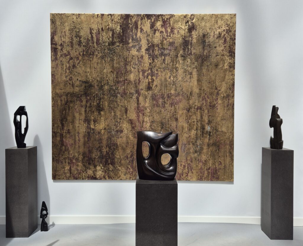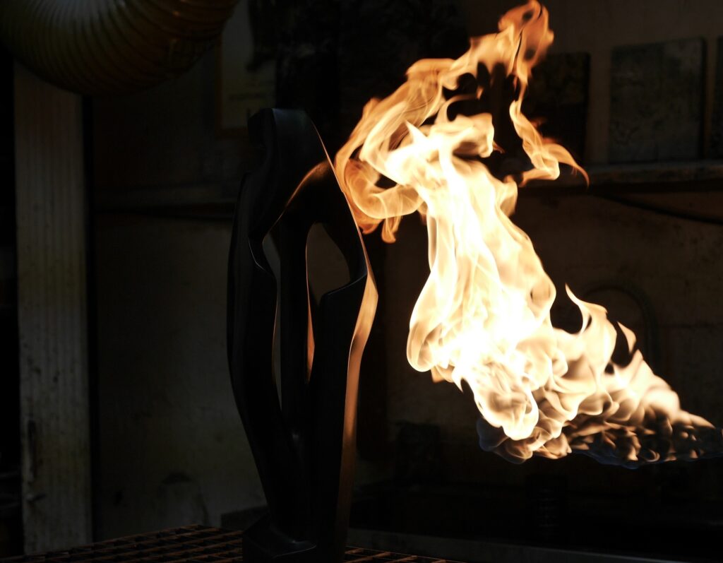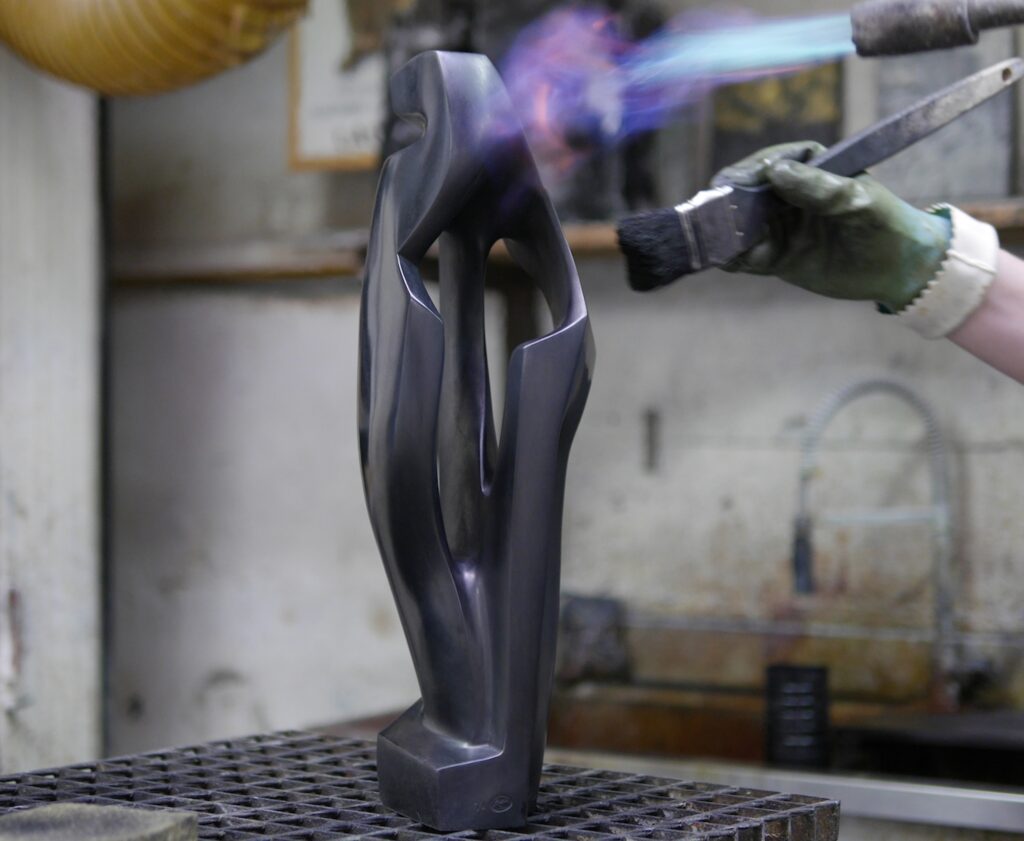 Le sculpteur contemporain réalise ensuite un moule qu’il confie à la fonderie, où le travail du bronze se déploie en plusieurs étapes : fonte, ciselure et patine. Cette dernière est particulièrement passionnante pour le sculpteur, car le choix de la patine détermine la couleur, la texture et les reflets de l’œuvre achevée. Antoine Vidal privilégie des teintes sobres, souvent sombres, et des patines aux allures minérales qui brouillent la perception du matériau. Mais surtout, le bronze et sa patine permettent à la lumière de glisser sur la pièce, soulignant ainsi son élégance, son caractère fluide et sinueux.
