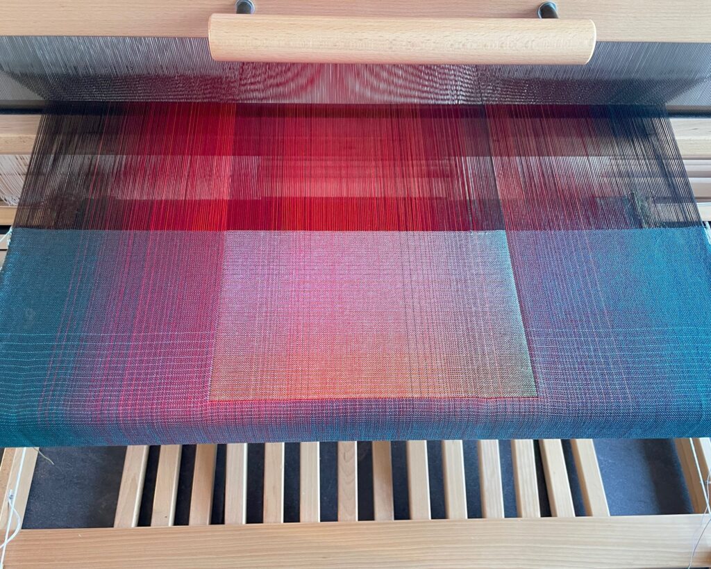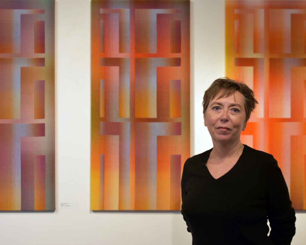 Ce qui motive l’artiste textile Christiane Maurer, c’est une recherche scientifique complexe sur les couleurs, qui dévient presque un défi : avec la peinture, il est possible de mélanger les couleurs pour en obtenir d’autres, mais avec les fils du tissu cela n’est pas envisageable. Elle doit donc étudier les combinaisons, les interactions, les dégradés et les transitions graduelles à partir des couleurs de chaque fil. Pour ce faire, elle emploie des motifs géométriques assez simples : « Pour moi, les motifs sont les endroits où différentes lignes colorées se rencontrent, se cherchent et interagissent. Je me suis rendu compte que je n’avais pas besoin de beaucoup de motifs ; j’ai juste besoin de quelques contours où les lignes colorées peuvent se rencontrer et peuvent exploser, ou disparaître. »