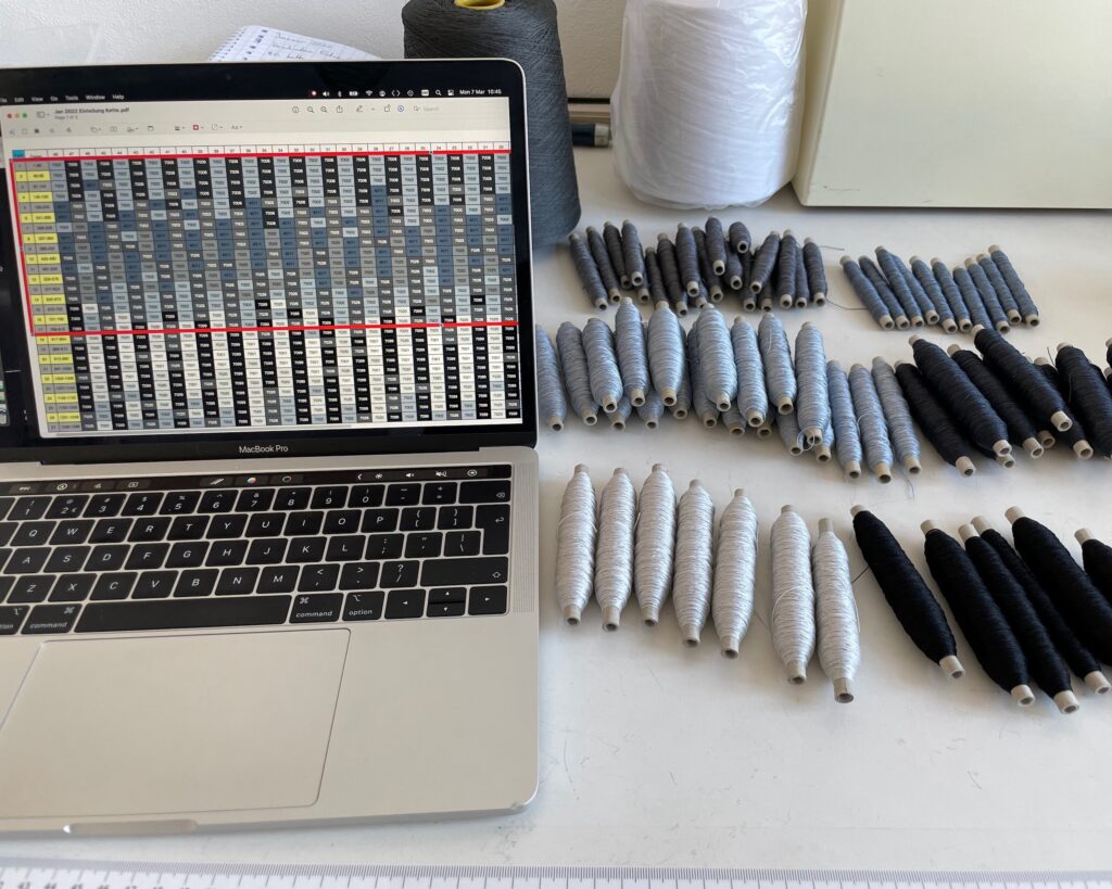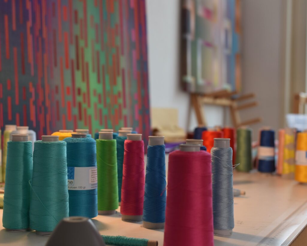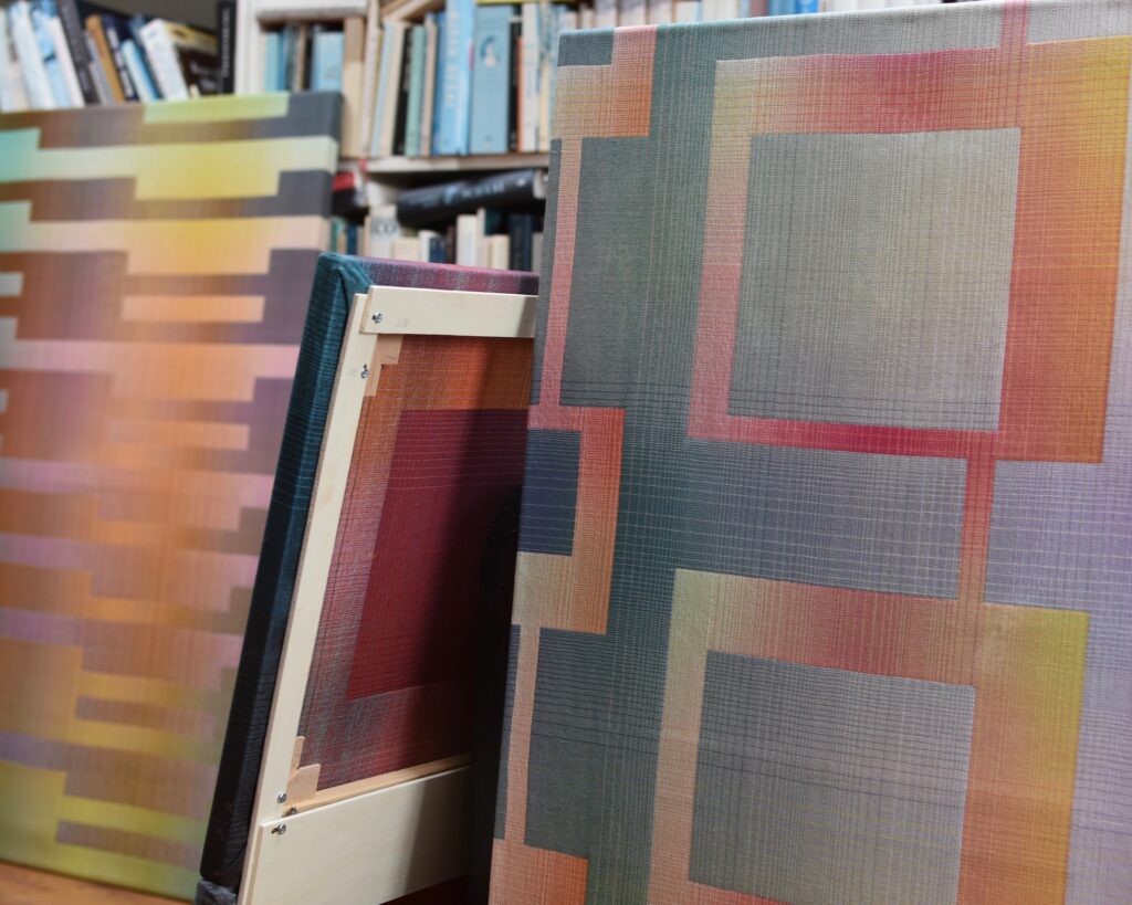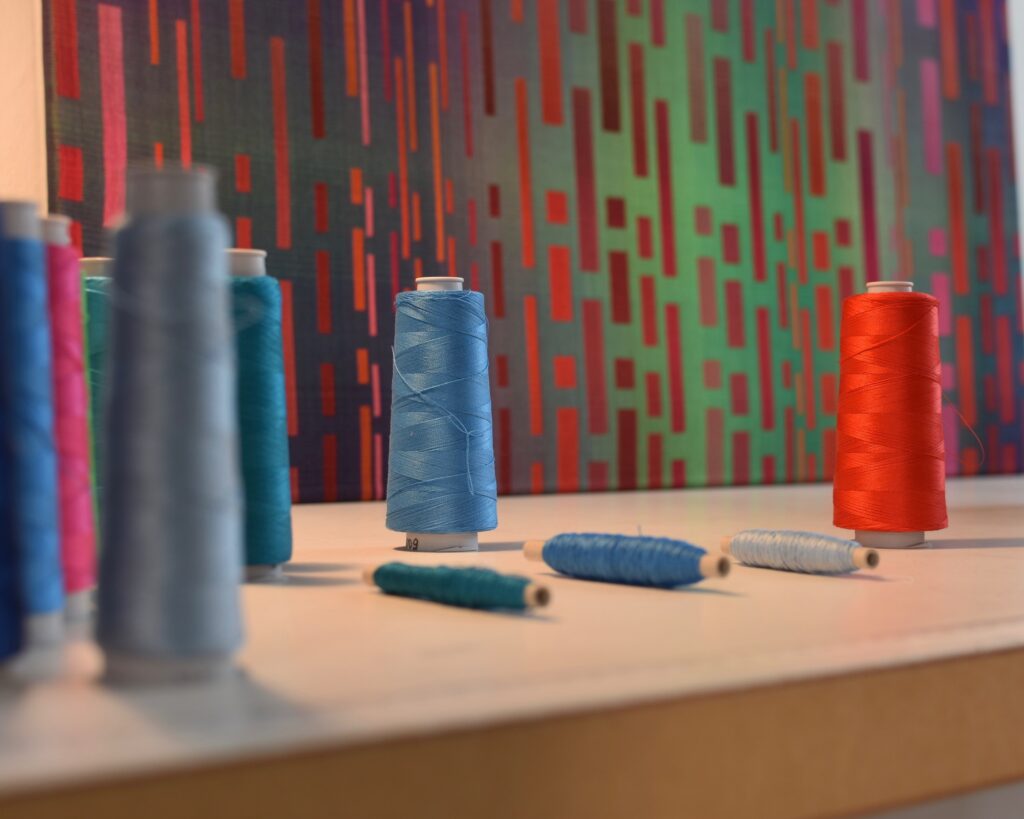 Le design numérique est ensuite transposé en projet de tissage grâce à un autre programme spécialisé : ce projet détermine la couleur de chaque fil qui sera tissé dans la chaîne (fils verticaux) et dans la trame (fils horizontaux), et contient les instructions pour tisser la pièce. La partie manuelle peut alors débuter : les fils de coton sont enroulés sur les bobines, placées sur un support dans leur séquence exacte, et le métier à tisser est installé. Se plongeant dans une concentration profonde, l’artiste textile commence à tisser avec la technique très ancienne du double tissage : deux couches de tissu sont tissées et interagissent en certains points, interchangeant leur position supérieure/inférieure pour former un motif. Une fois l’œuvre tissée, elle est tendue sur un châssis en bois comme une toile.