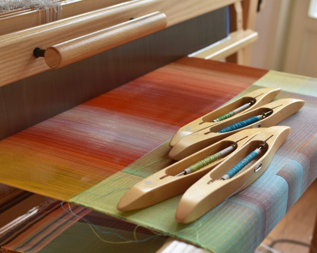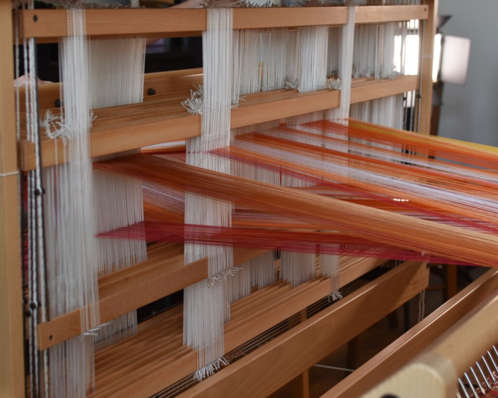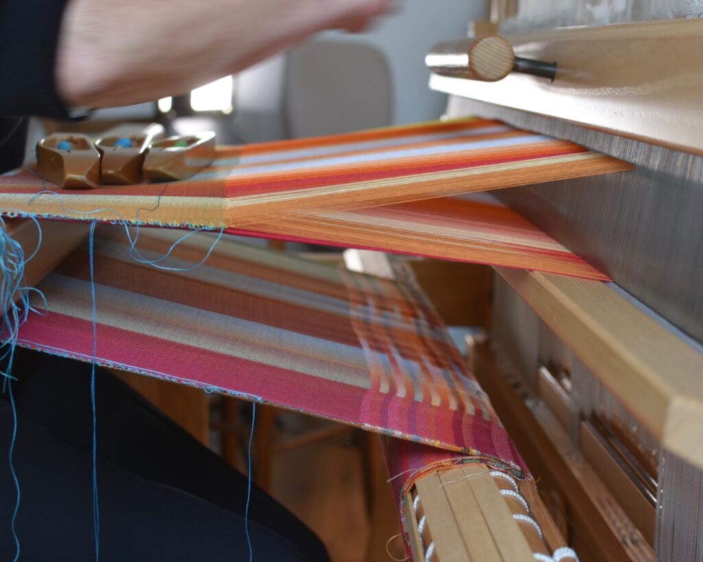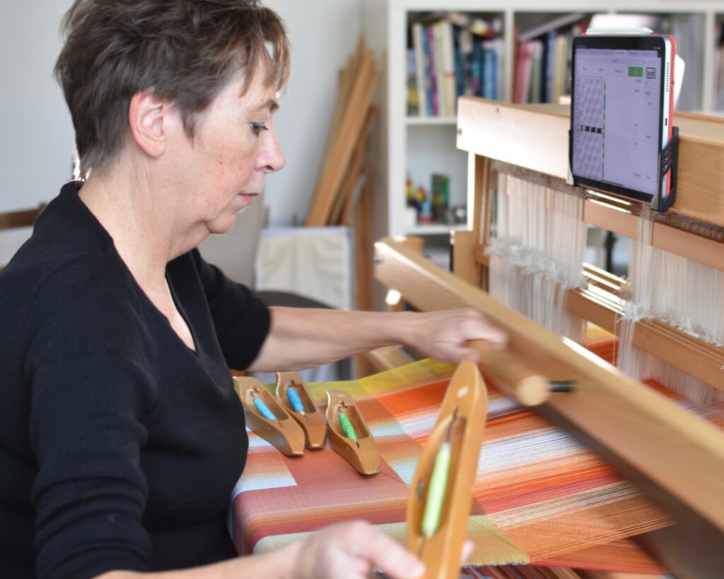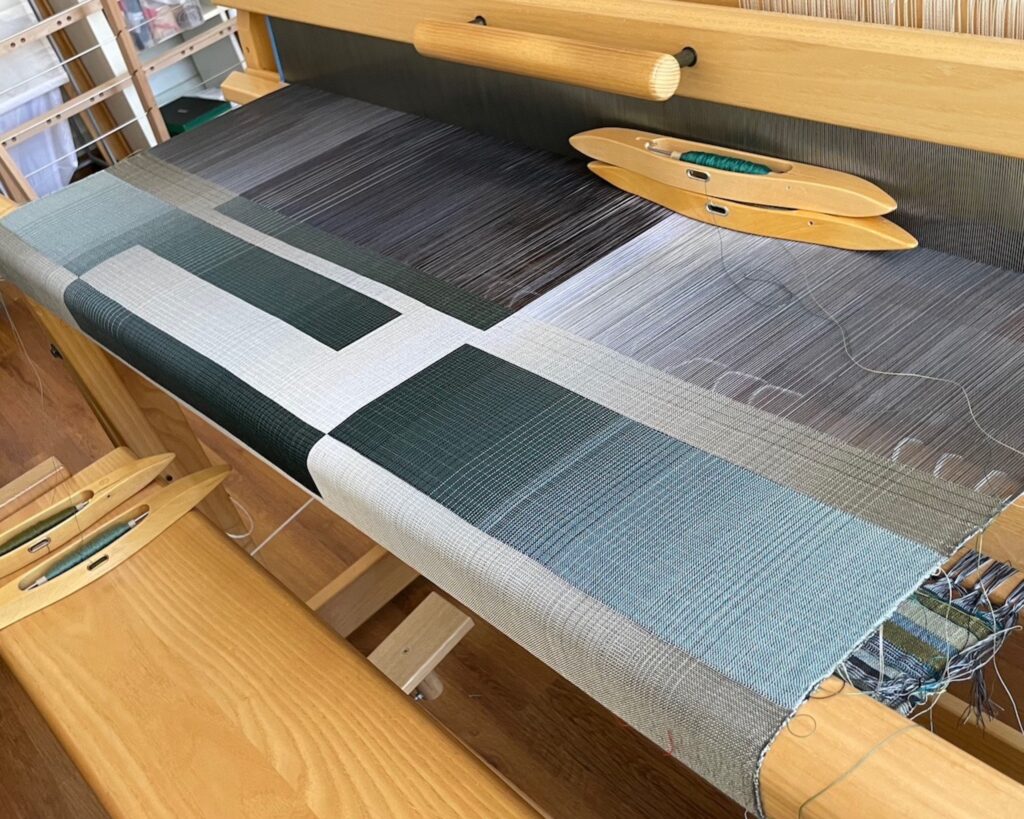 Le design numérique est ensuite transposé en projet de tissage grâce à un autre programme spécialisé : ce projet détermine la couleur de chaque fil qui sera tissé dans la chaîne (fils verticaux) et dans la trame (fils horizontaux), et contient les instructions pour tisser la pièce. La partie manuelle peut alors débuter : les fils de coton sont enroulés sur les bobines, placées sur un support dans leur séquence exacte, et le métier à tisser est installé. Se plongeant dans une concentration profonde, l’artiste textile commence à tisser avec la technique très ancienne du double tissage : deux couches de tissu sont tissées et interagissent en certains points, interchangeant leur position supérieure/inférieure pour former un motif. Une fois l’œuvre tissée, elle est tendue sur un châssis en bois comme une toile.