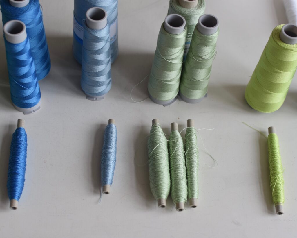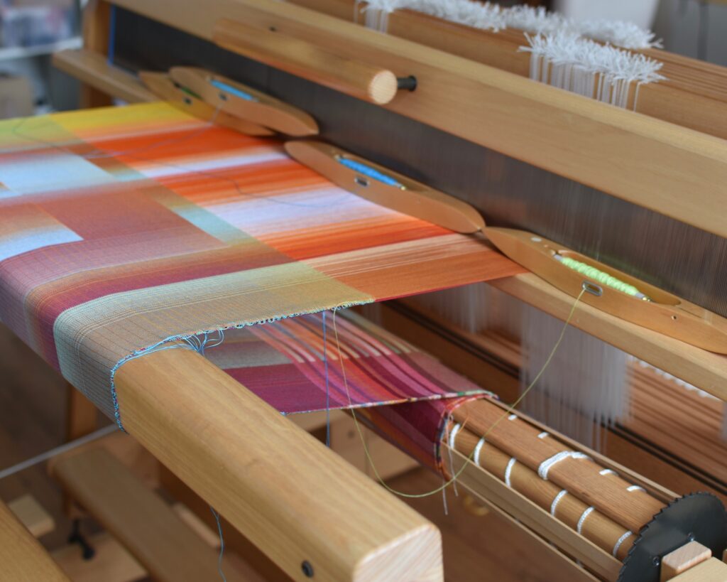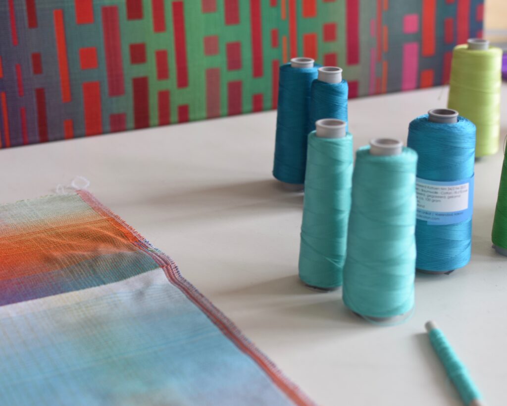 L’inspiration de l’artiste contemporaine textile Christian Maurer provient de deux sources : la première est la nature, par exemple la texture d’un tronc d’arbre, la lumière changeante sur une plage, ou encore les ondulations sur la surface de l’eau. La seconde, ce sont les émotions, notamment celles suscitées par une certaine couleur. De l’inspiration vient l’idée et commence alors la partie principale de la création : à l’ordinateur, sur un programme de design graphique, l’artiste textile crée plusieurs études de couleurs pour transformer son idée en projet tangible. L’idée se concrétise ainsi dans une ‘pièce maîtresse’ numérique, qui donne vie à une série. Les autres pièces de la série sont développées en tant que variations de celle-ci, explorations d’autres combinaisons de couleurs et dégradés.