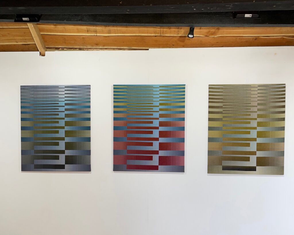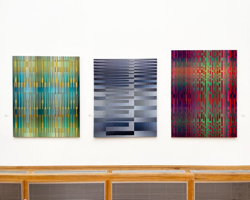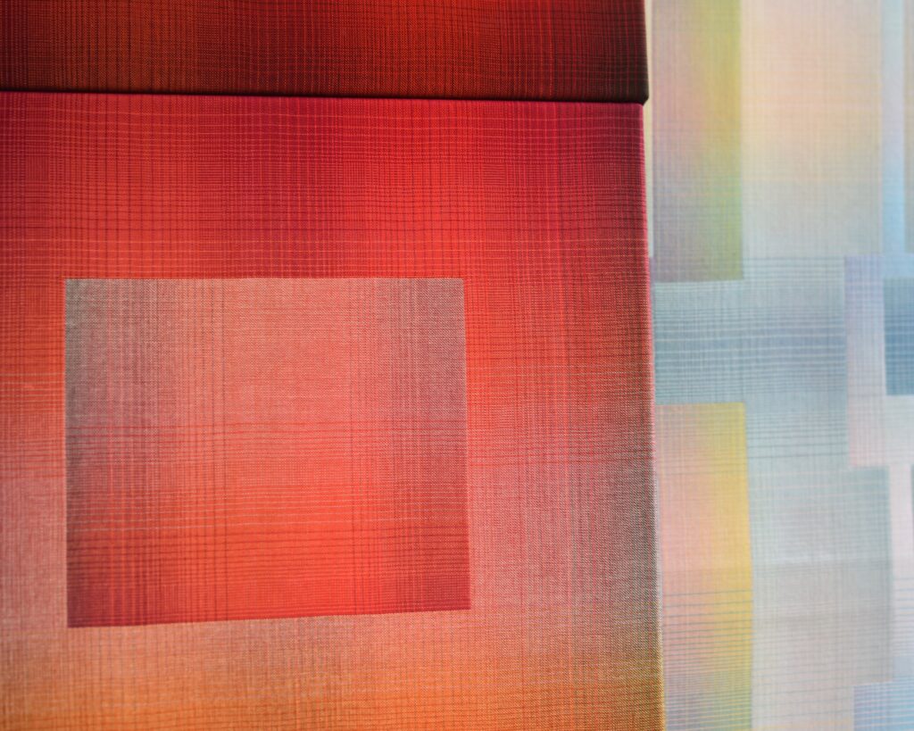Les œuvres abstraites de l’artiste textile Christiane Maurer explorent la perception des couleurs et leurs interactions. Créées à travers un processus qui allie savoir-faire traditionnel et méthodes numériques, elles révèlent des nuances changeantes et de subtiles iridescences en fonction de la lumière de leur environnement ou du mouvement de l’observateur.