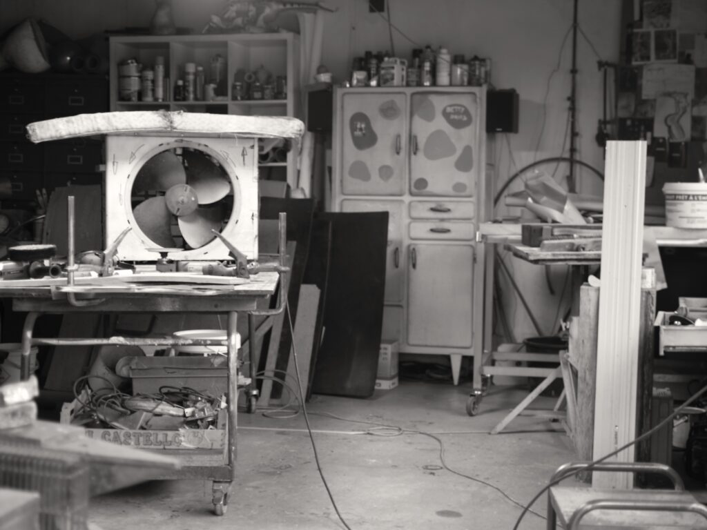 Pendant le processus de création, l’artiste se laisse parfois guider par les formes qui surgissent sur la surface du métal tandis qu’il déforme la feuille d’inox en créant des convexités et des concavités. Ces apparitions sont rendues possible par l’installation, tout autour de la sculpture, de plaques colorées qui se reflètent dans le métal en train d’être travaillé.