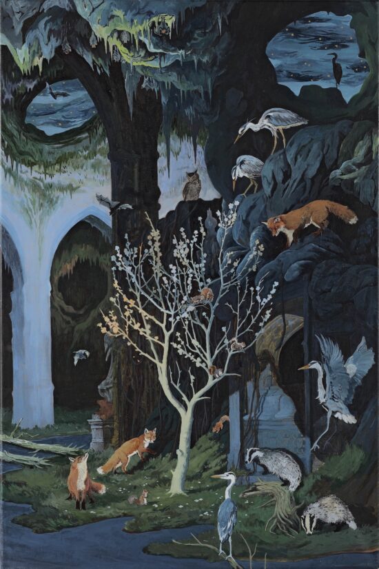 Au cœur de l’œuvre de Rene Gonzalez se trouve un sens profond de la narration, qui se déploie dans des compositions théâtrales où des figures animales peuplent des forêts luxuriantes, rendues de manière complexe, auxquels se mêlent parfois des architectures construites par l’homme. Le résultat est la création d’un monde onirique et mystérieux, qui attire le spectateur par son utilisation harmonieuse et évocatrice de la couleur.