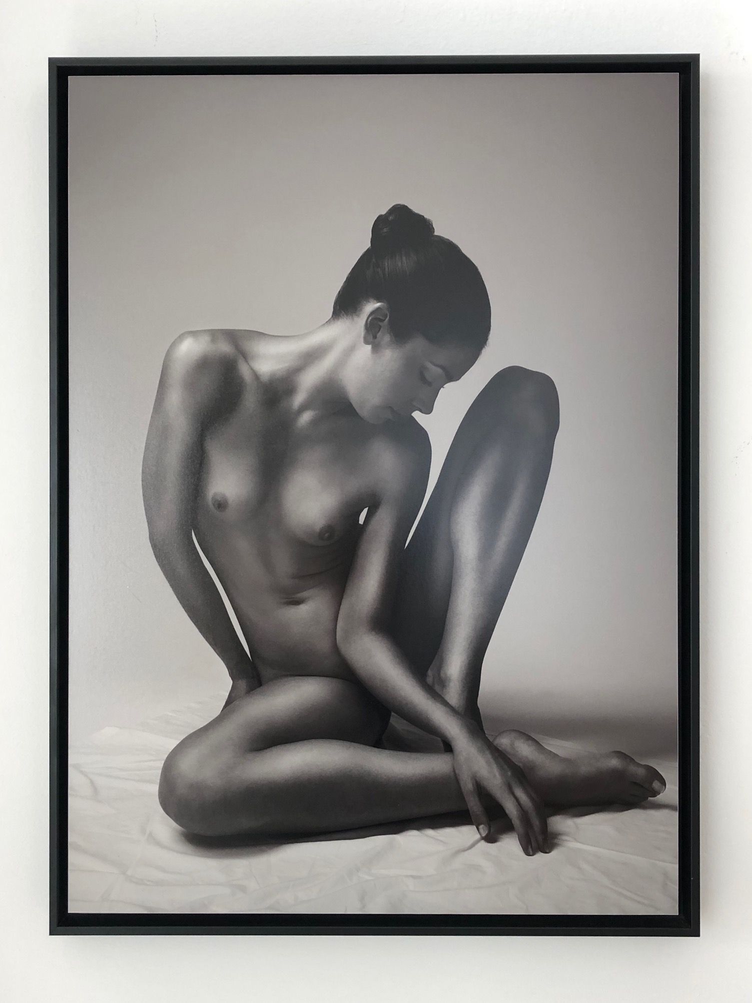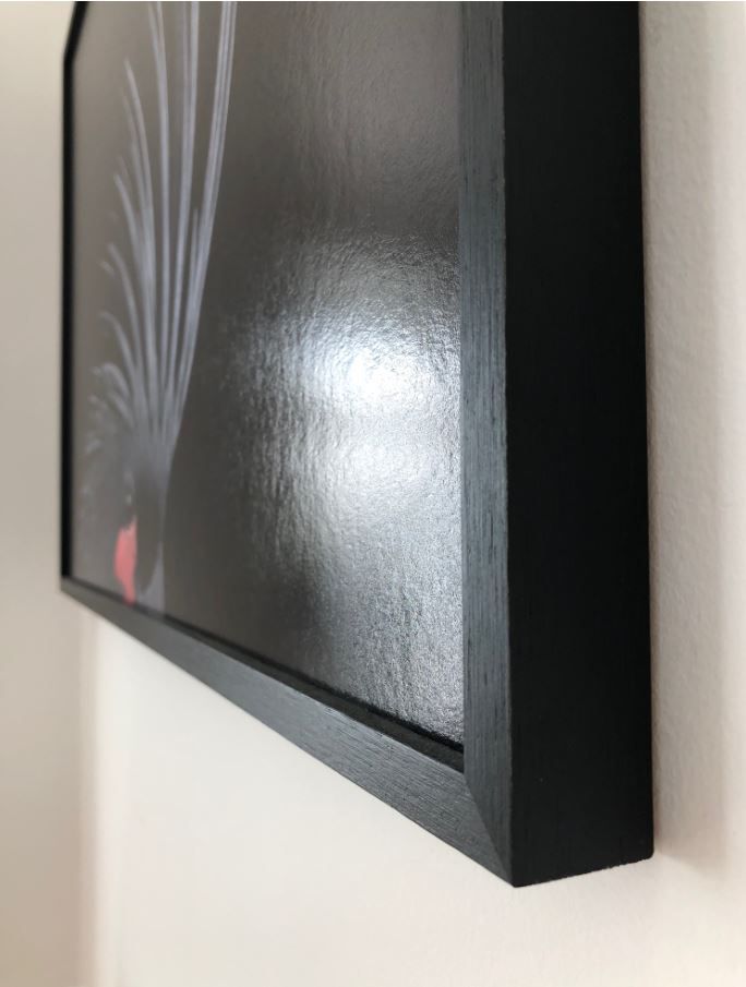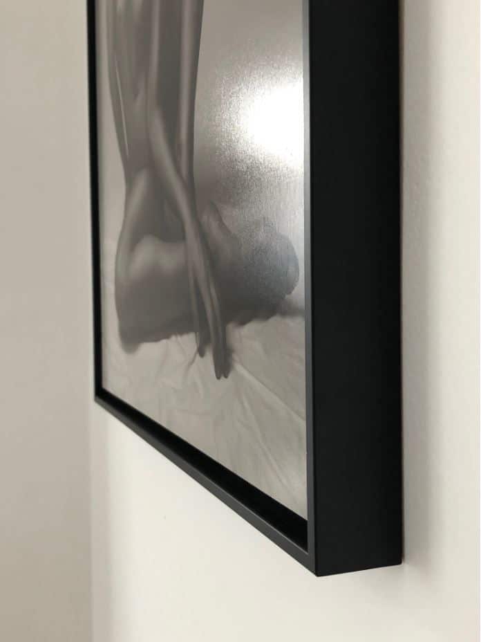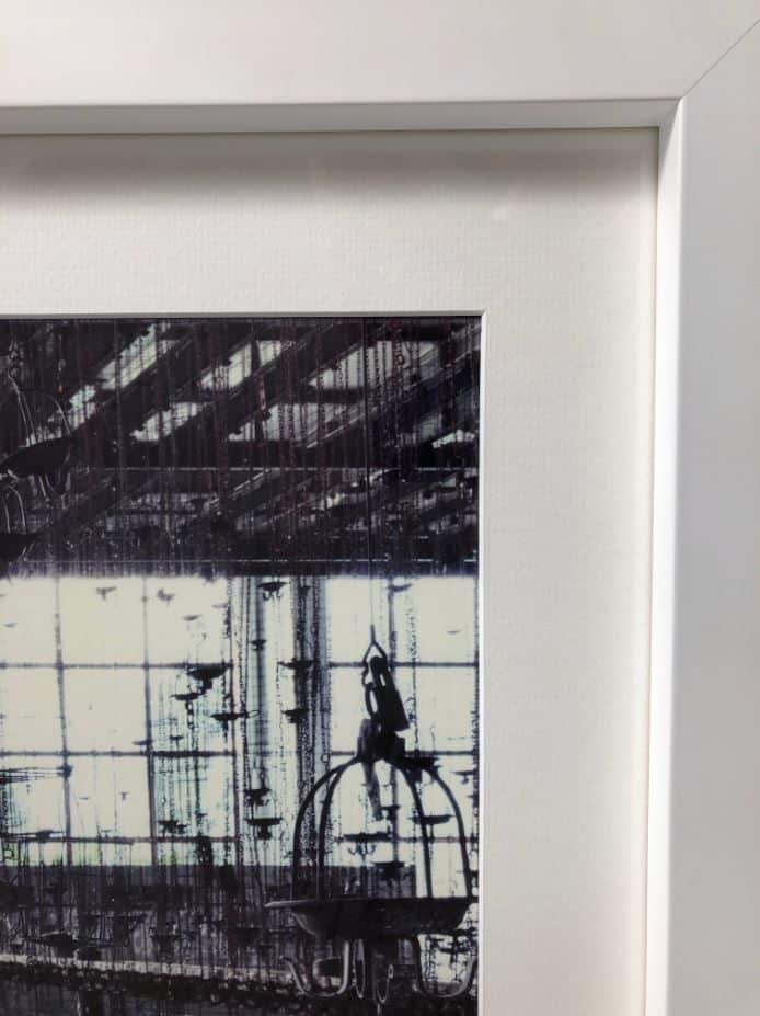 La seconde étape est l’ajout d’un châssis en aluminium, solution d’accrochage qui produit un effet de flottement de la photographie sur le mur. Au dos de la plaque d’aluminium sur laquelle est laminée la photographie, l’encadreur va coller un châssis dont l’épaisseur variable va influencer l’effet que l’œuvre accrochée va produire : un flottement élégant dont l’ombre portée est accentuée par rapport à une autre solution d’encadrement.