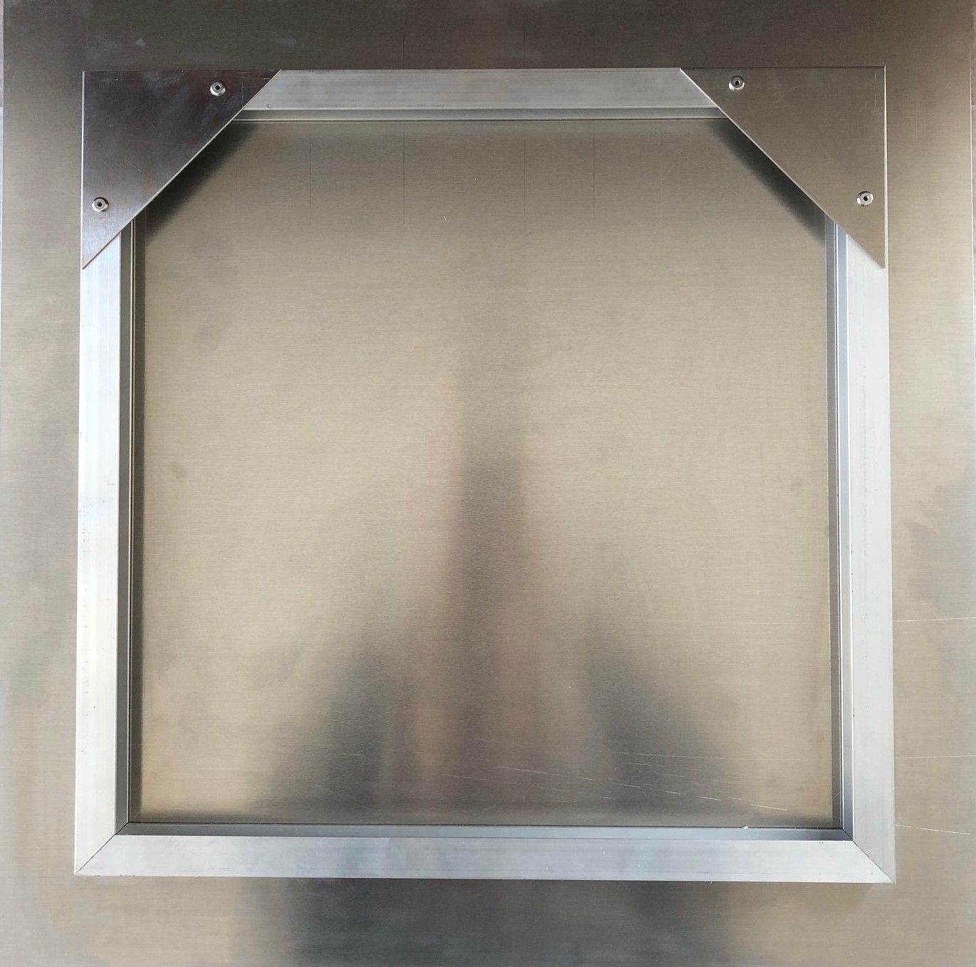 Pour cette solution d’encadrement, le contre collage est également la première étape. C’est donc sur la plaque d’aluminium que l’encadreur va fixer un cadre. Comme pour la solution du châssis aluminium, un effet de flottement de la photographie est produit, à ceci près que le flottement est produit par la distance qui se situe entre les bords de la photographie, et les bords du cadre.