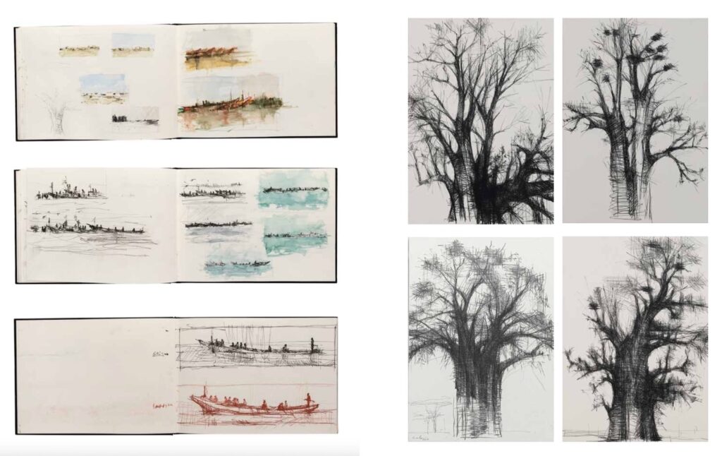 Six années et près de 6000 kilomètres séparent les deux voyages effectués par Calo Carratalá en Afrique, le premier en Tanzanie, en 2017 et le second au Sénégal en 2023. Les 200 œuvres que l’on découvre sur le parcours de l’exposition ‘Paisajes sin tiempo’ sont le témoignage de ces immersions du peintre espagnol dans les paysages du continent. Carnets de voyage, dessins, peintures grand format… Certaines de ces œuvres ont été produites au cours même de ses itinérances, d’autres bien plus tard, dans le cadre familier de son atelier près de Valence.