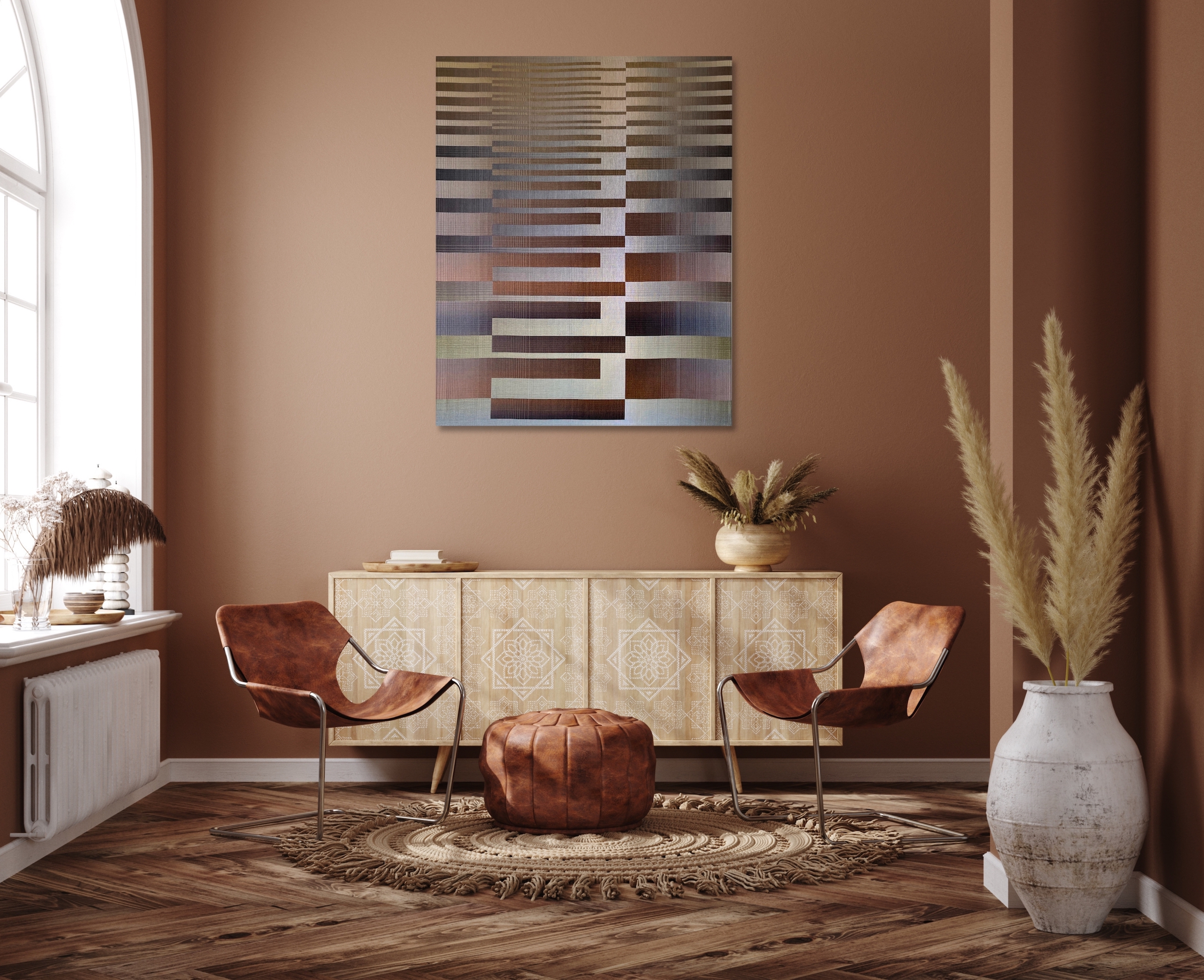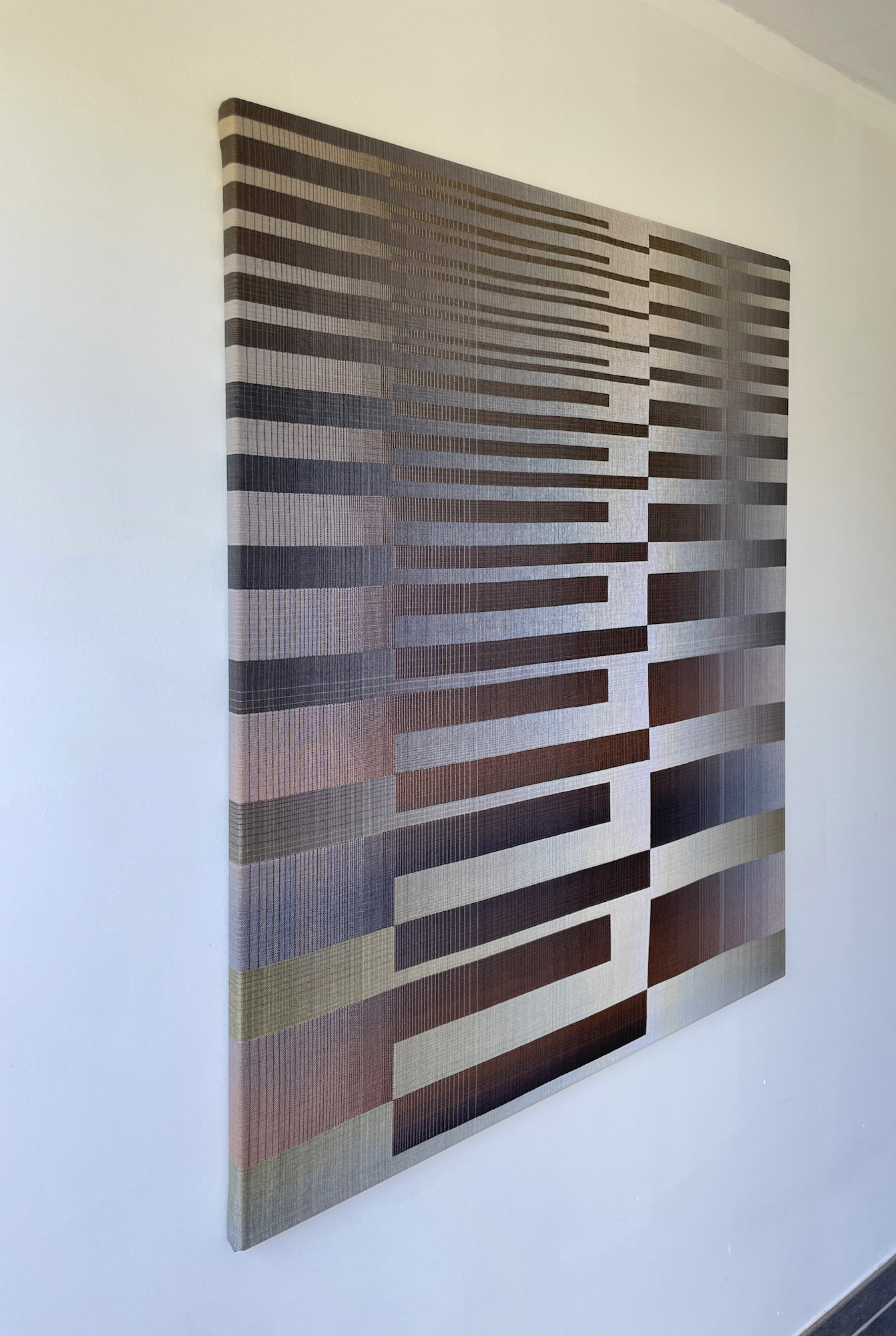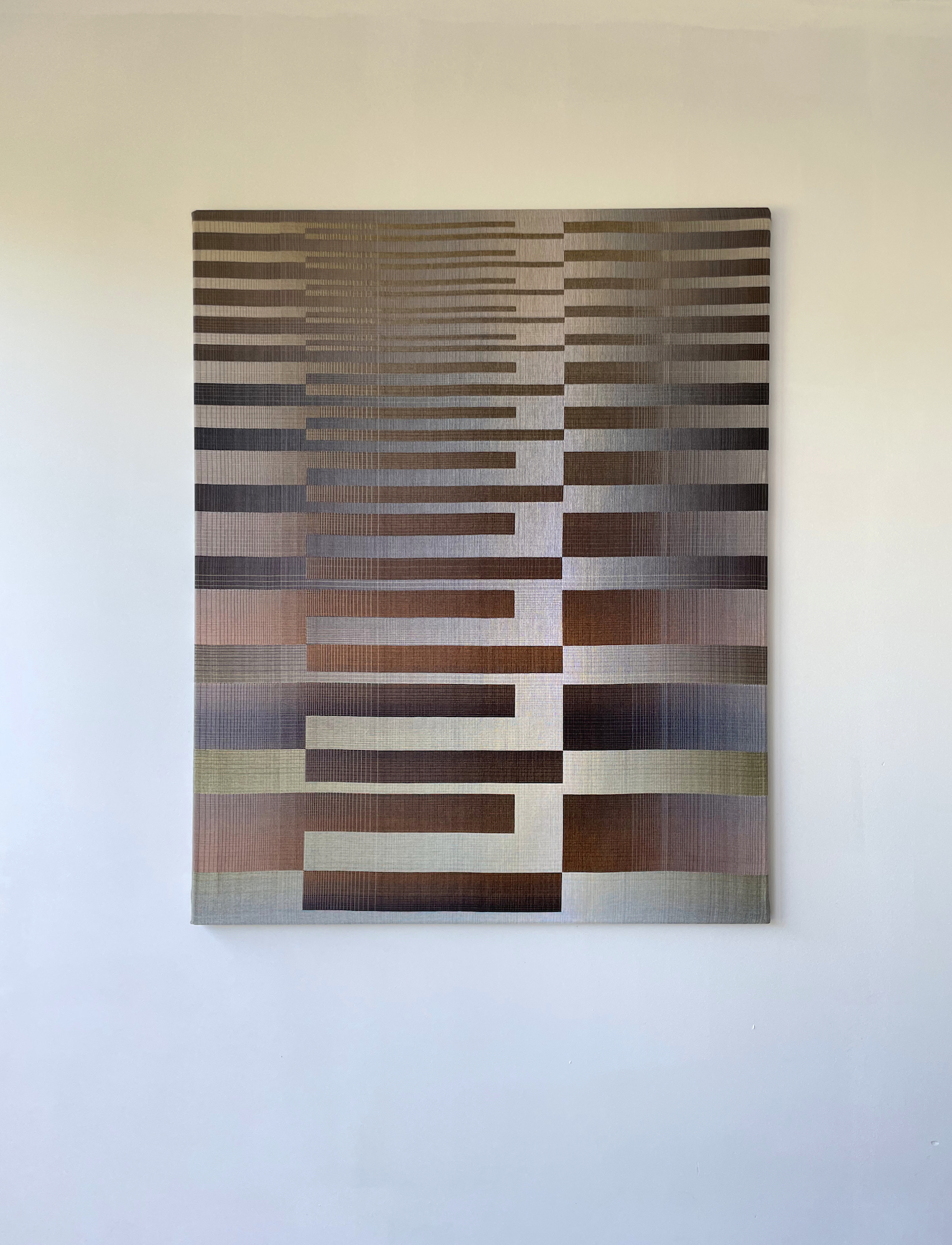 Pour cette série, l’artiste utilise des motifs géométriques rectangulaires et horizontaux afin d’explorer les combinaisons et les transitions entre couleurs différentes. Le défi pour elle est d’explorer ces dégradés non pas avec de la peinture, qui peut être mélangée, mais avec des fils individuels qui doivent interagir avec les nuances des fils adjacents.