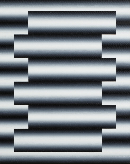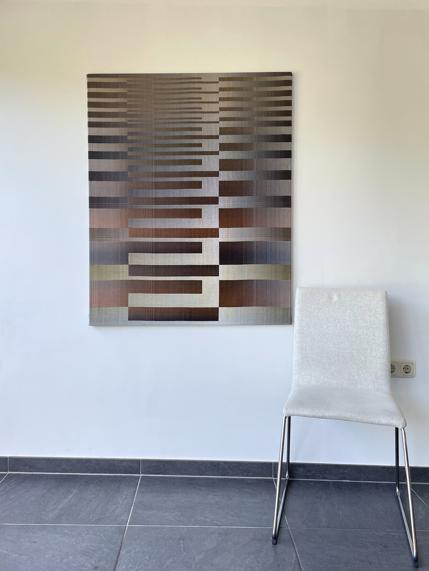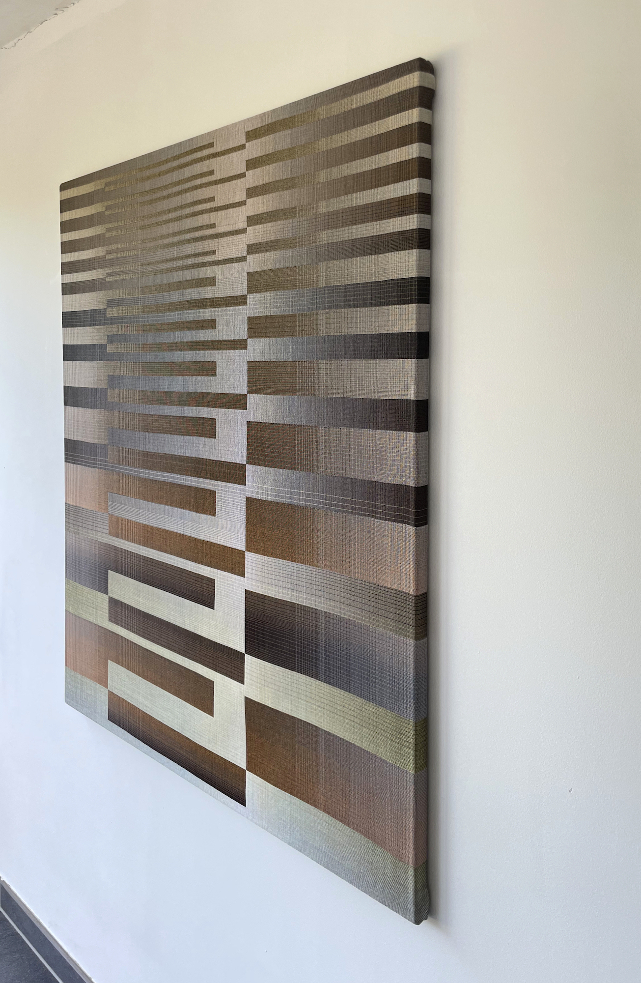 Pour cette série, l’artiste utilise des motifs géométriques rectangulaires et horizontaux afin d’explorer les combinaisons et les transitions entre couleurs différentes. Le défi pour elle est d’explorer ces dégradés non pas avec de la peinture, qui peut être mélangée, mais avec des fils individuels qui doivent interagir avec les nuances des fils adjacents.