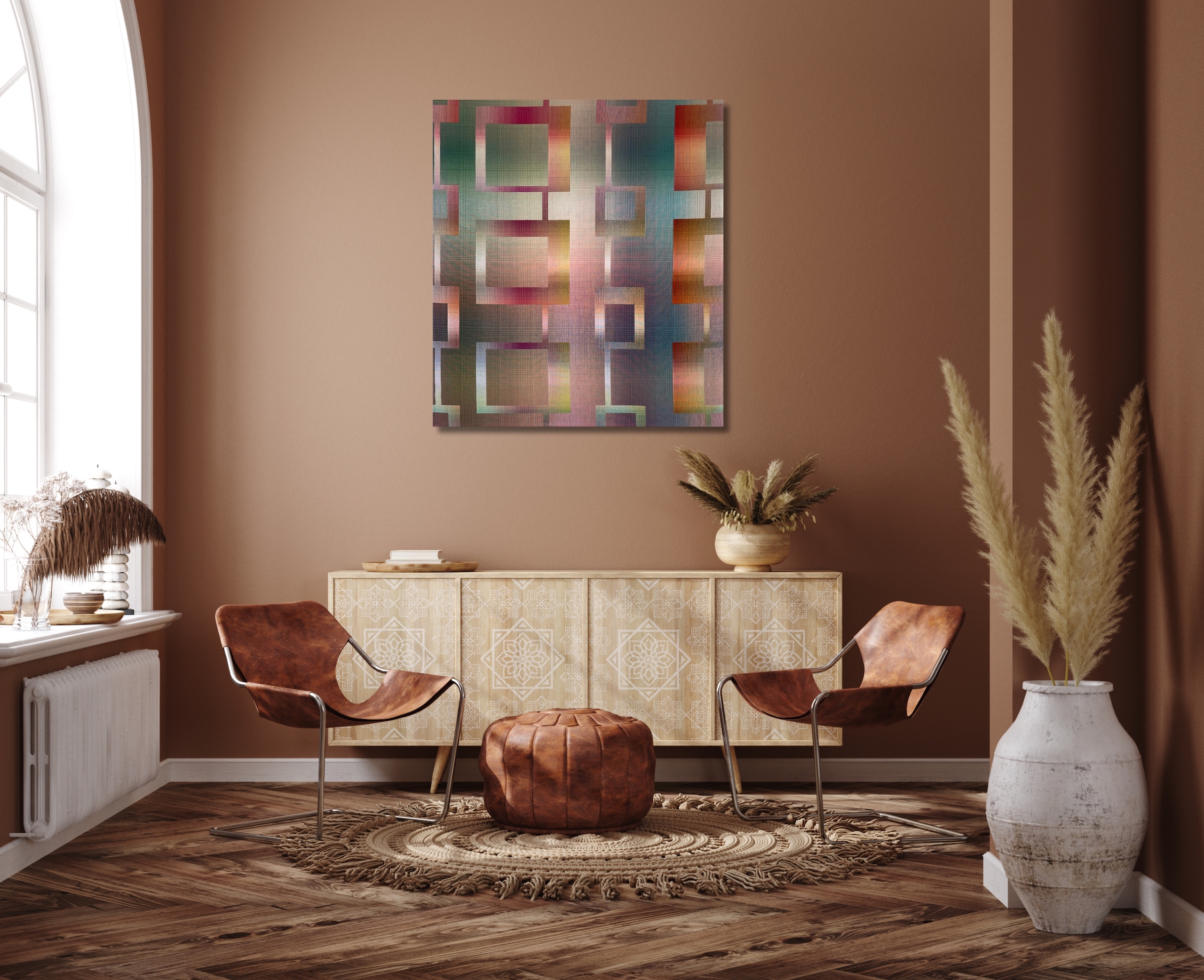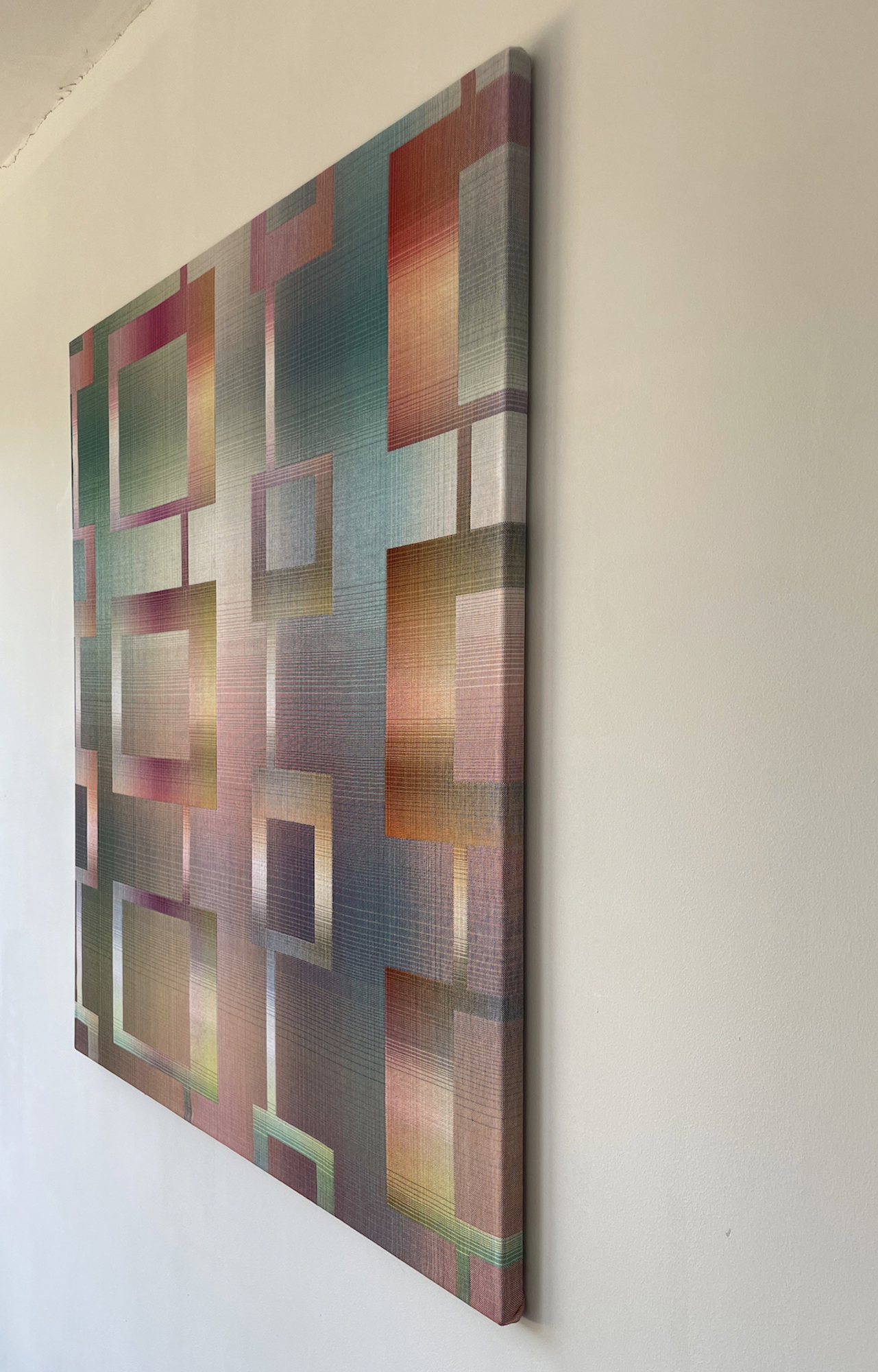 Dans cette série, l’artiste utilise des motifs géométriques réguliers pour explorer les interactions entre des couleurs froides, comme le bleu et le vert, et des couleurs chaudes, comme l’orange ou le rose. L’alternance entre tonalités vives et tonalités claires confère à ces œuvres un aspect lumineux et dynamique.