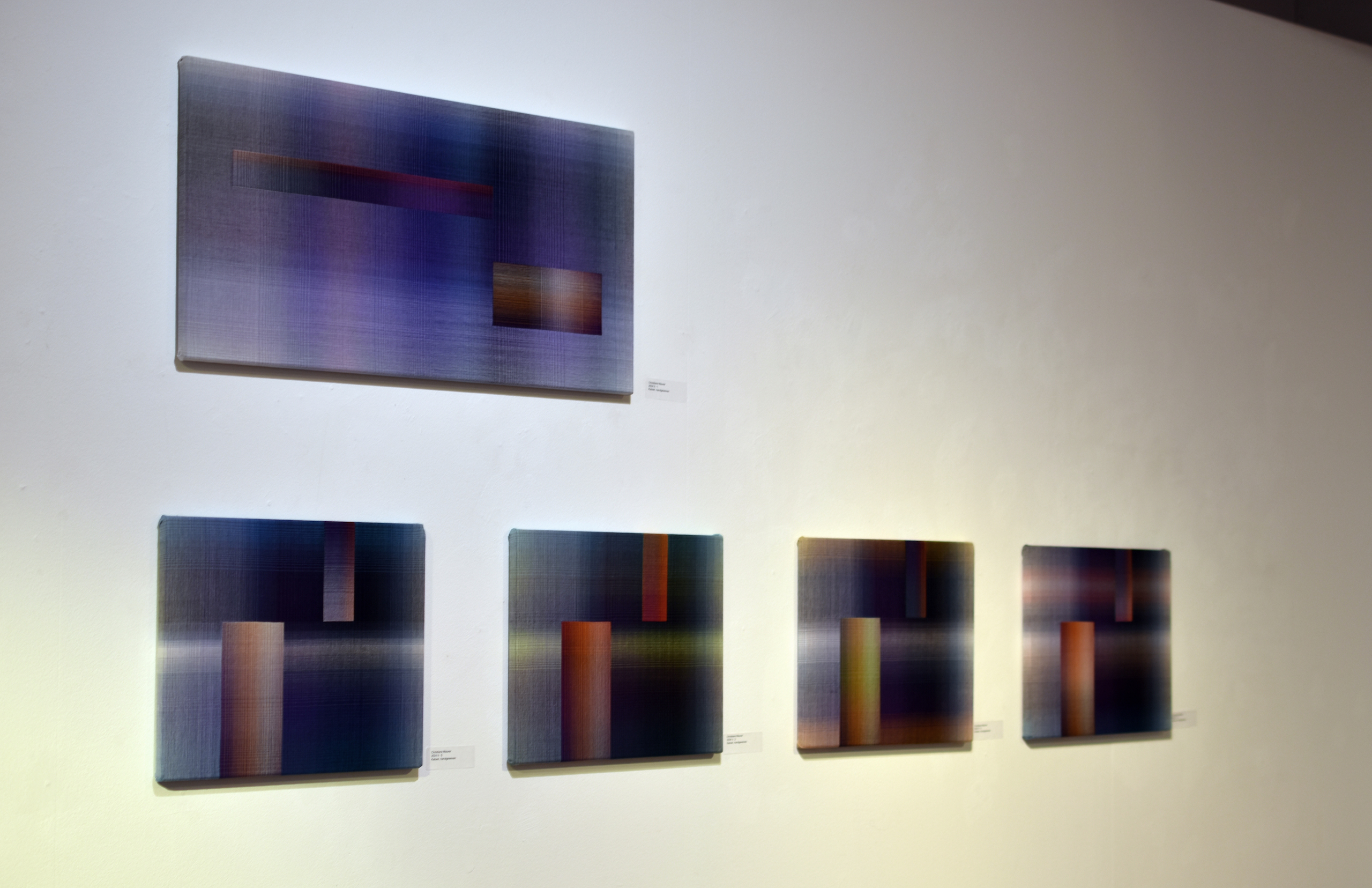 Dans cette série, l’artiste utilise des motifs géométriques très simples, deux rectangles, pour explorer les interactions entre des couleurs froides, comme le violet et le vert, et des couleurs chaudes, comme l’orange ou le jaune. Par rapport aux autres séries, les motifs sont ici simplifiés. Cela fait partie de l’évolution artistique de Christiane Maurer, qui explique : « Je me suis rendu compte que je n’avais pas besoin de beaucoup de motifs ; j’ai juste besoin de quelques contours où les lignes colorées peuvent se rencontrer et peuvent exploser, ou disparaître. »