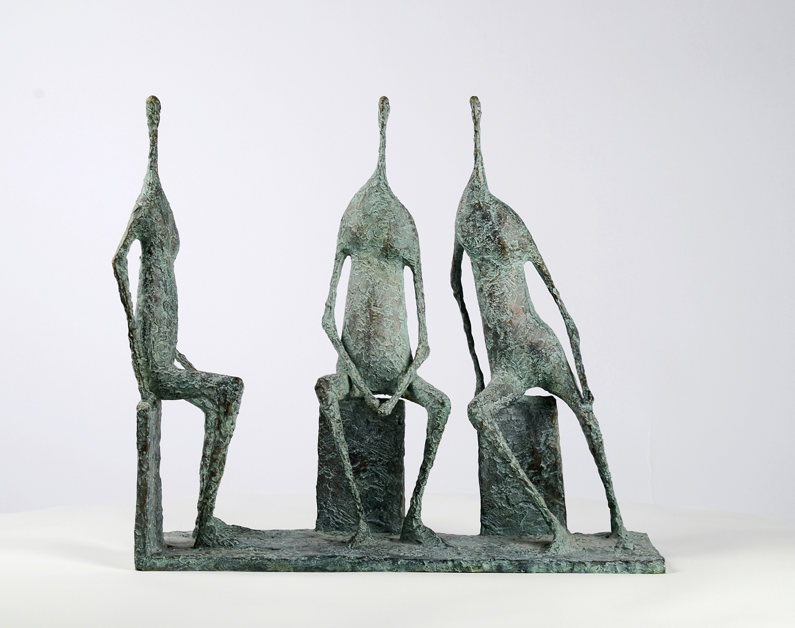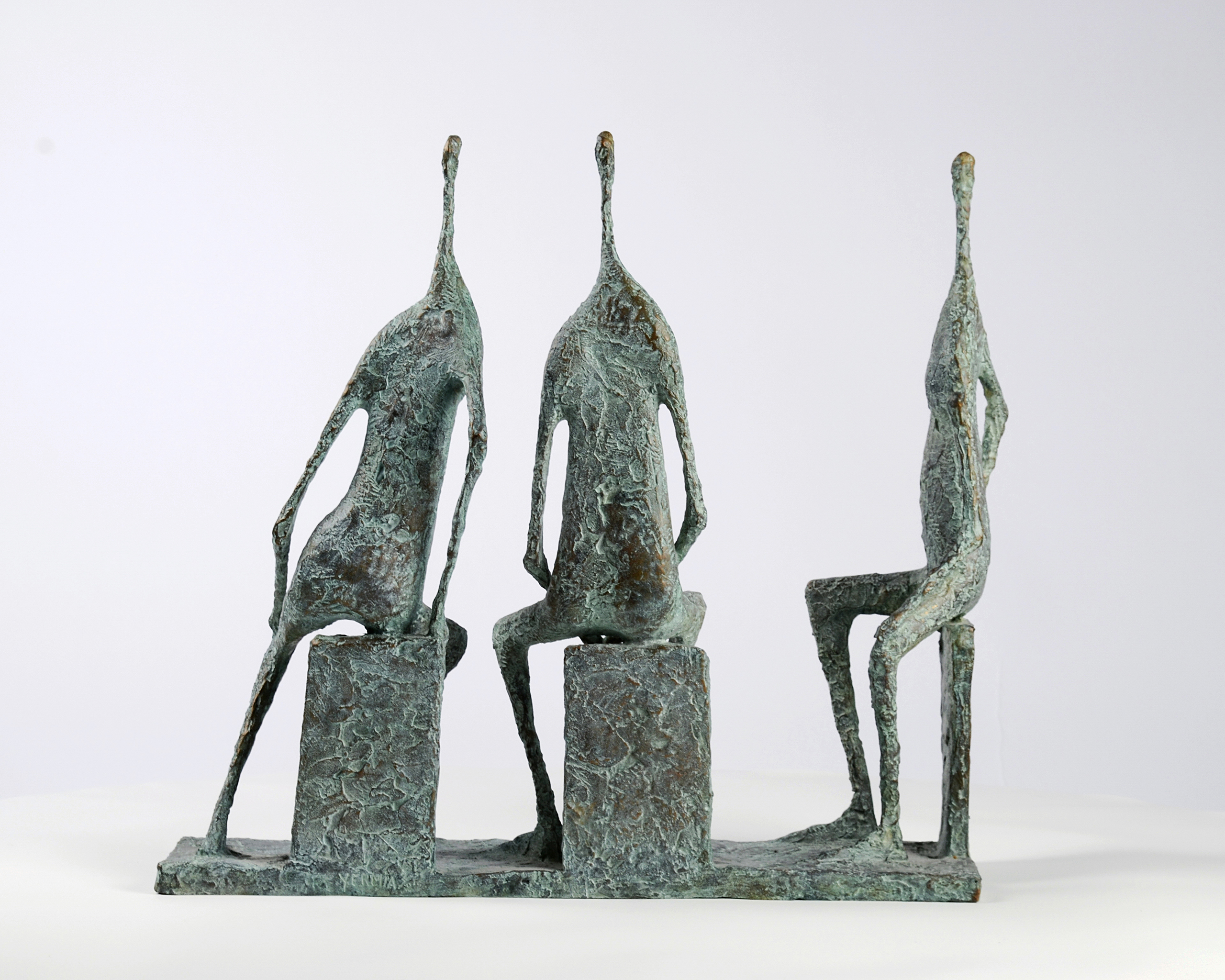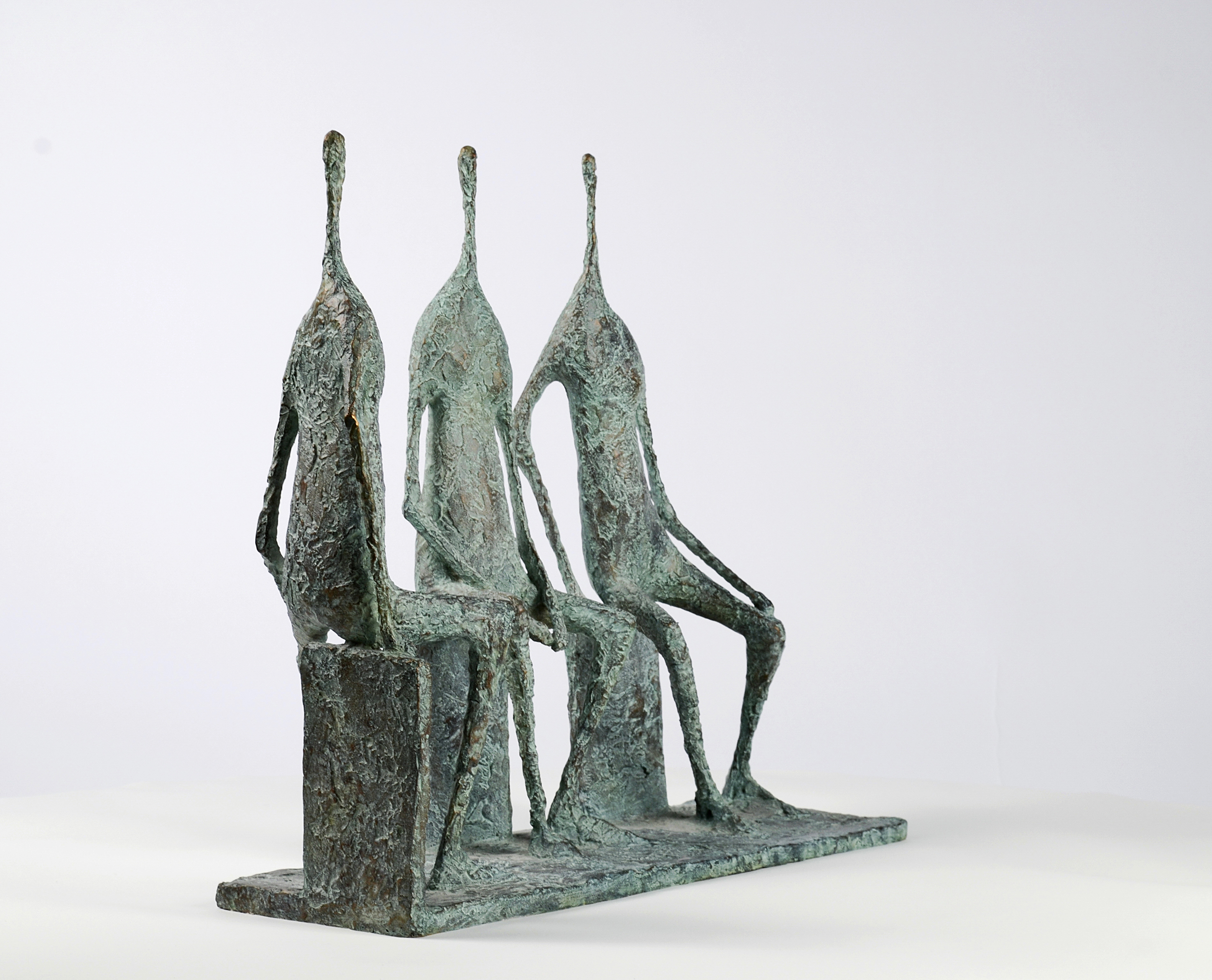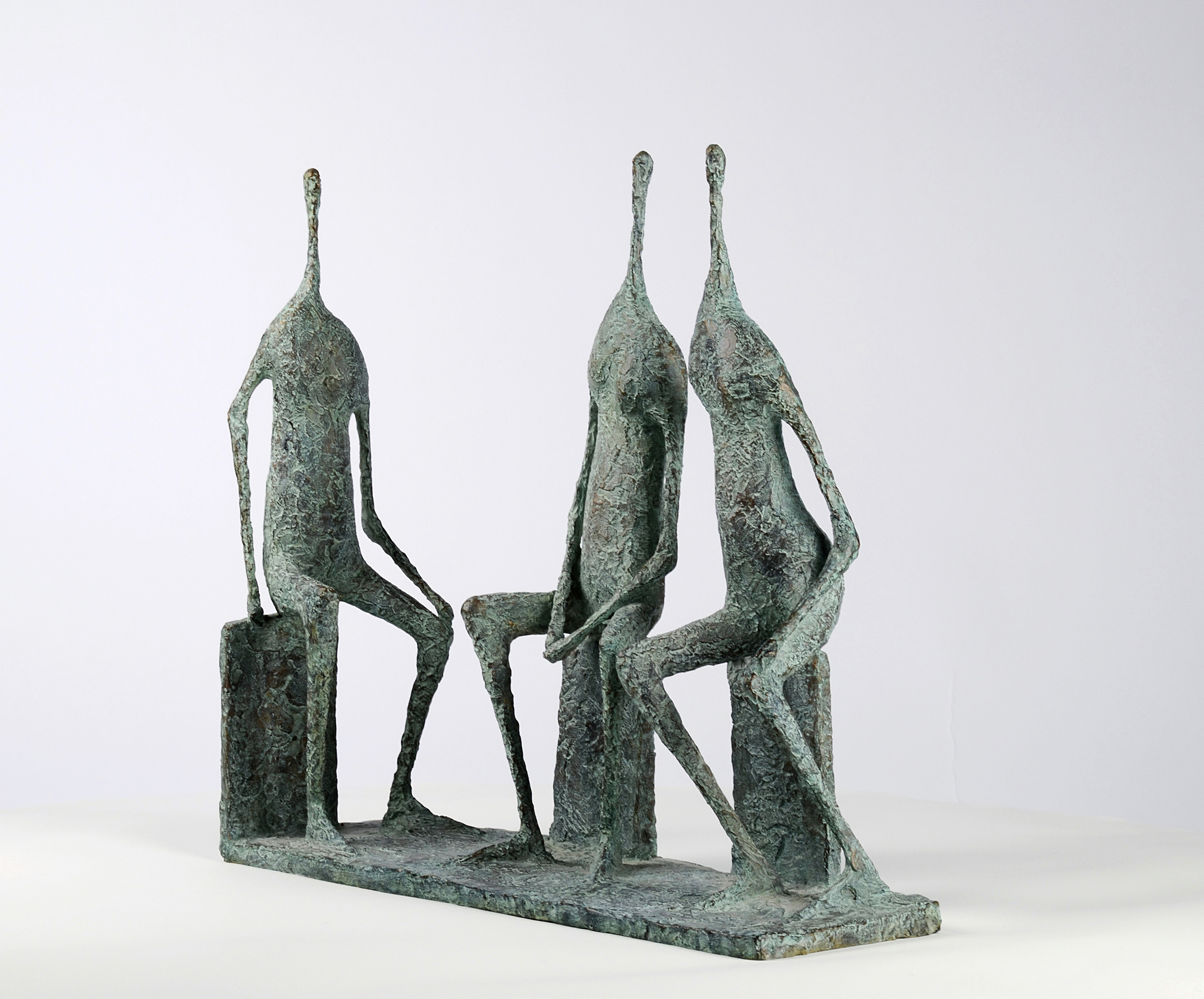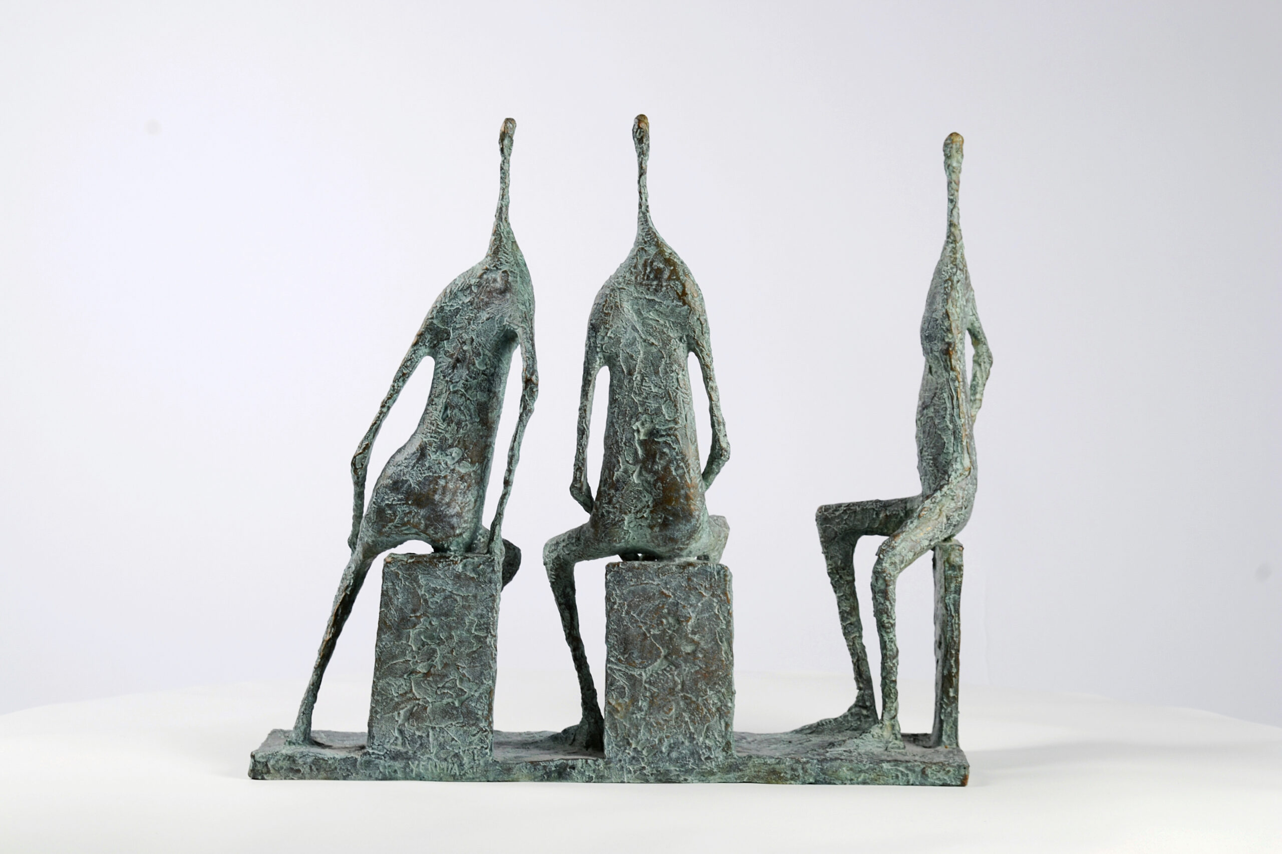 Cette sculpture figurative en bronze représente un groupe de trois personnages assis sur des sièges. L’un d’eux se tient de profil, tandis que les deux autres nous font face. Les corps de ces statues sont élancés, leurs membres longilignes et fragiles contrastent avec leurs torses et bassins plus massifs. Enfin, leurs têtes réduites à l’essentiel sont posées sur de longs cous sveltes et fuselés.