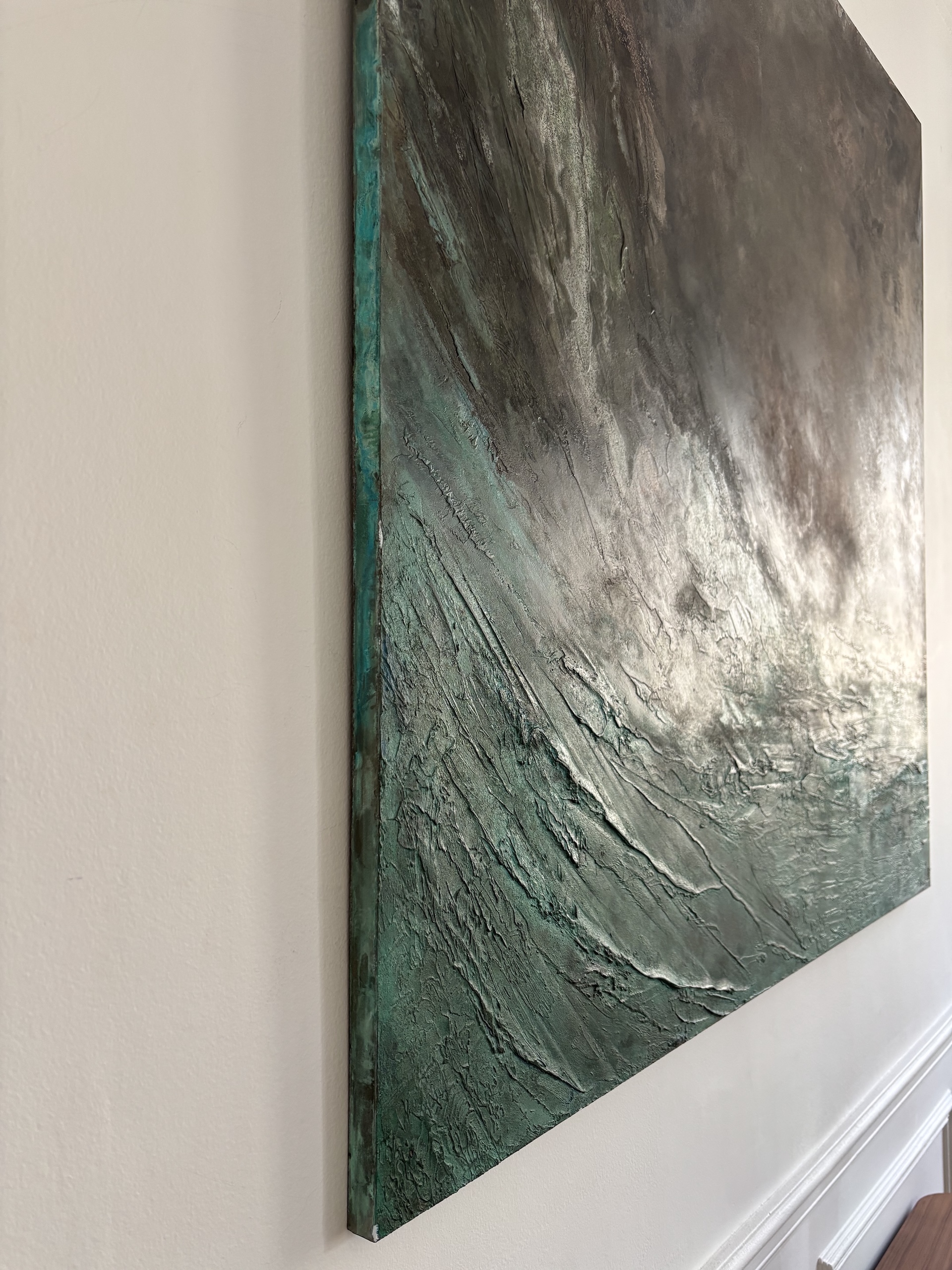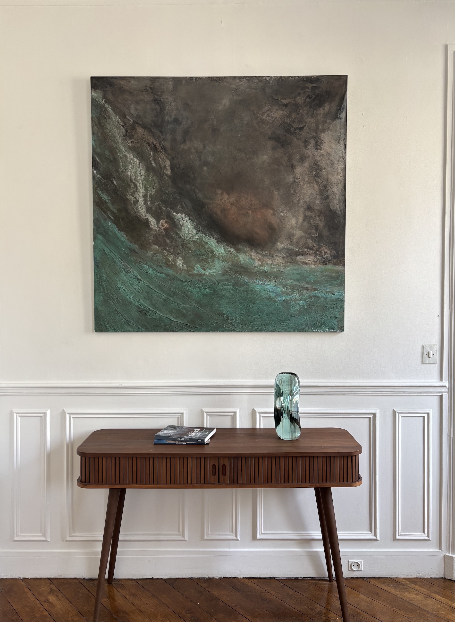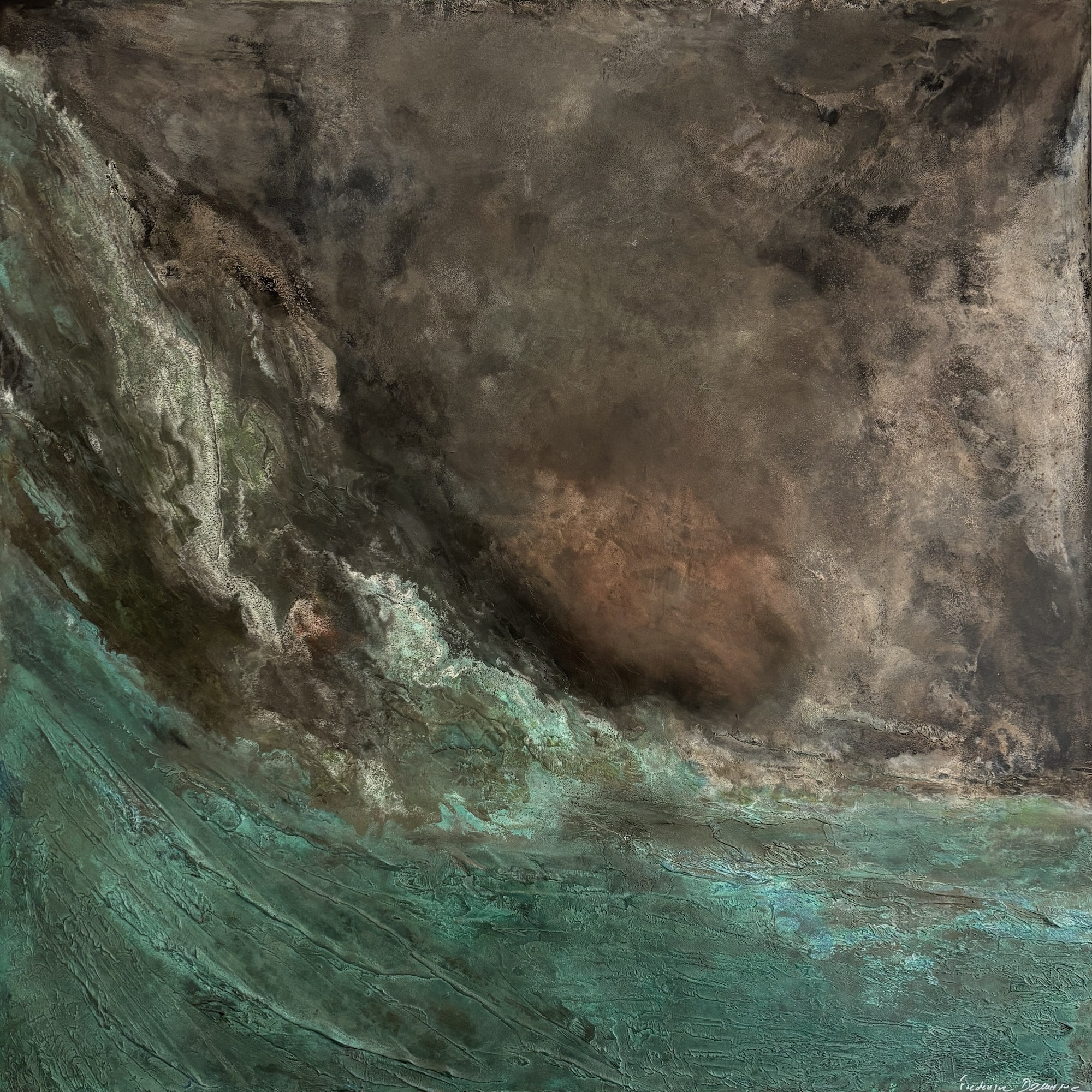 Domergue, profondément inspirée par le monde naturel, en particulier les mers tumultueuses et les paysages primordiaux, évoque dans cette pièce une dynamique puissante et un intense sentiment de mouvement. L’œuvre est dominée par une vaste surface sombre dans la partie supérieure, suggérant un ciel imposant et menaçant, qui contraste de manière dramatique avec la surface turquoise, vibrante et fortement texturée située en dessous. Cette section inférieure capture l’énergie d’un tourbillon ou d’une vague écumante et lumineuse.