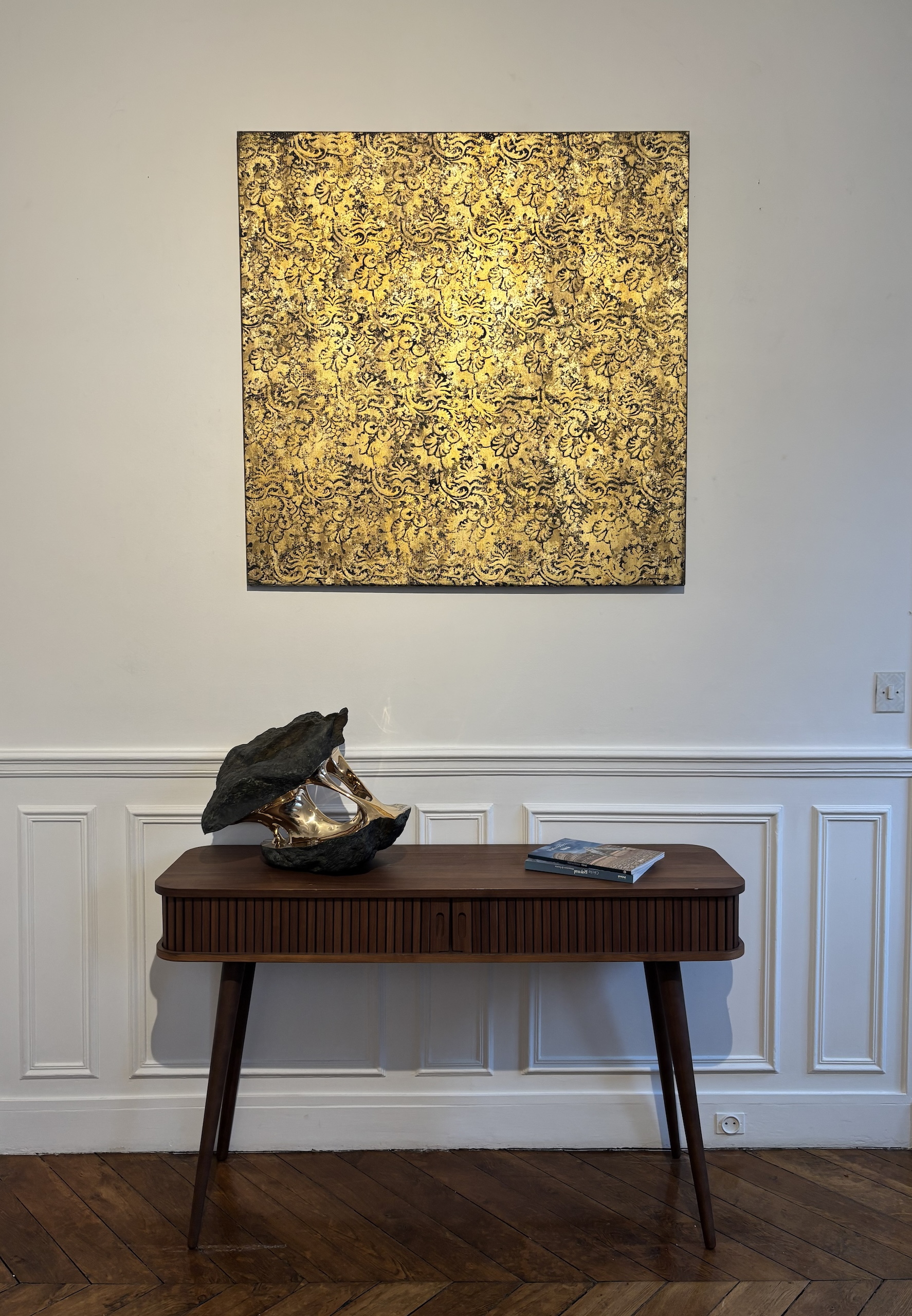 Grâce aux feuilles et aux poudres de métaux, les œuvres de Nicolas Galtier révèlent une multitude de reflets changeants. Les photographies présentent l’œuvre sous deux éclairages différents, naturel et artificiel.