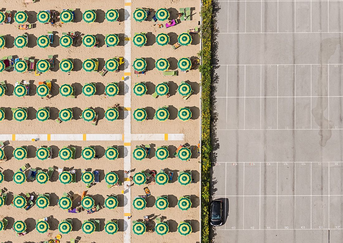 Le photographe nous fait survoler les plages italiennes de la côte adriatique, entre Ravenne à Rimini, en plein été. Entre photographie de paysage et photographie abstraite, cette série illustre parfaitement la démarche de Bernhard Lang : pleinement inscrit dans le domaine de l’art contemporain, son travail cherche à provoquer une réflexion environnementale tout en procurant un plaisir esthétique.