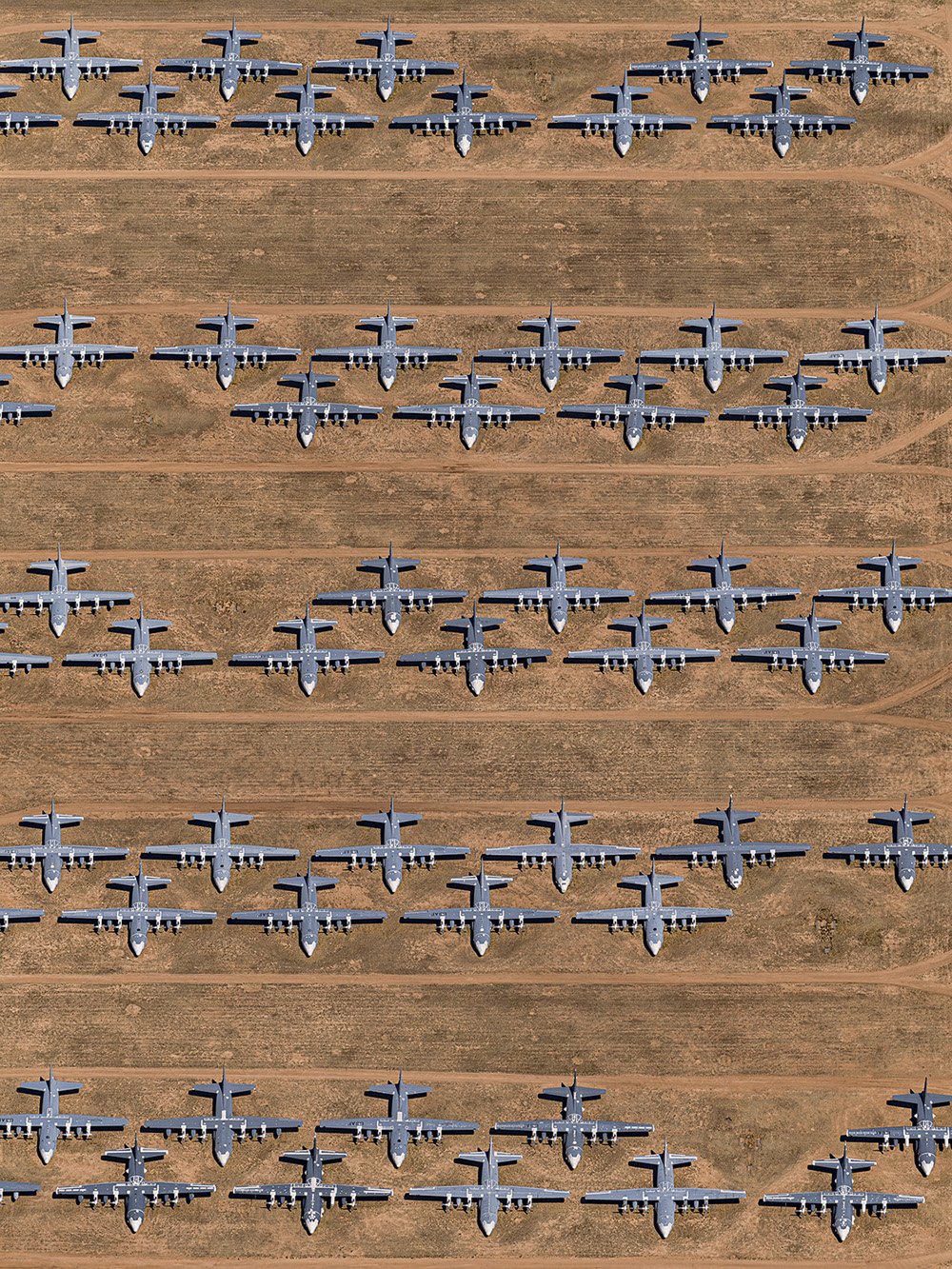 Le photographe nous fait découvrir la base aérienne Davis-Monthan de Tucson, en Arizona, la plus grande installation d’avions et de missiles au monde. Ici, 4000 avions sont hébergés sur 2600 acres de paysage désertique, particulièrement adapté pour le stockage grâce au taux d’humidité très bas, qui limite la corrosion du métal, et au sol très dur, qui empêche même les avions les plus géants de s’enfoncer. Des cargos, des bombardiers, des avions de chasse ainsi que des avions commerciaux et civils sont parfaitement rangés et regroupés au sol par modèle ; certains seront recyclés, d’autres abandonnés, d’autres encore pourraient reprendre le vol. Les photographies de ce cimetière d’avions, caractérisées par des symétries très marquées, sont impressionnantes.