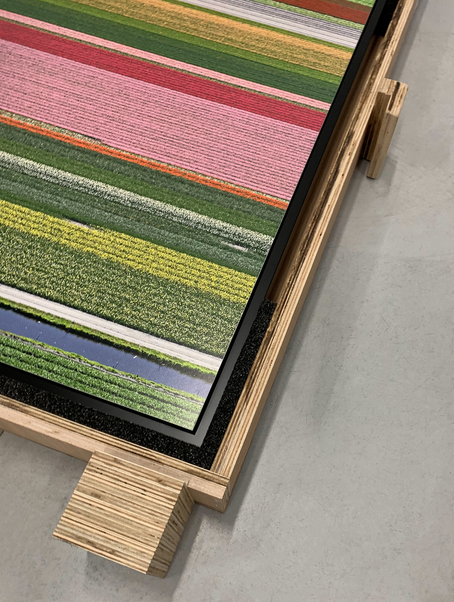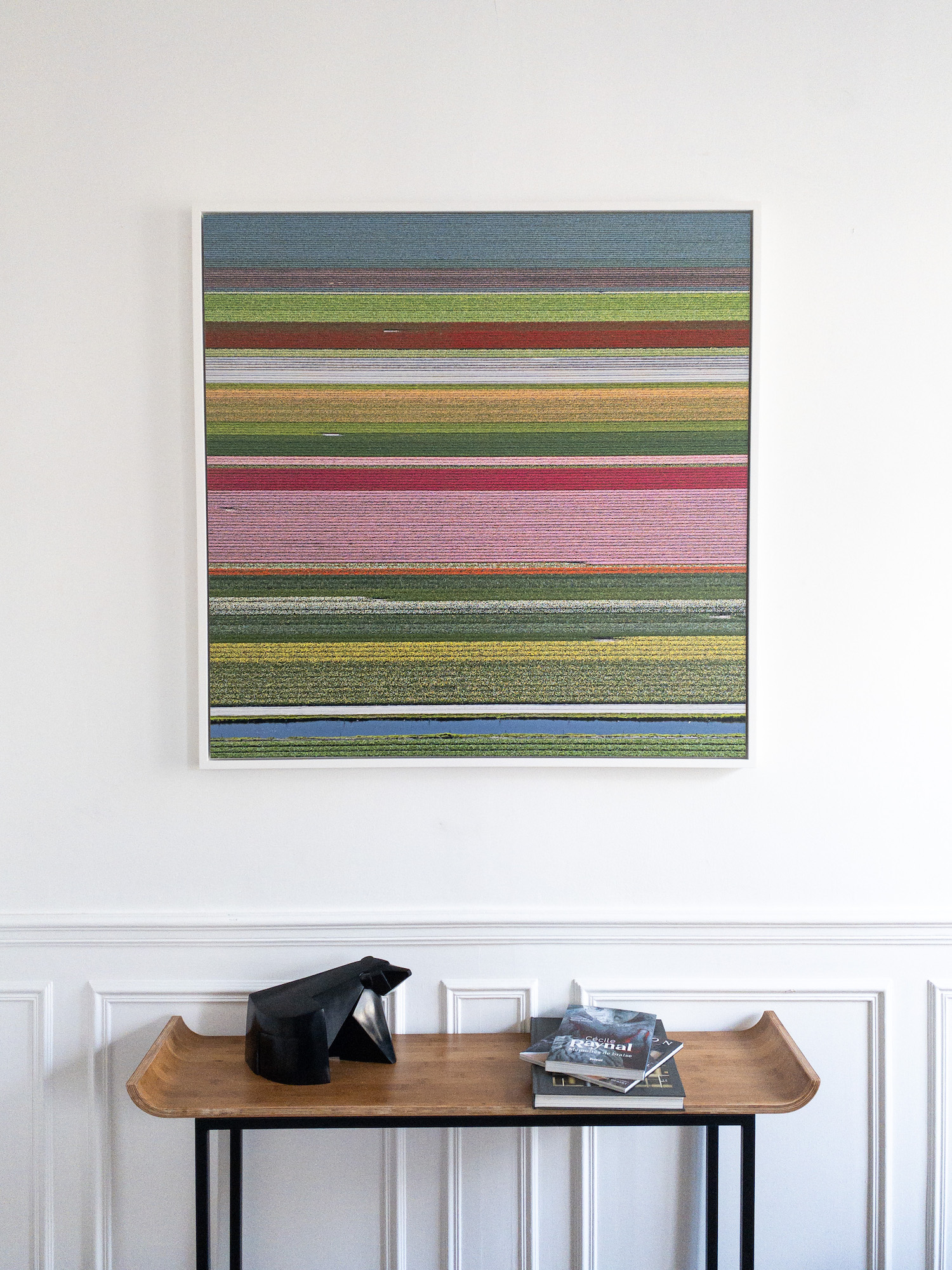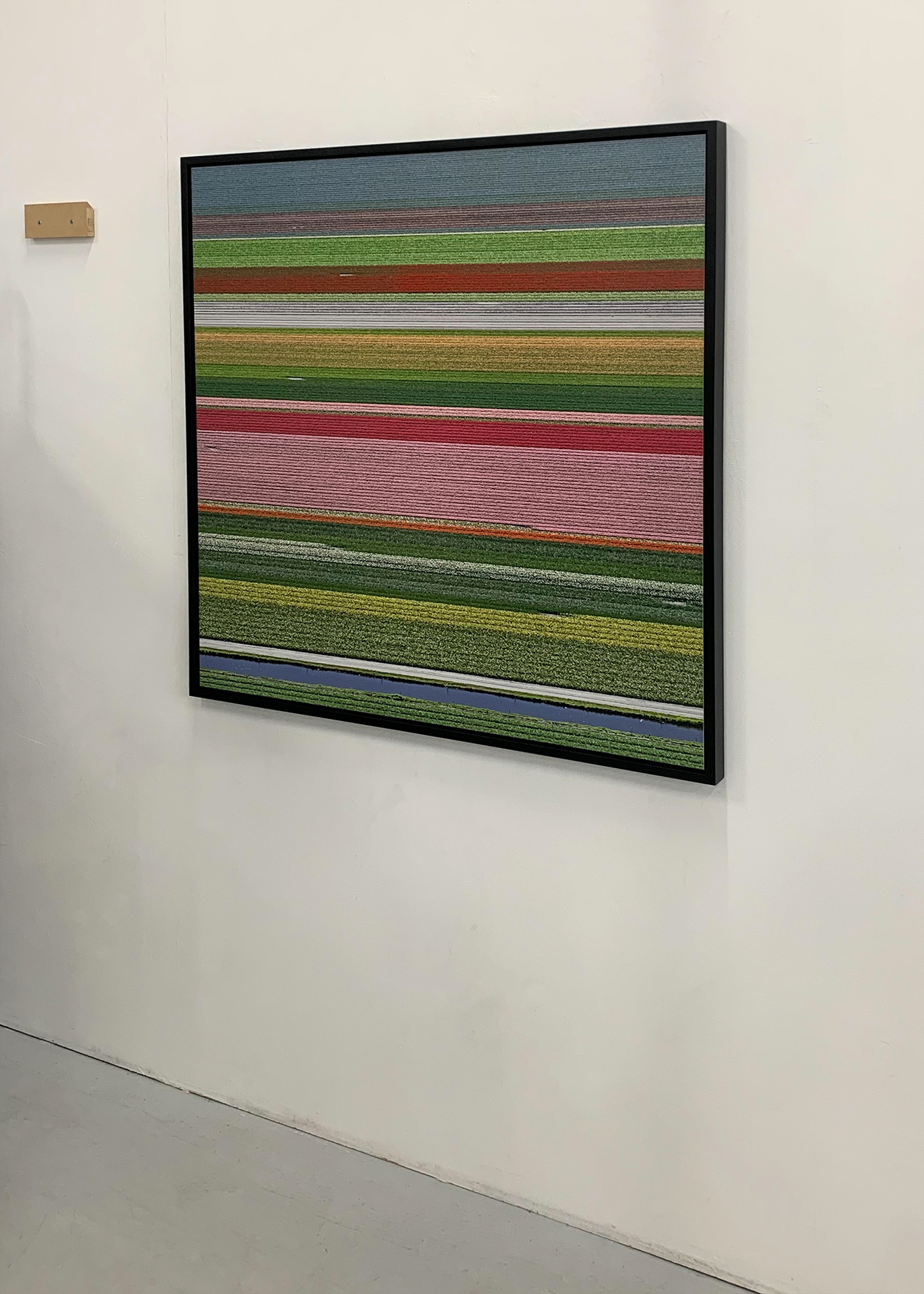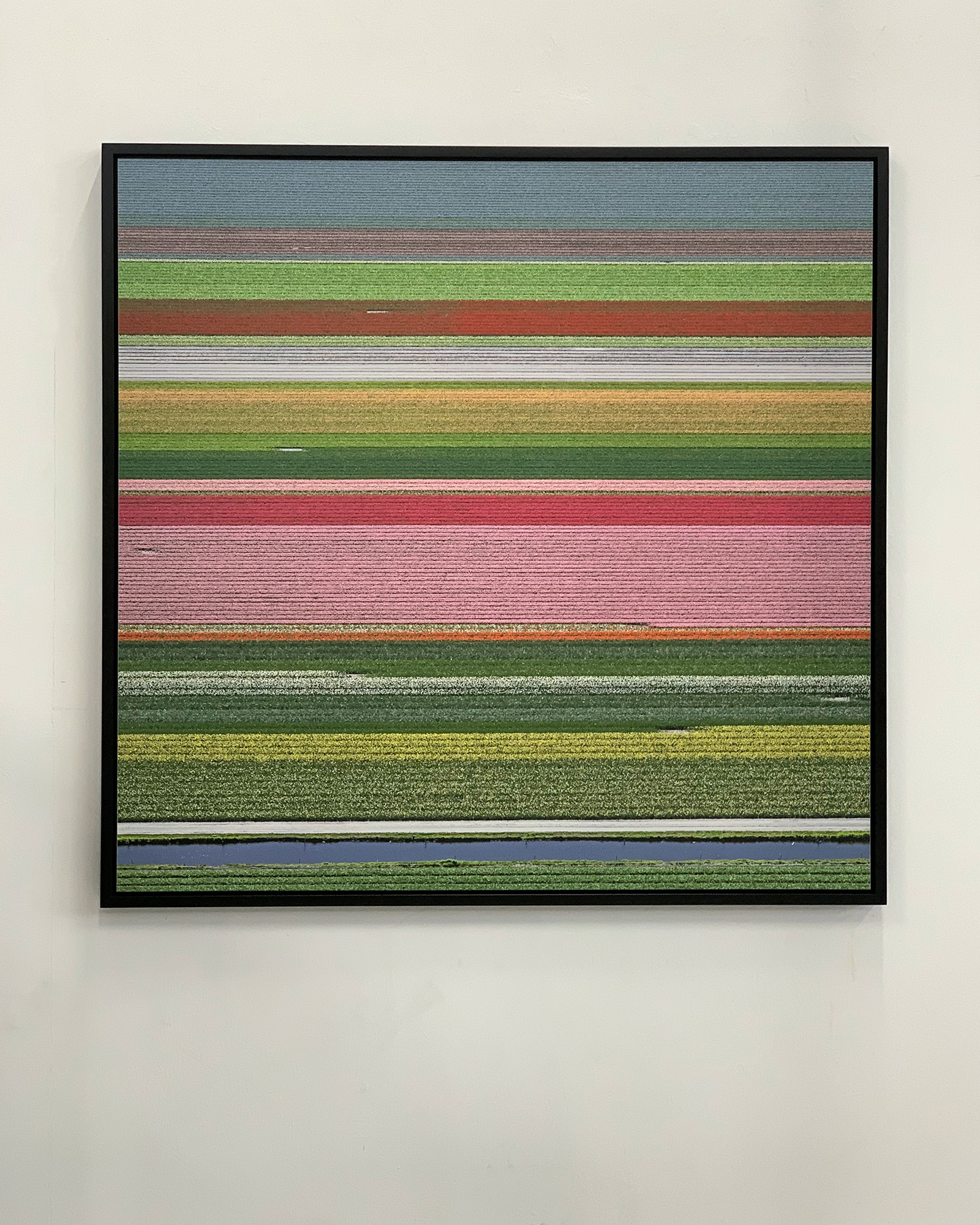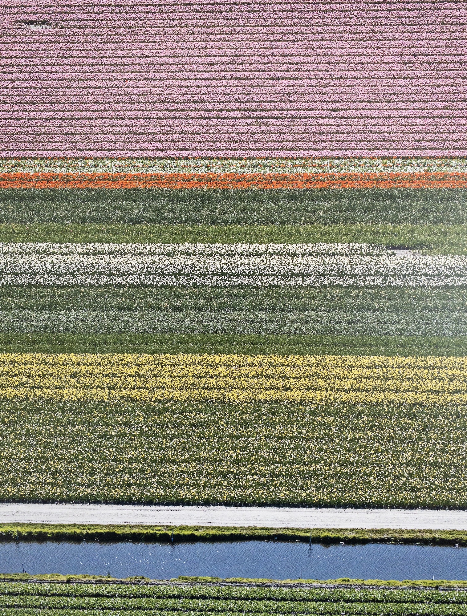 Le photographe nous fait survoler les champs de tulipes des Pays-Bas au printemps, lorsque les fleurs, cultivées à grande échelle, dessinent des tapis géants, graphiques et multicolores. Vu du ciel, ce spectacle éphémère évoque les tableaux du peintre américain Frank Stella.