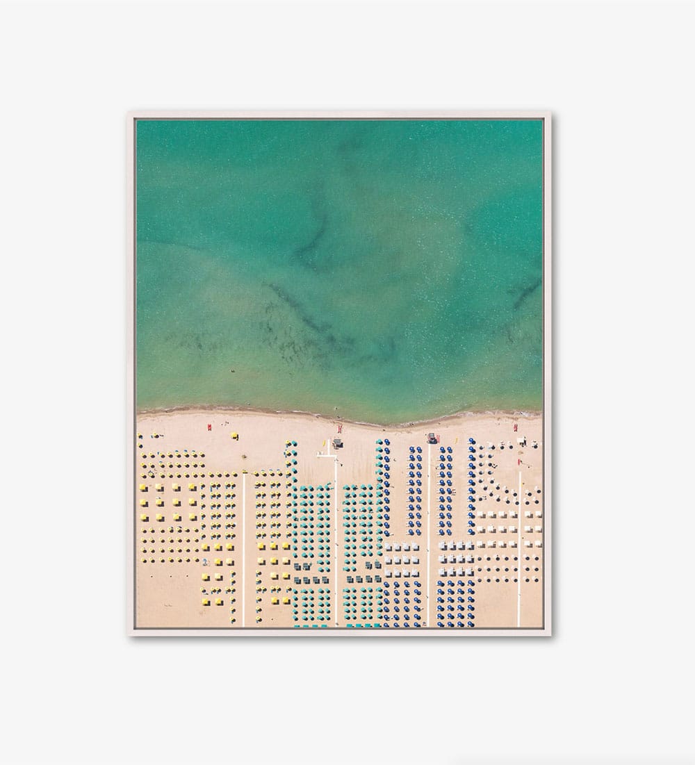 Depuis 2010, l’artiste se consacre à la photographie aérienne. Il parcourt le monde à la recherche de paysages singuliers visiblement impactés par l’homme, comme c’est le cas ici avec le tourisme de masse en été. Vus du ciel, ces panoramas ressemblent presque à des tableaux abstraits. Cette œuvre est issue de la série ‘’Versilia’’ réalisée au-dessus des côtes italiennes, une partie de la province de Lucques, dans le nord-ouest de la Toscane.