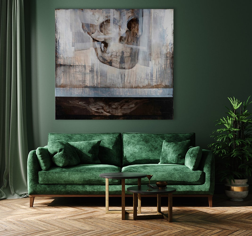 Cette peinture sur toile représente un crâne sur lequel des figures géométriques, brunes et blanches viennent se superposer. Sous cette figure parfaitement maitrisée, l’artiste semble avoir laissé la peinture s’écouler librement, offrant à cette vanité un environnement sombre et inquiétant, qui prolonge sa symbolique puisque la toile paraît se dégrader sous les effets du temps.