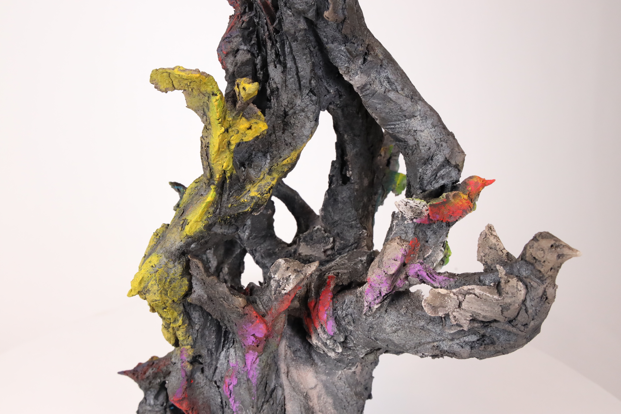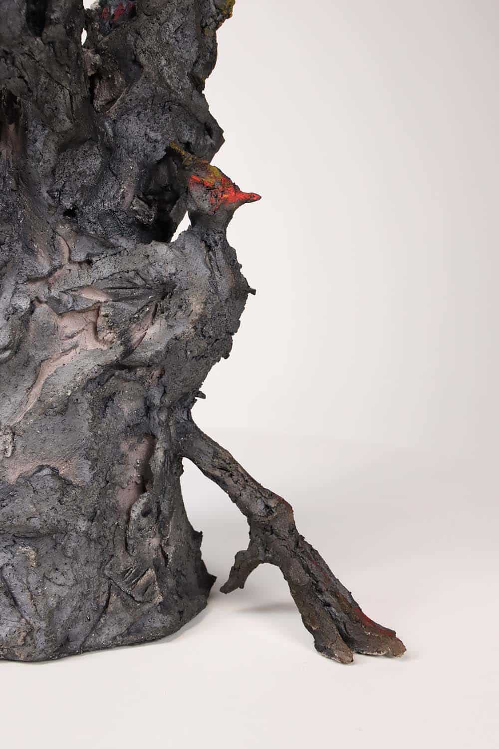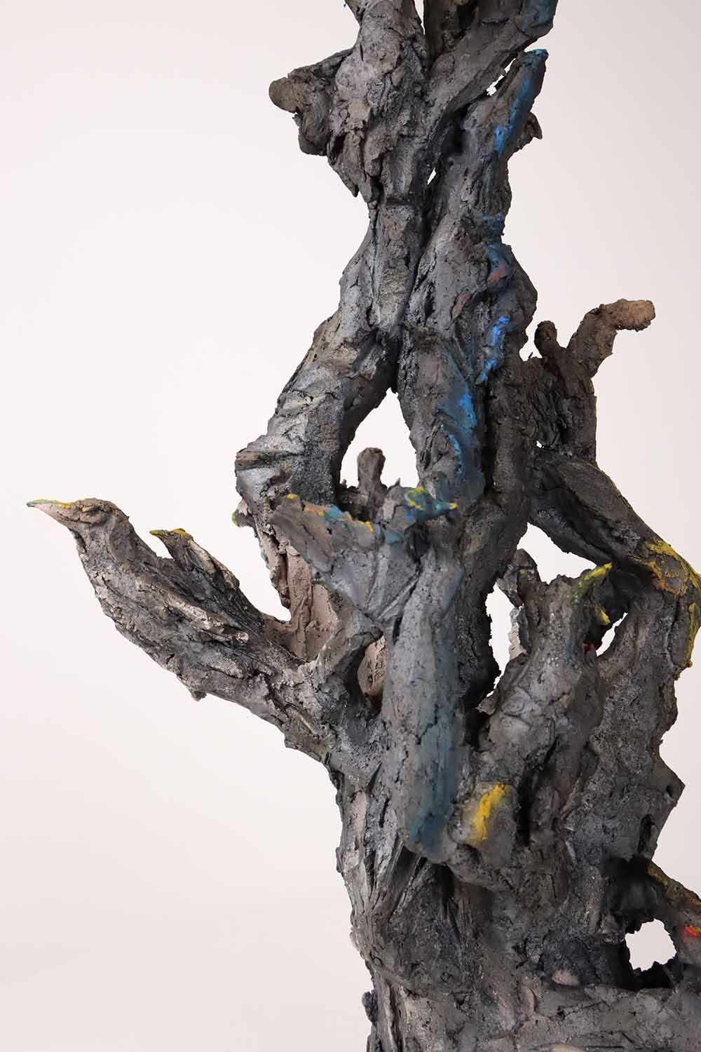Cette sculpture à la portée narrative très dense représente un arbre peuplé de plusieurs types d’éléments perchés sur les branches. On peut y apercevoir des oiseaux, un loup, un lièvre ou même une main. Au cours des dernières années, les animaux ont pris une place de plus en plus importante dans la production de l’artiste : « Toutes sortes de bêtes et de formes hybrides peuplent mon travail. Des chimères, construites par « affinités électives » entre figure animale et humaine. » (Mémoires de braise, de Cécile Raynal. Editions Privat, 2018). Toutefois, l’introduction de l’univers végétal dans ses sculptures à travers la représentation d’arbres ou la ‘végétalisation’ de figures humaines et animales avec des branches, est encore plus récente et protagoniste dans cette œuvre.