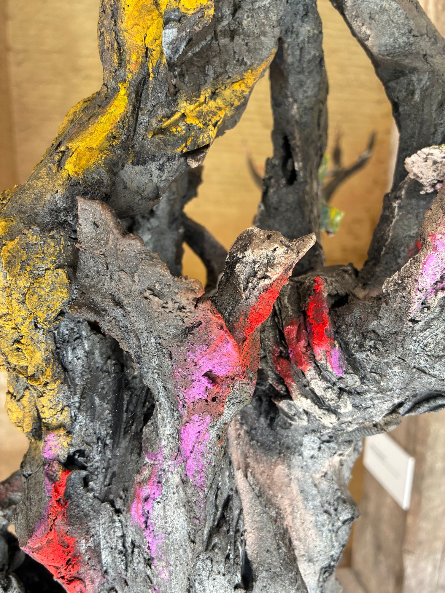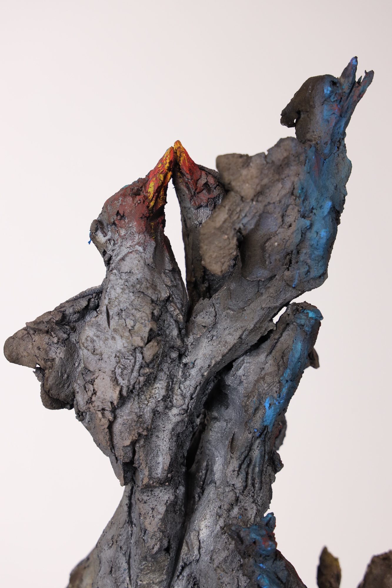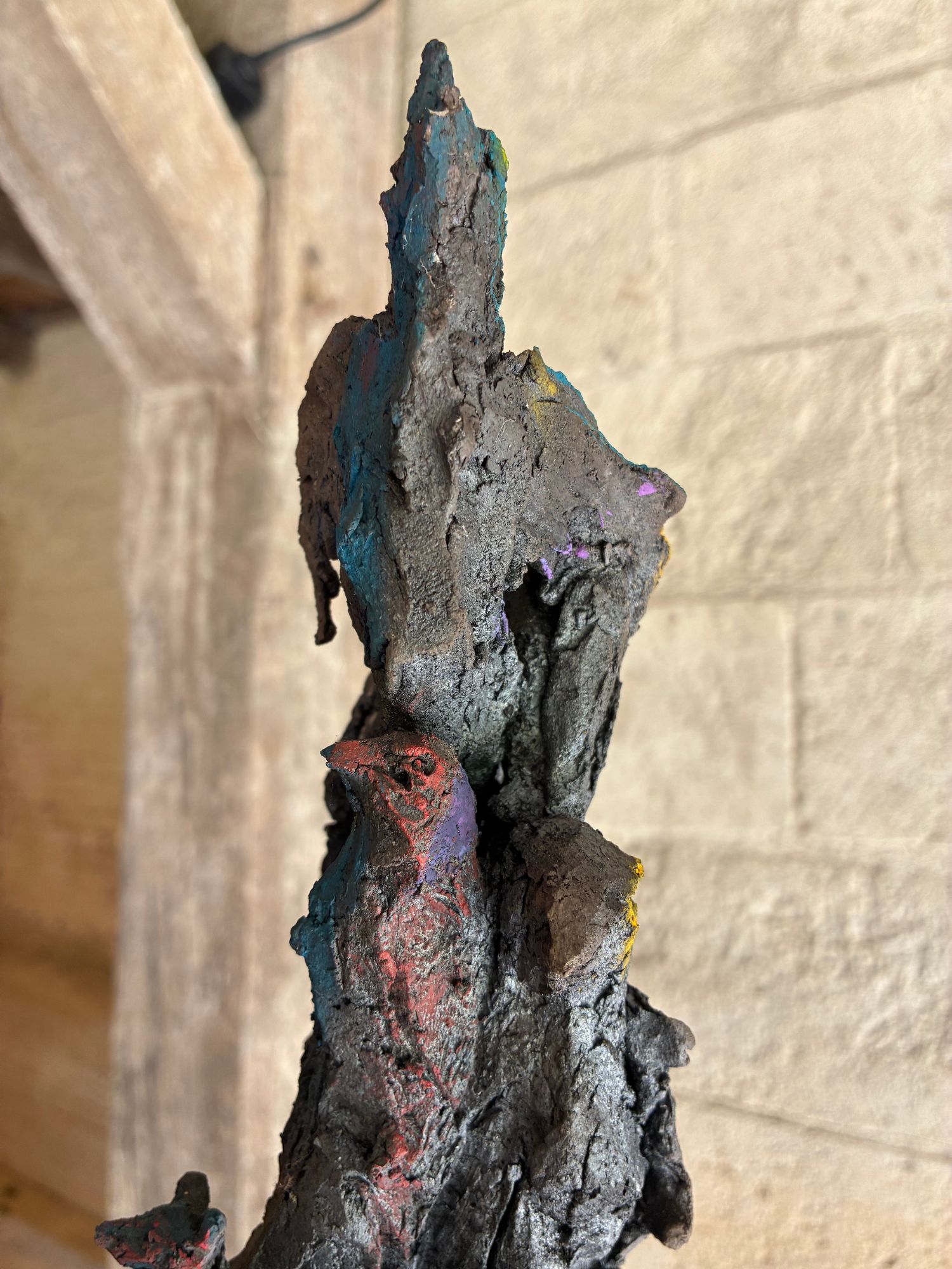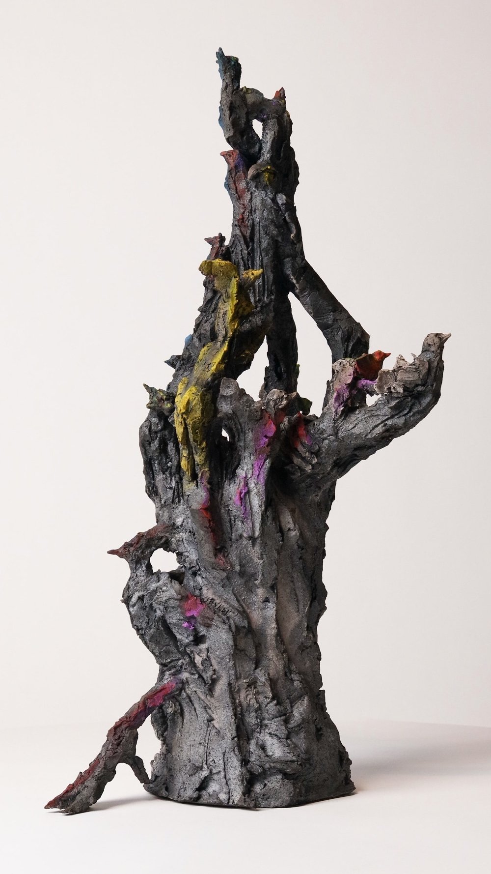 Cette sculpture à la portée narrative très dense représente un arbre peuplé de plusieurs types d’éléments perchés sur les branches. On peut y apercevoir des oiseaux, un loup, un lièvre ou même une main. Au cours des dernières années, les animaux ont pris une place de plus en plus importante dans la production de l’artiste : « Toutes sortes de bêtes et de formes hybrides peuplent mon travail. Des chimères, construites par « affinités électives » entre figure animale et humaine. » (Mémoires de braise, de Cécile Raynal. Editions Privat, 2018). Toutefois, l’introduction de l’univers végétal dans ses sculptures à travers la représentation d’arbres ou la ‘végétalisation’ de figures humaines et animales avec des branches, est encore plus récente et protagoniste dans cette œuvre.