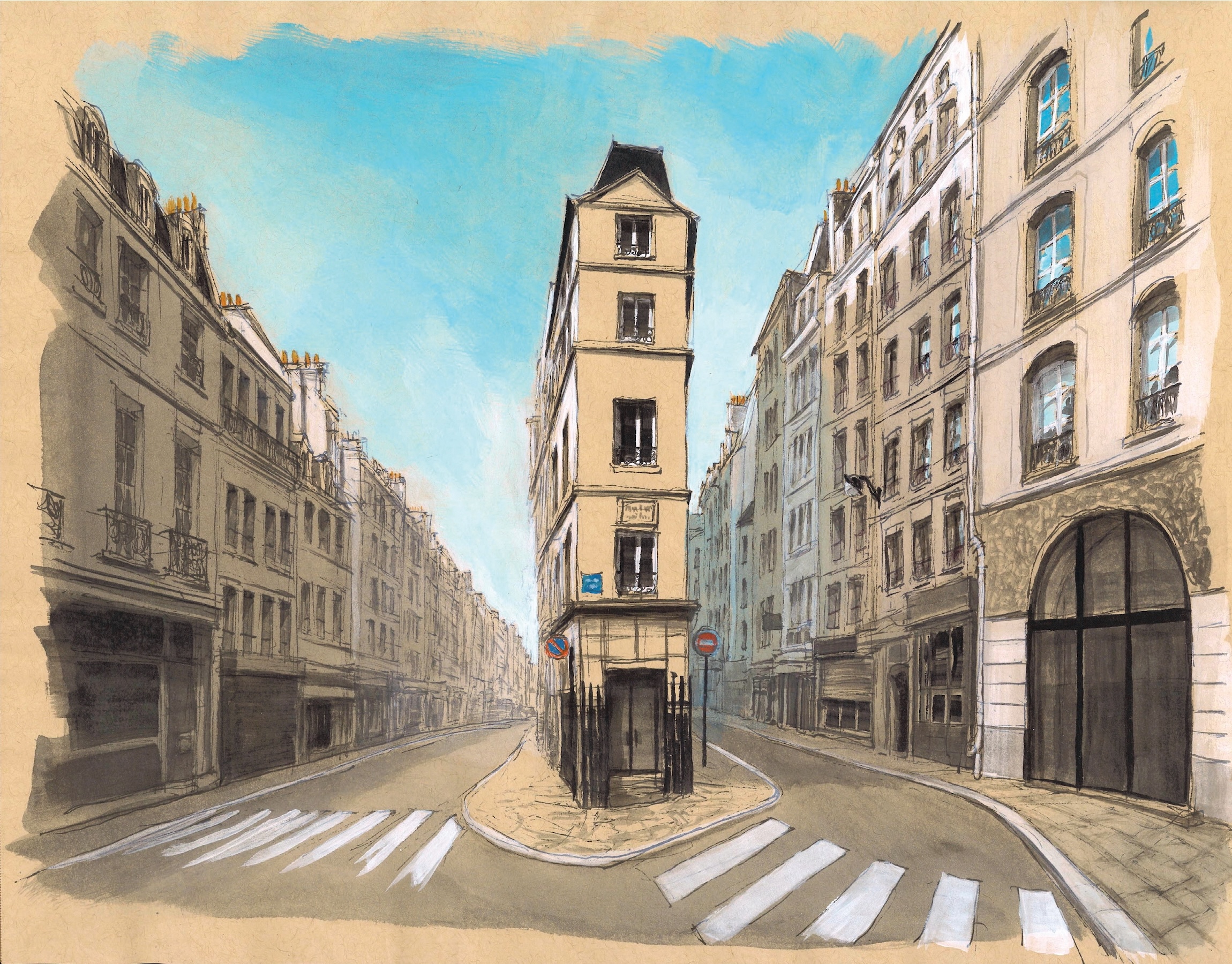 ArchiParis – La Pointe Trigano est un dessin de l’artiste contemporain français Guillaume Chansarel. Ce dessin représente le bâtiment d’habitation le plus étroit de Paris. La perspective du dessin met en valeur le caractère unique de ce lieu. Les bâtiments de cette rue typiquement parisienne sont représentés avec délicatesse et précision. Le ciel bleu clair met en valeur l’immeuble central très étroit, et la vue en contre-plongée accentue cette particularité.