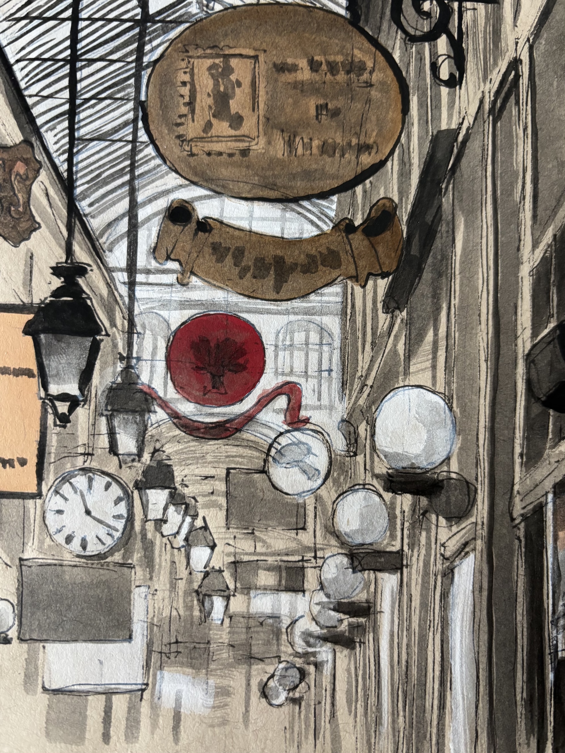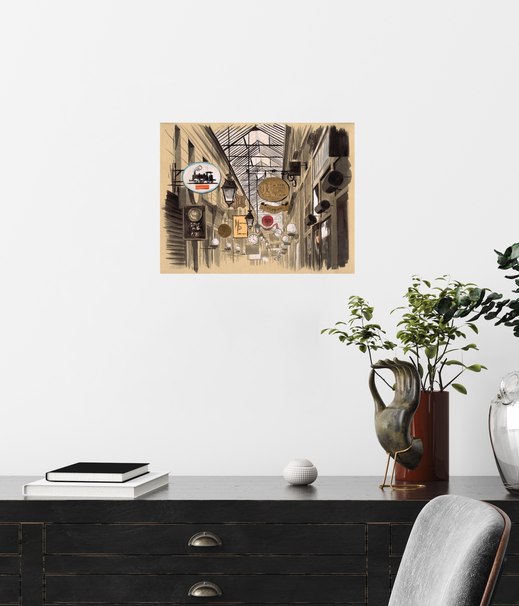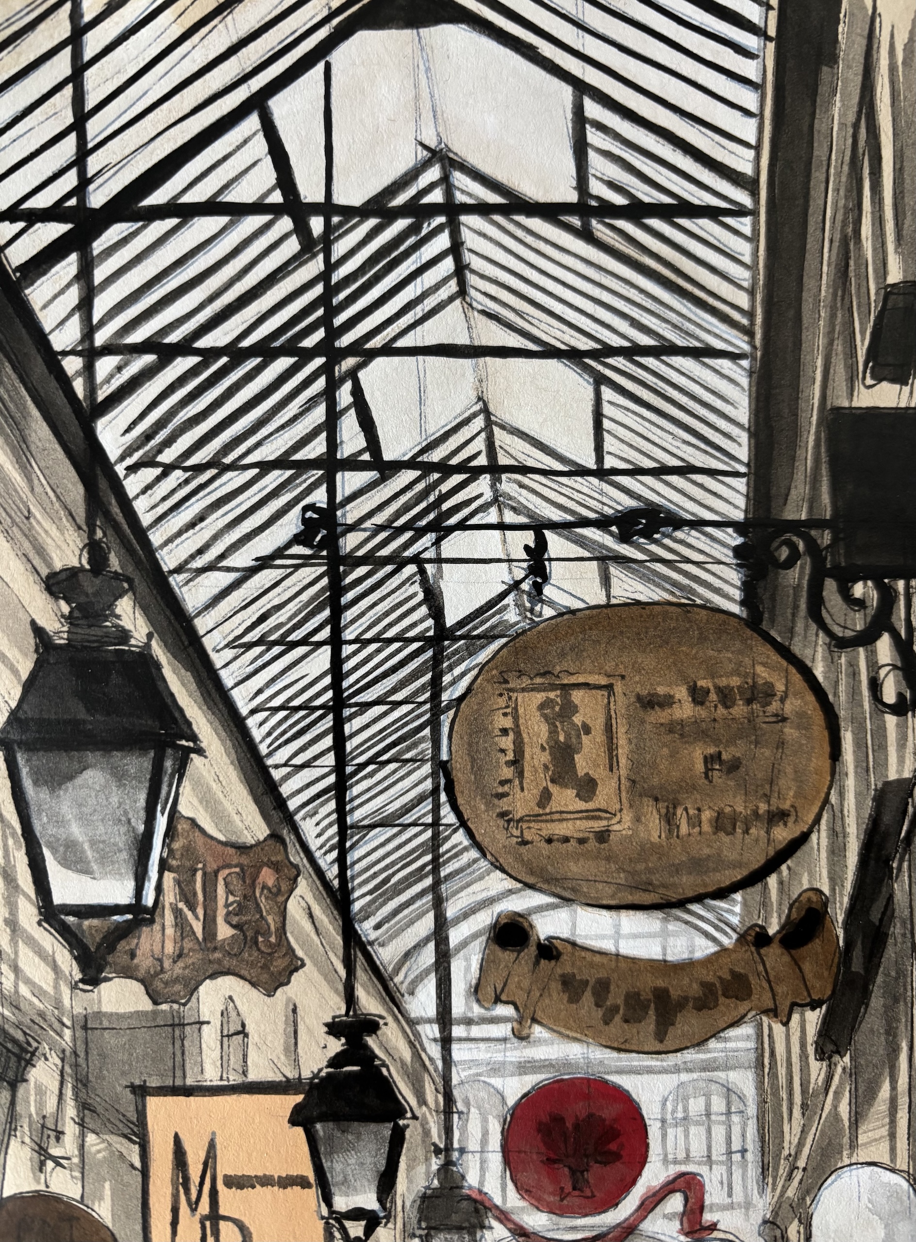 ArchiParis – Passage des Panoramas est un dessin de l’artiste français contemporain Guillaume Chansarel. Ce dessin représente le Passage des Panoramas, le plus ancien des passages couverts de Paris, situé dans le 2e arrondissement. La composition met l’accent sur les enseignes des boutiques et sur l’effervescence commerciale inhérente à ce lieu, tout en conservant son charme d’antan. La lumière inonde l’espace à travers la grande fenêtre située au-dessus. Tous ces éléments sont disposés avec délicatesse, précision et équilibre esthétique dans l’espace du dessin.