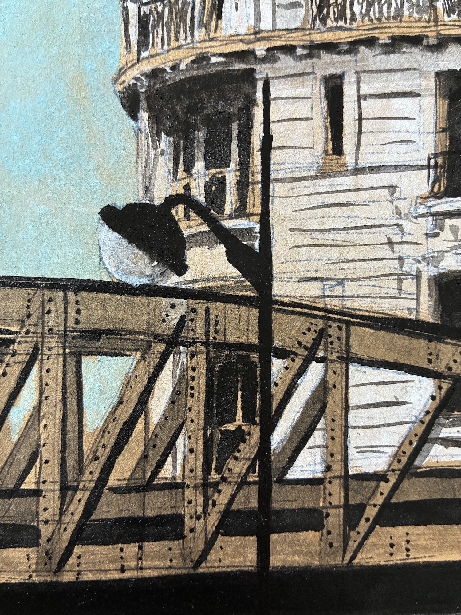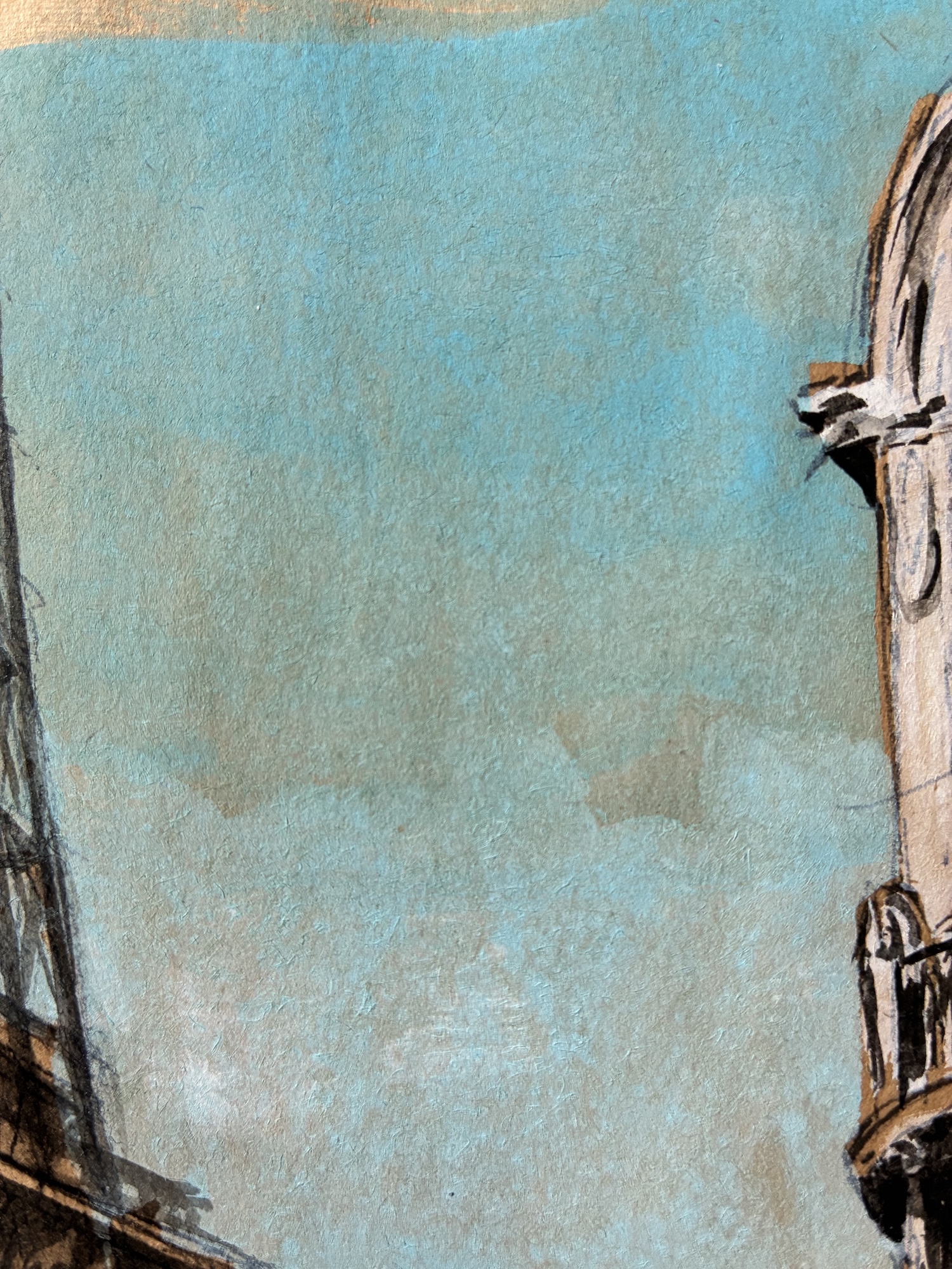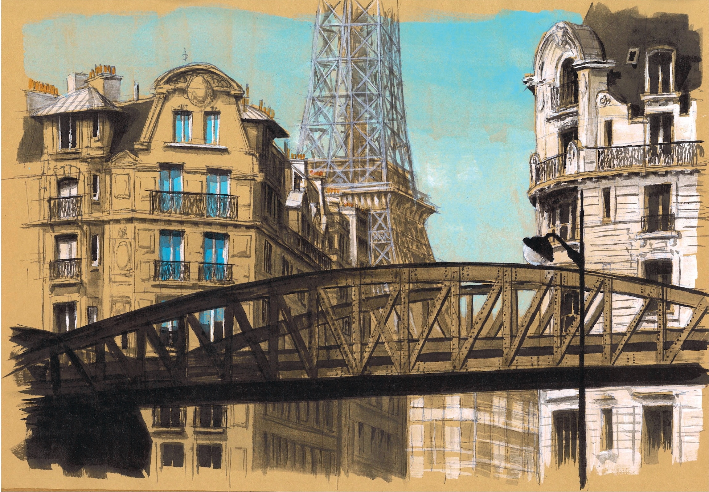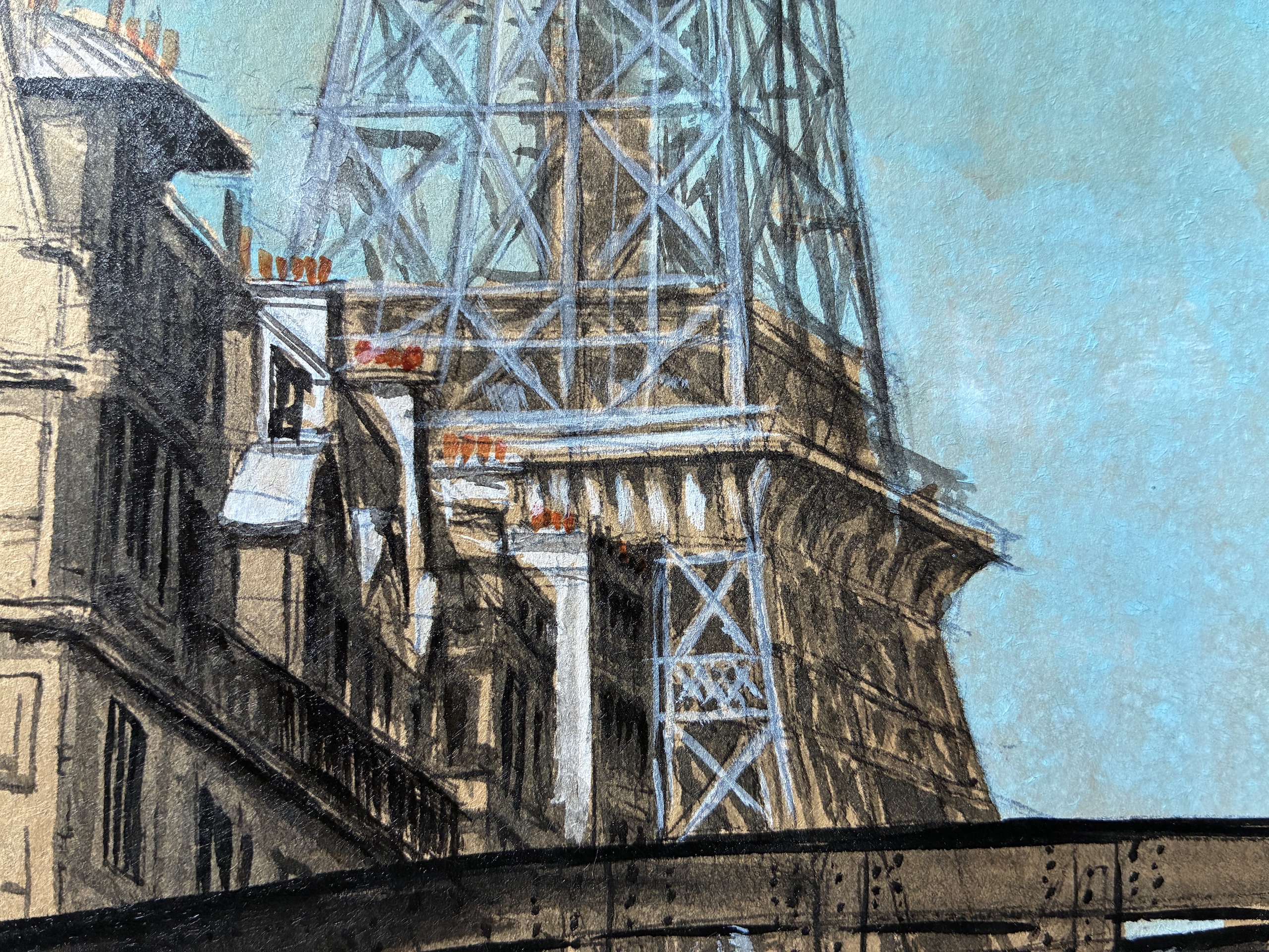 Ce dessin fait partie d’un projet artistique plus vaste consacré à Paris, dans le cadre duquel l’artiste a réalisé 104 dessins représentant divers lieux de la ville. Ces œuvres sont compilées dans un livre d’artiste intitulé ArchiParis, présenté en cinq volumes. Chaque volume explore une sélection de lettres de l’alphabet, chaque lettre étant liée à un mot-clé qui sert d’inspiration aux dessins. Par exemple, la lettre A correspond à « arrivée », représentant les différentes façons d’entrer dans Paris – par avion, par bateau, par train ou par la route. La lettre G est associée à « galerie », mettant en scène les tunnels et les passages. Ce dessin de la Tour Eiffel se trouve sous la lettre I, associé au mot « indéboulonnable ». ArchiParis emmène le lecteur dans une promenade parisienne, une exploration urbaine singulière à travers le regard de l’artiste. Cette série de dessins vise à présenter et révéler Paris sous un angle original : celui d’un véritable Parisien.