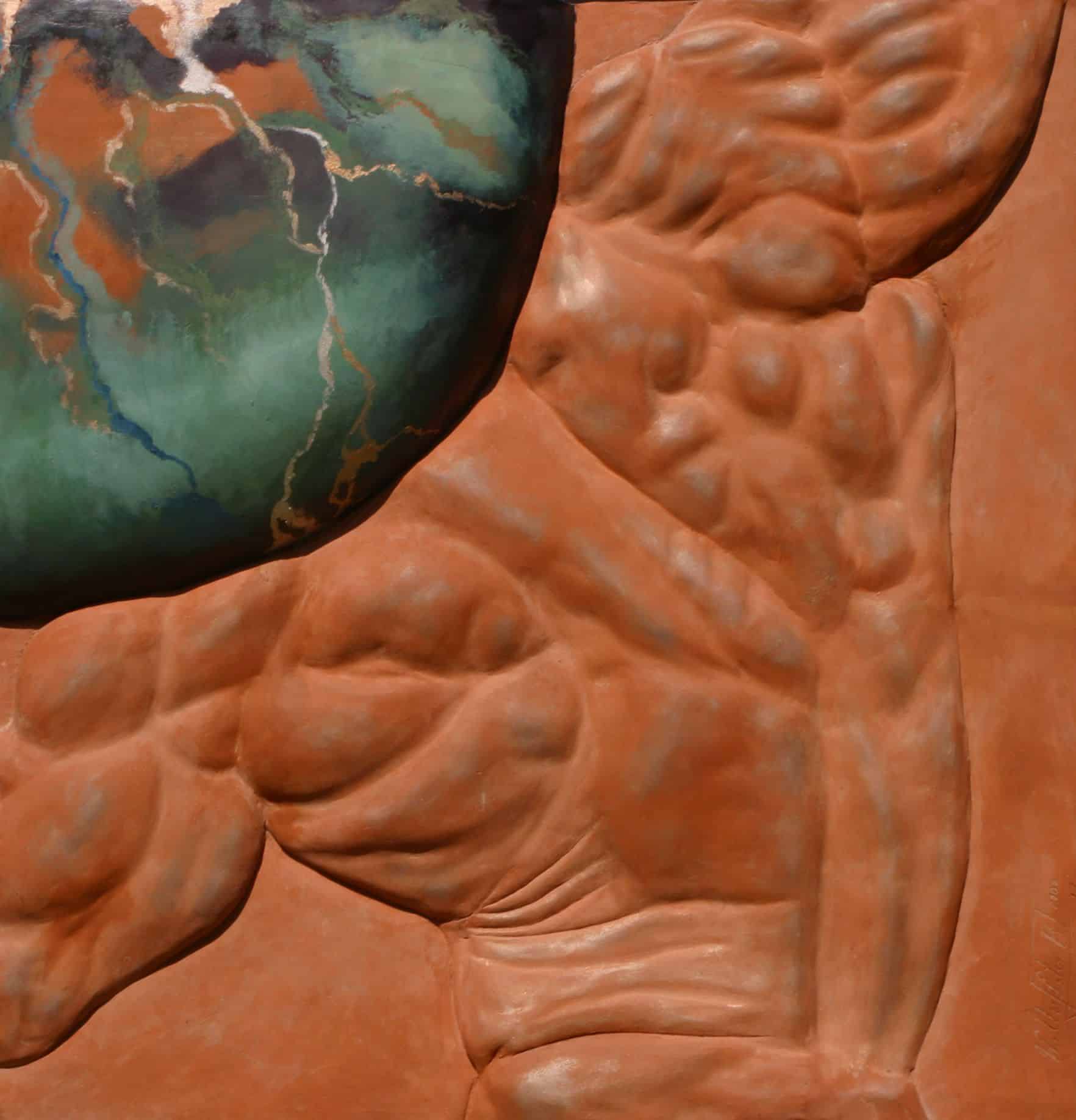 Atlas Relief est un bas-relief carré en terre cuite de l’artiste contemporain guatémaltèque Walter Peter Brenner. Il représente le dos d’un homme incliné sur sa gauche qui semble porter une masse sphérique sur ses épaules. La contraction de ses muscles, particulièrement saillants, donne la mesure de son effort.