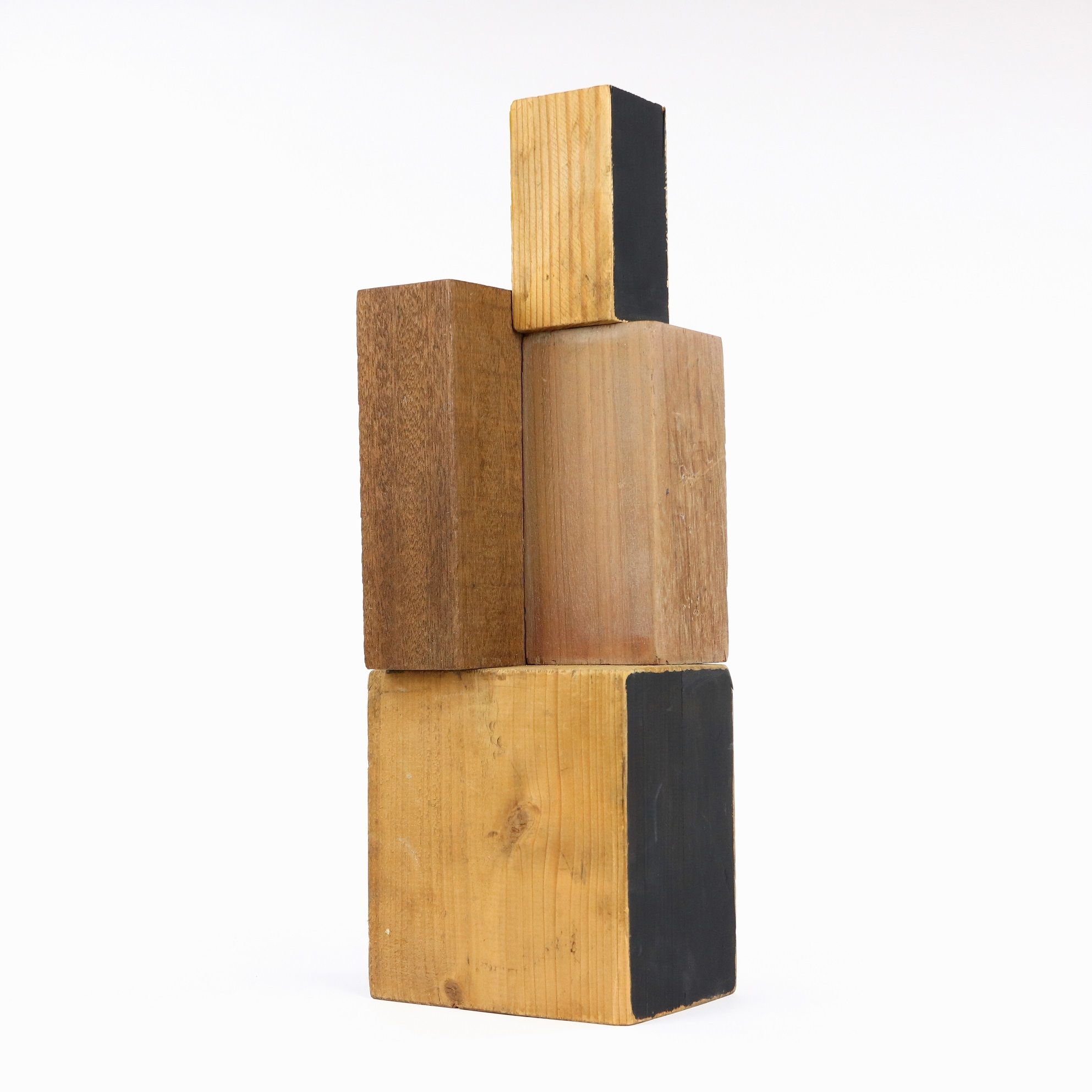 Dans cette série, l’artiste élabore des pièces aux formes géométriques en associant différents volumes à angles droits, dans une alternance entre formes verticales et formes horizontales, pleins et vides. L’assemblage de ces éléments crée de nouveaux volumes qui évoquent parfois certaines réalisations de l’architecture moderne et rationaliste. Dans cette sculpture les couleurs noir et jaune dialoguent en créant de forts contrastes ; le bois, matériel rare dans la production de l’artiste, ressort également de manière importante dans la composition.