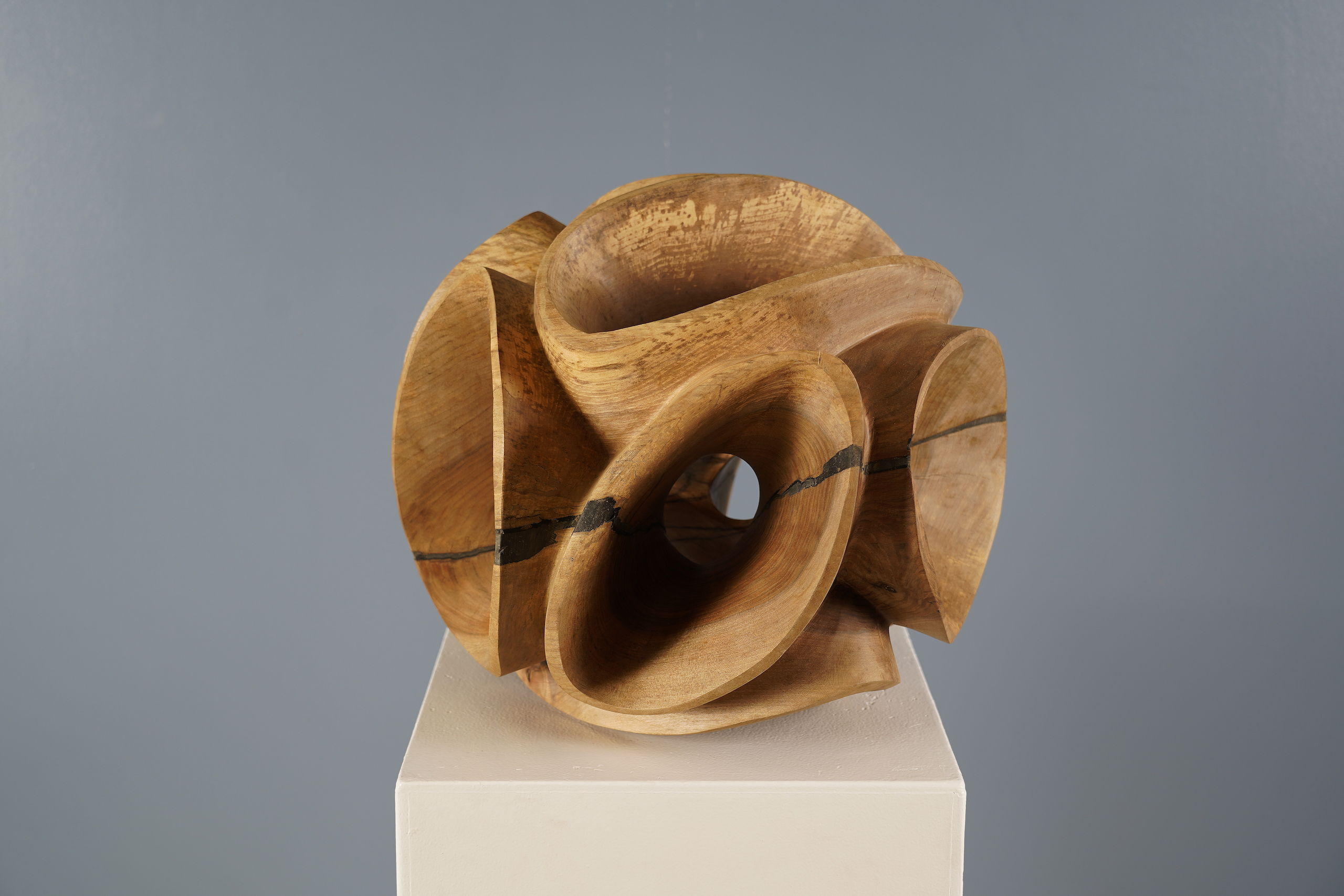 Cette sculpture est réalisée en bois, le matériau que l’artiste privilégie pour son côté naturel, sa texture, son odeur, et la sensation qu’il procure au toucher. Le sculpteur utilise exclusivement des essences de bois locales et les choisit sur la base de leur taille, dans laquelle réside le potentiel sculptural. L’artiste approche cette matière vivante avec beaucoup de respect : il impose sa volonté sur la matière pour la sculpter mais, en même temps, c’est le bois aussi qui dirige son travail avec ses imperfections, ses formes, ses nœuds, ses morceaux noircis.
