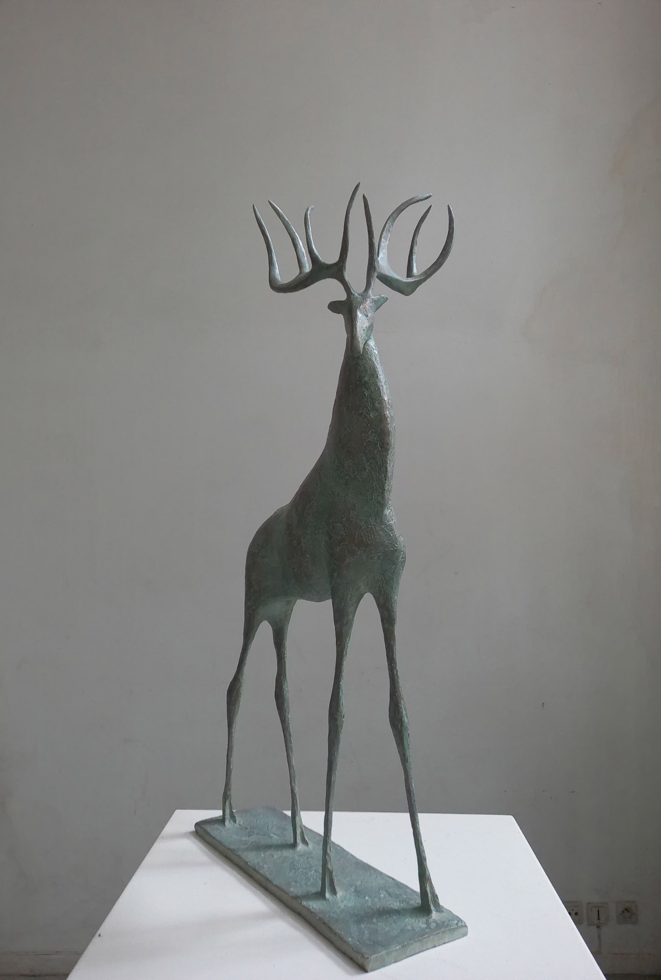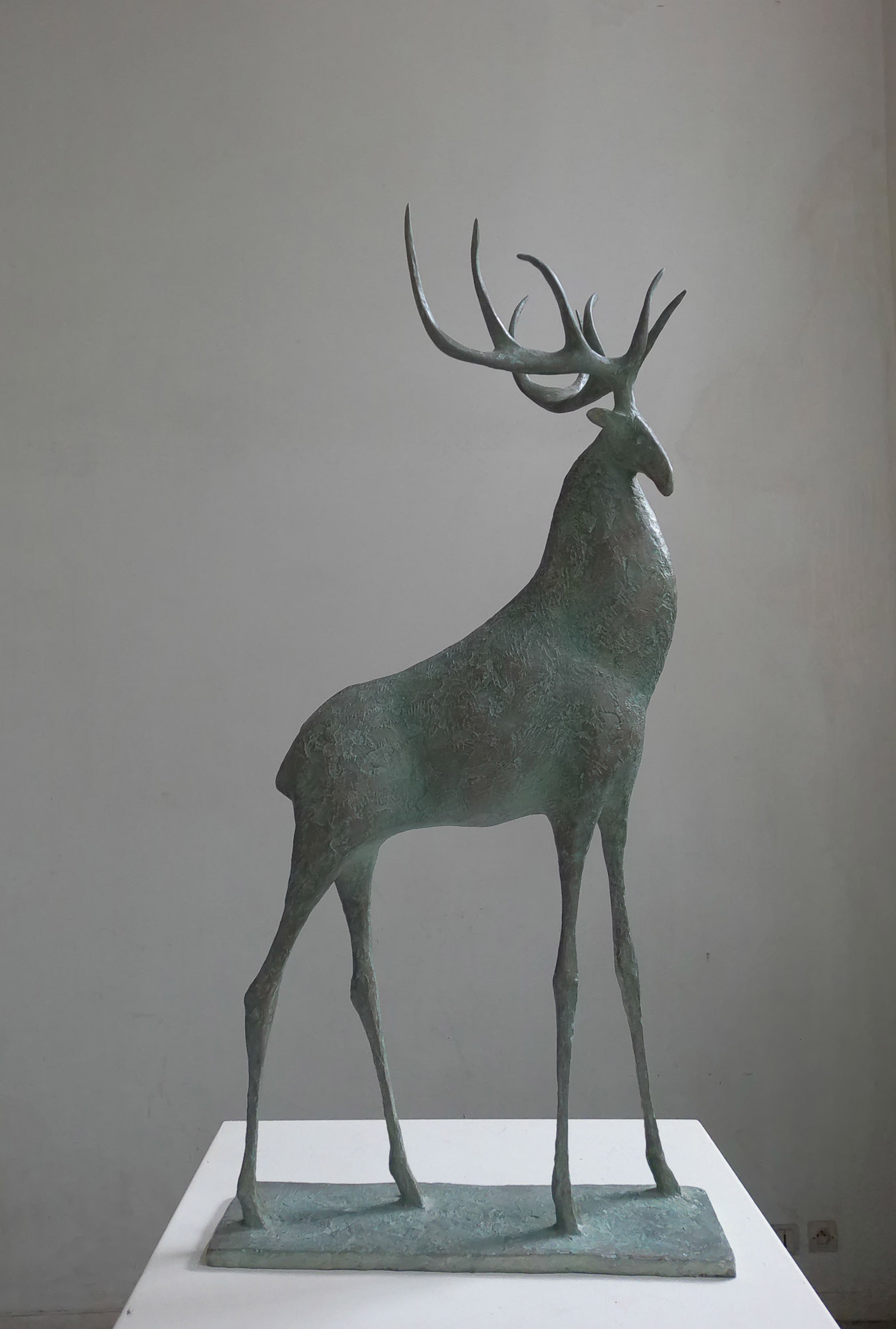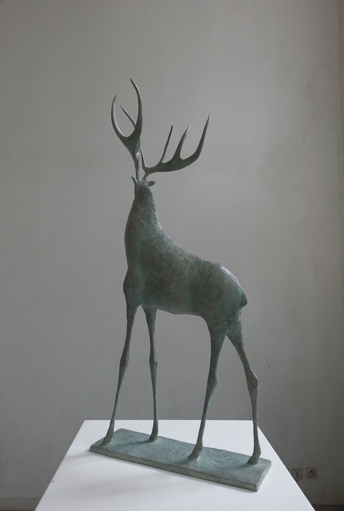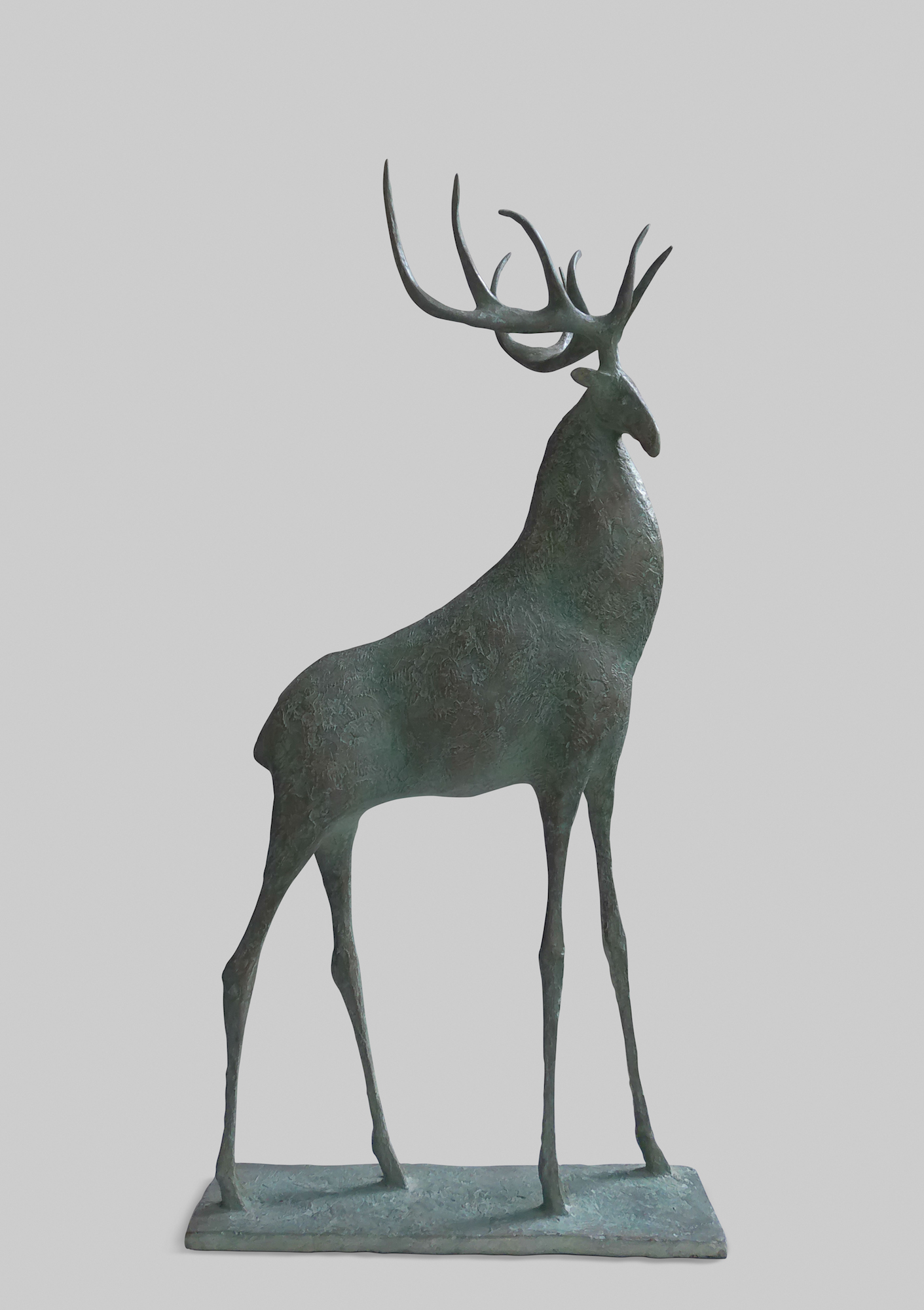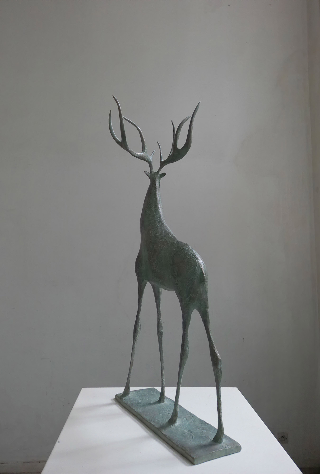 Cette sculpture en bronze représente un cerf à l’arrêt, le corps tendu dans une position d’attente active. L’ampleur de ses bois, la puissance de son corps et la finesse de ses jambes lui donnent une silhouette tout en contraste d’une grande élégance. Comme souvent, l’artiste parvient à exprimer dans une même figure la force et la fragilité, l’immobilité et l’imminence d’un mouvement, l’équilibre et sa précarité.