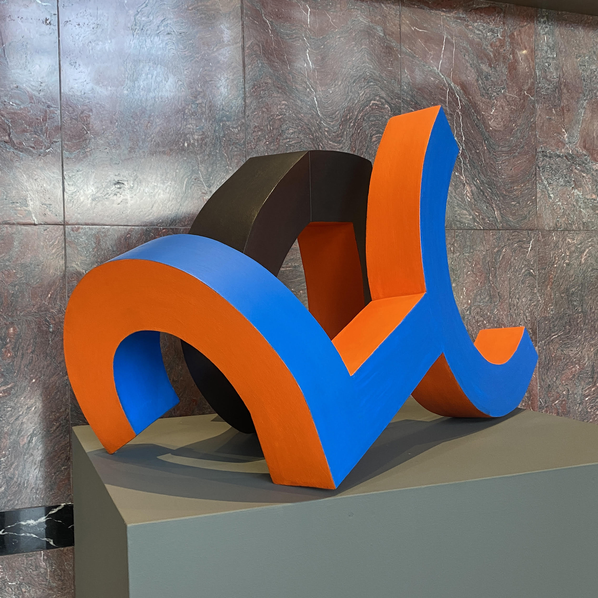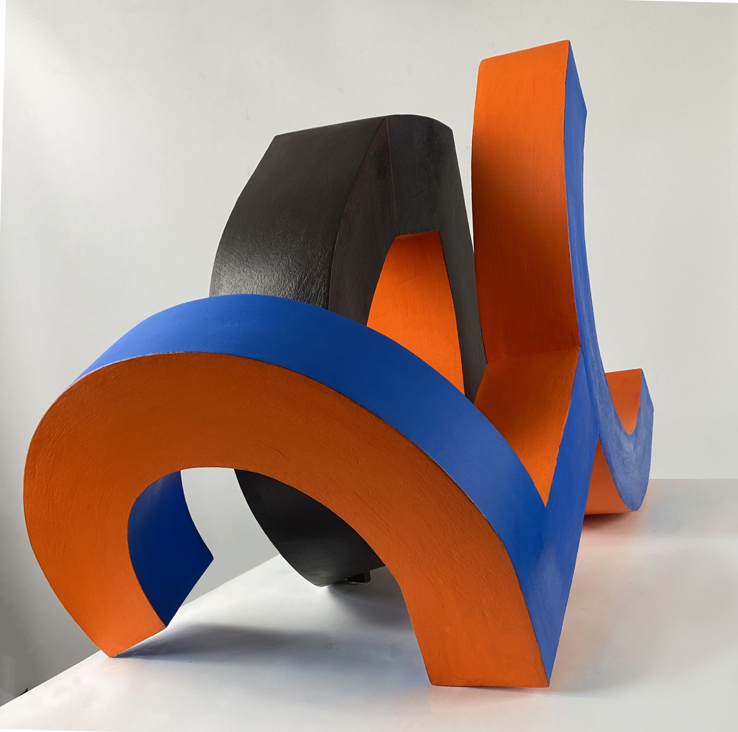 Construction (2) est une œuvre de l’artiste britannique Patricia Volk. La sculptrice a choisi d’utiliser des couleurs noir, bleue et orange pour cette œuvre.