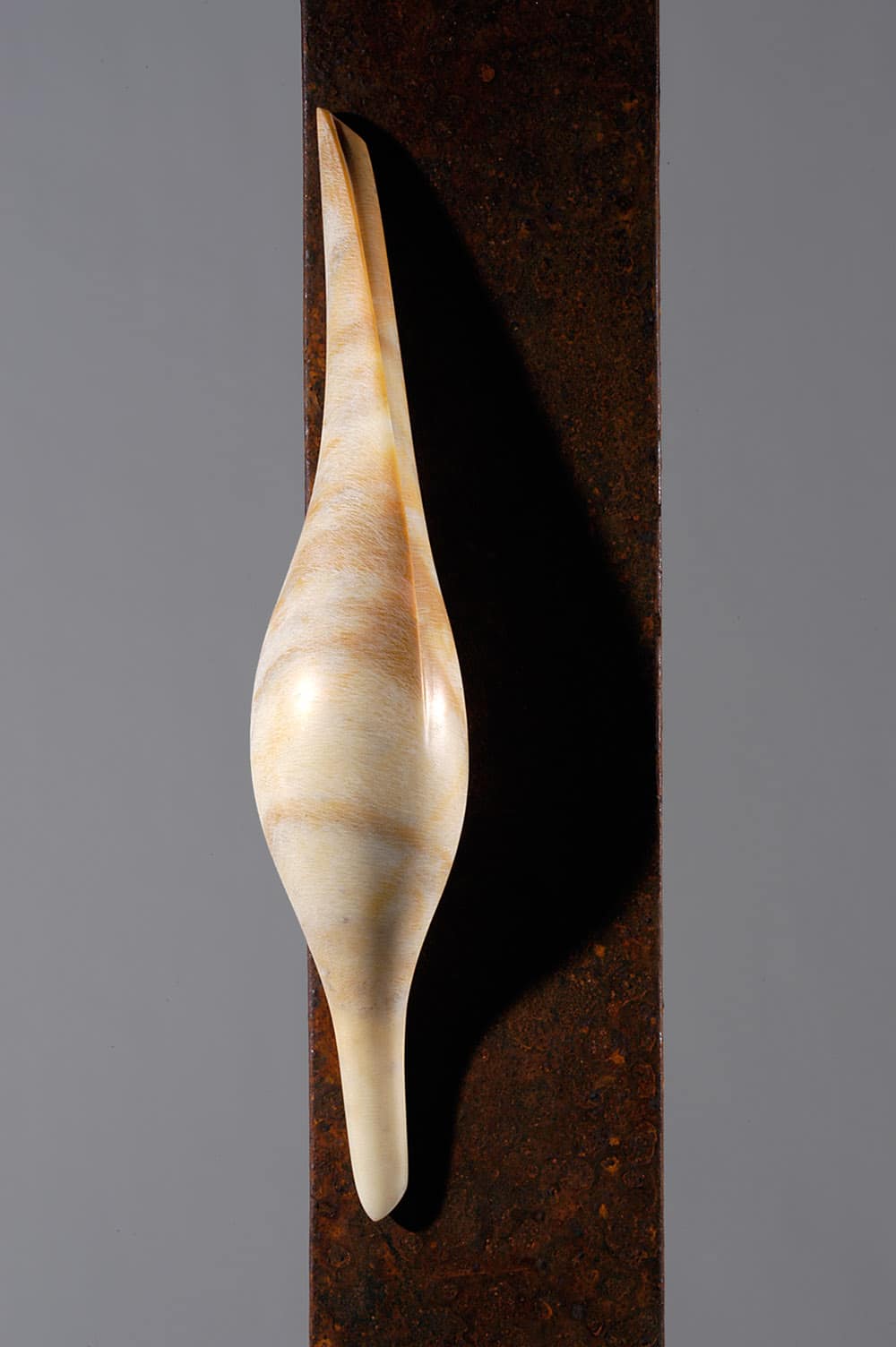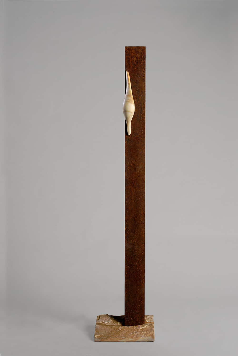 Les dimensions indiquées incluent la base de la sculpture. Dimensions de la base : 10 H x 40 L x 30 P cm. Dimensions du nid en marbre : 40 H x 12 L x 12 P cm. La partie verticale en fer est rectangulaire, vide à l’intérieur mais fermée en haut.