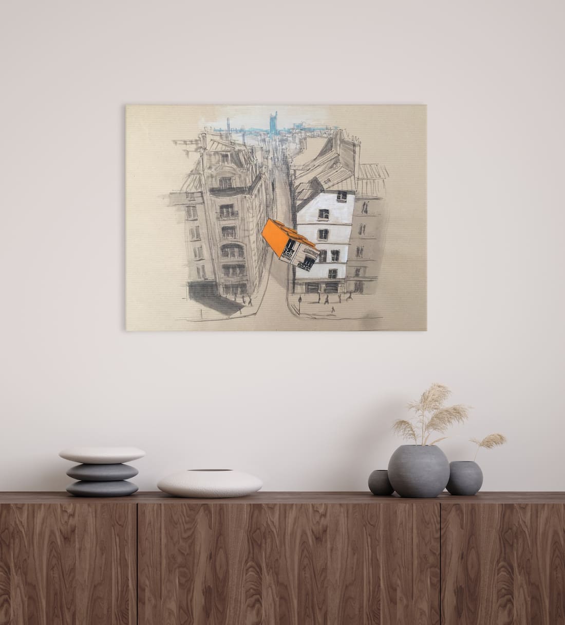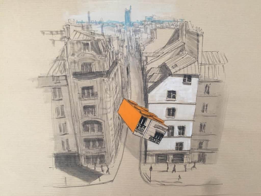 Ce croquis sur papier kraft témoigne des premières intentions de l’artiste et de la genèse de son travail autour de l’architecture parisienne entre perspective et jeu de lumière. Les traits à l’encre permettent de révéler la structure des futures œuvres, ainsi que la réflexion inhérente à ce projet pour lequel des formes peintes en couleur aux allures de Lego se mêlent aux immeubles Haussmannien. Cette étude initiale sur un simple papier est parfaitement ancrée dans l’univers esthétique de Guillaume Chansarel tout en marquant le début d’un nouveau chapitre créatif.