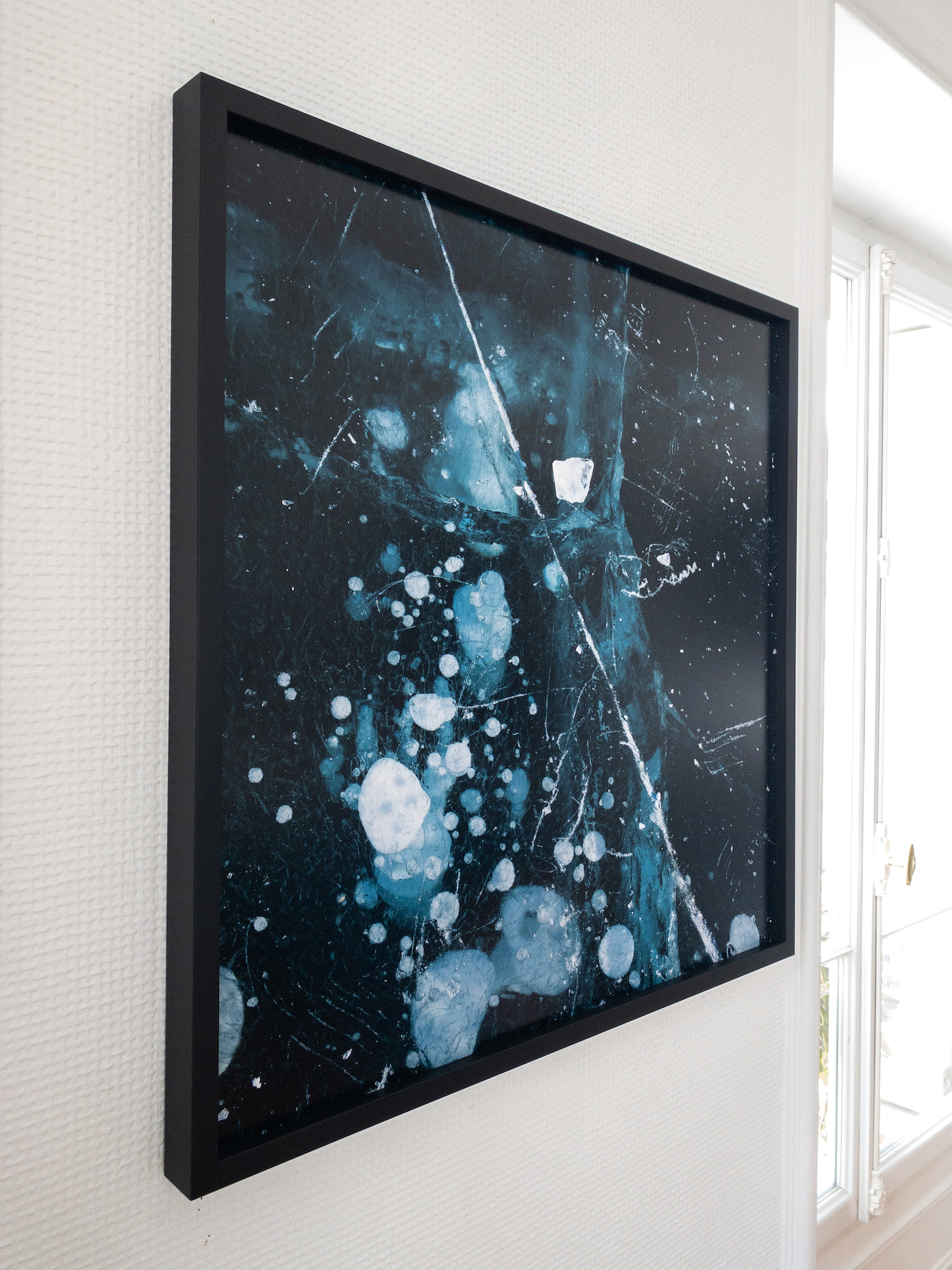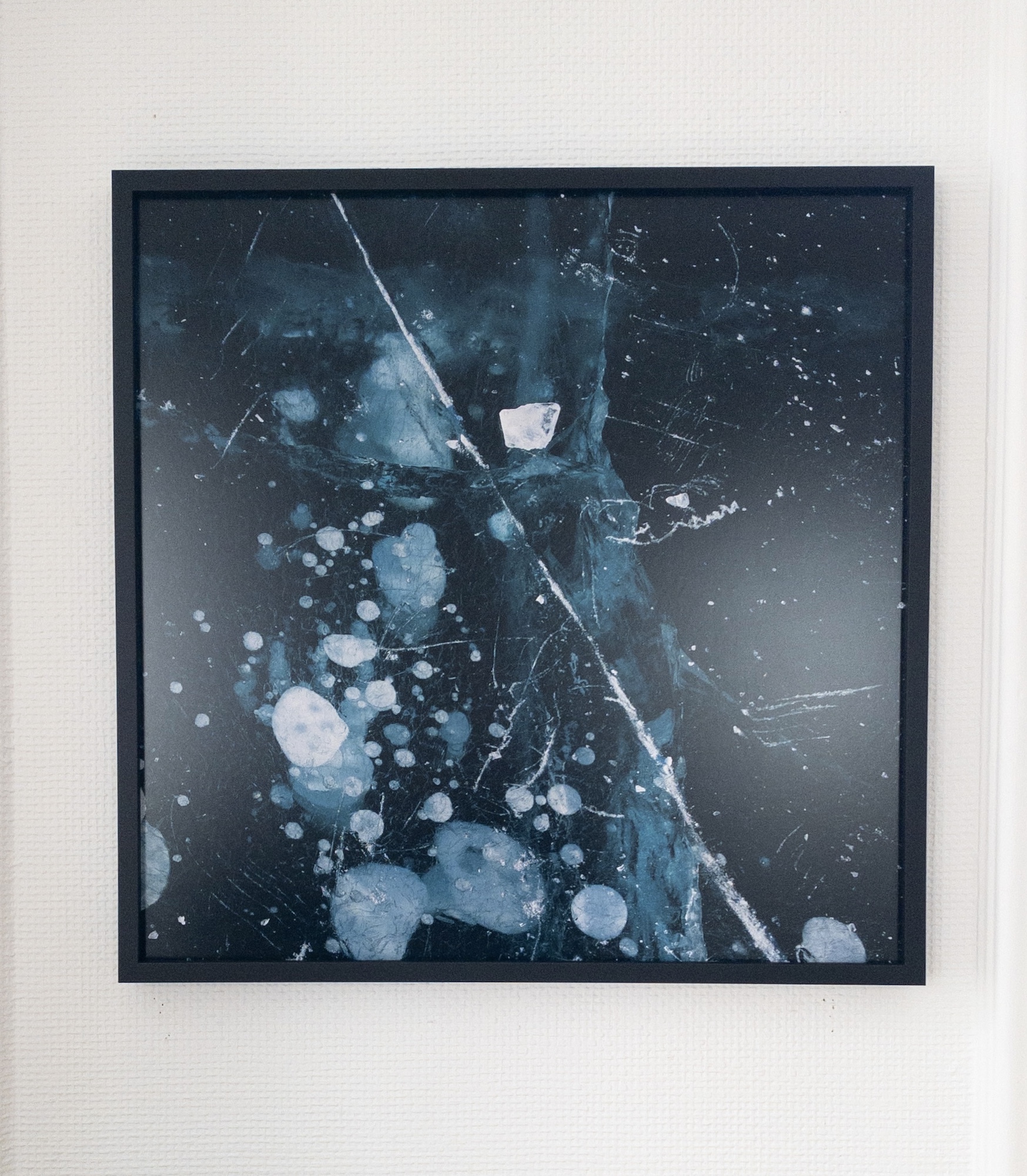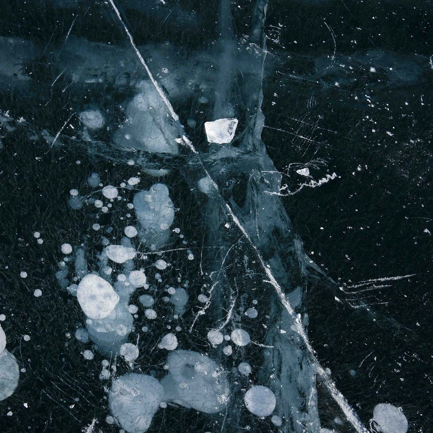 Cryo est une série qui explore le phénomène naturel du lac Abraham en Alberta, Canada. Le lac relâche des boules de méthane de la terre dans l’eau, mais ce processus est visible seulement pendant une période très spécifique et brève de l’année. En hiver, quand la température tombe à -45 C° et que le lac gèle, l’eau entoure, capture et suspend des milliers de boules de méthane, comme des sculptures de glace. Dans ses photographies, l’artiste veut immortaliser la beauté de la nature en transition, en dépit de conditions de travail extrêmement dures et hostiles.