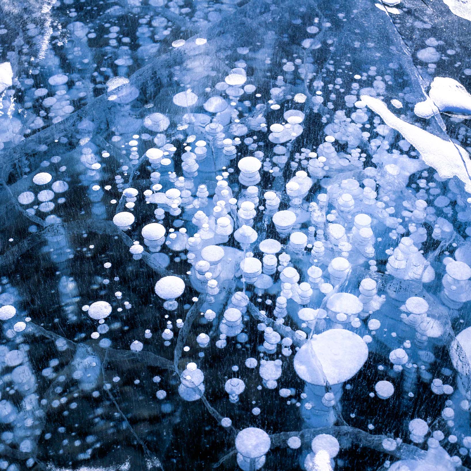 Cryo est une série qui explore le phénomène naturel du lac Abraham en Alberta, Canada. Le lac relâche des boules de méthane de la terre dans l’eau, mais ce processus est visible seulement pendant une période très spécifique et brève de l’année. En hiver, quand la température tombe à -45 C° et que le lac gèle, l’eau entoure, capture et suspend des milliers de boules de méthane, comme des sculptures de glace. Dans ses photographies, l’artiste veut immortaliser la beauté de la nature en transition, en dépit de conditions de travail extrêmement dures et hostiles.