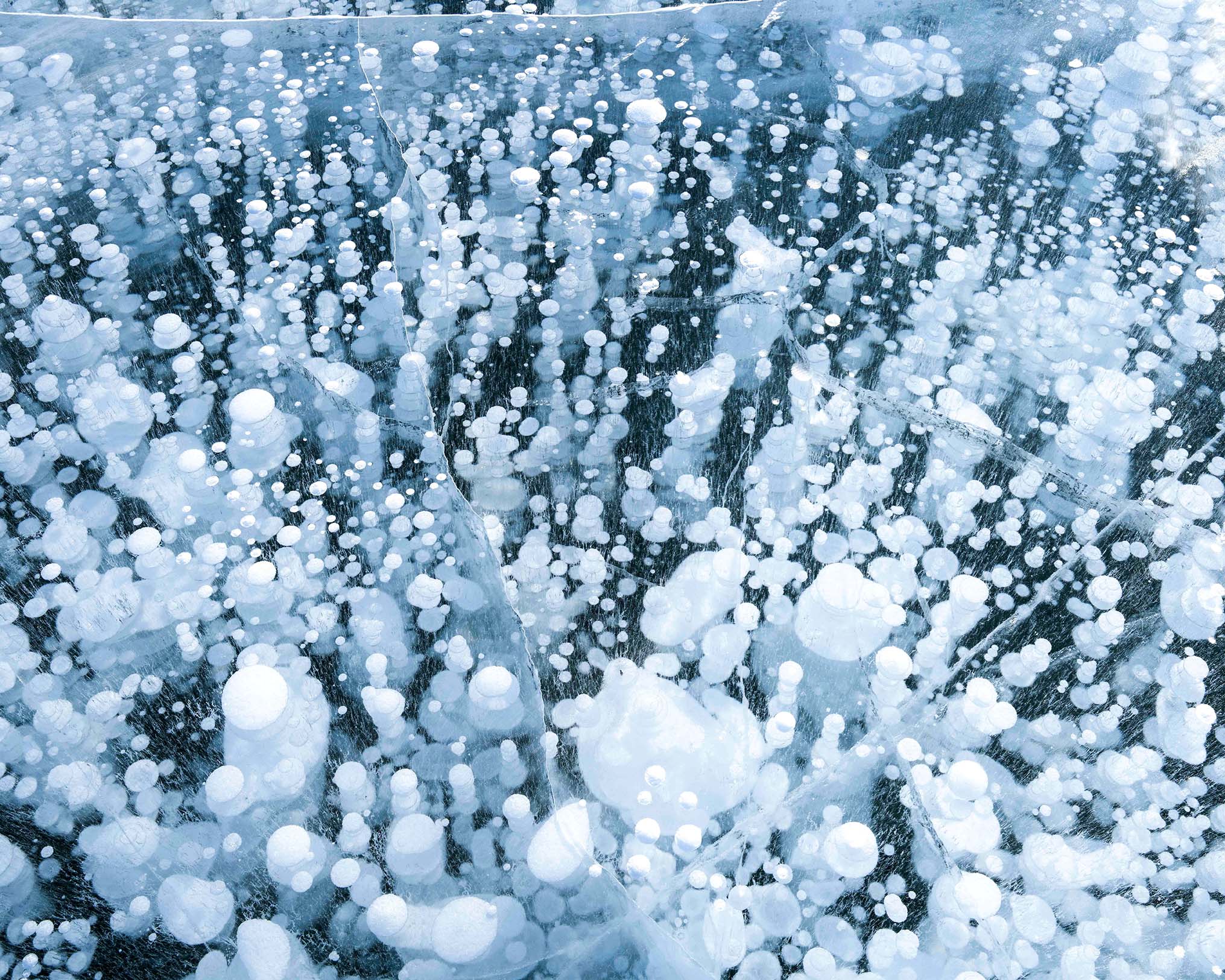 Cryo est une série qui explore le phénomène naturel du lac Abraham en Alberta, Canada. Le lac relâche des boules de méthane de la terre dans l’eau, mais ce processus est visible seulement pendant une période très spécifique et brève de l’année. En hiver, quand la température tombe à -45 C° et que le lac gèle, l’eau entoure, capture et suspend des milliers de boules de méthane, comme des sculptures de glace. Dans ses photographies, l’artiste veut immortaliser la beauté de la nature en transition, en dépit de conditions de travail extrêmement dures et hostiles.