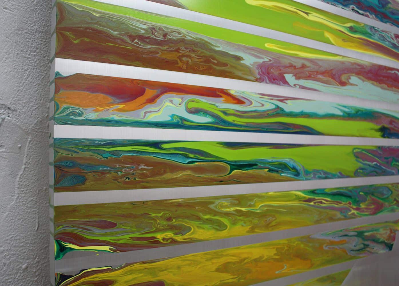 Dans cette série de peintures abstraites l’artiste expérimente la technique du dripping qu’elle combine avec des champs de couleurs fixes. Ce qui l’intéresse dans cette pratique c’est l’aléatoire, la peinture se déverse sur l’aluminium et les coulures se mélangent aux aplats de couleurs déjà stables. Le résultat final est toujours inattendu. Ahn Hyun-Ju compare ce processus à un dialogue entre deux langues étrangères.