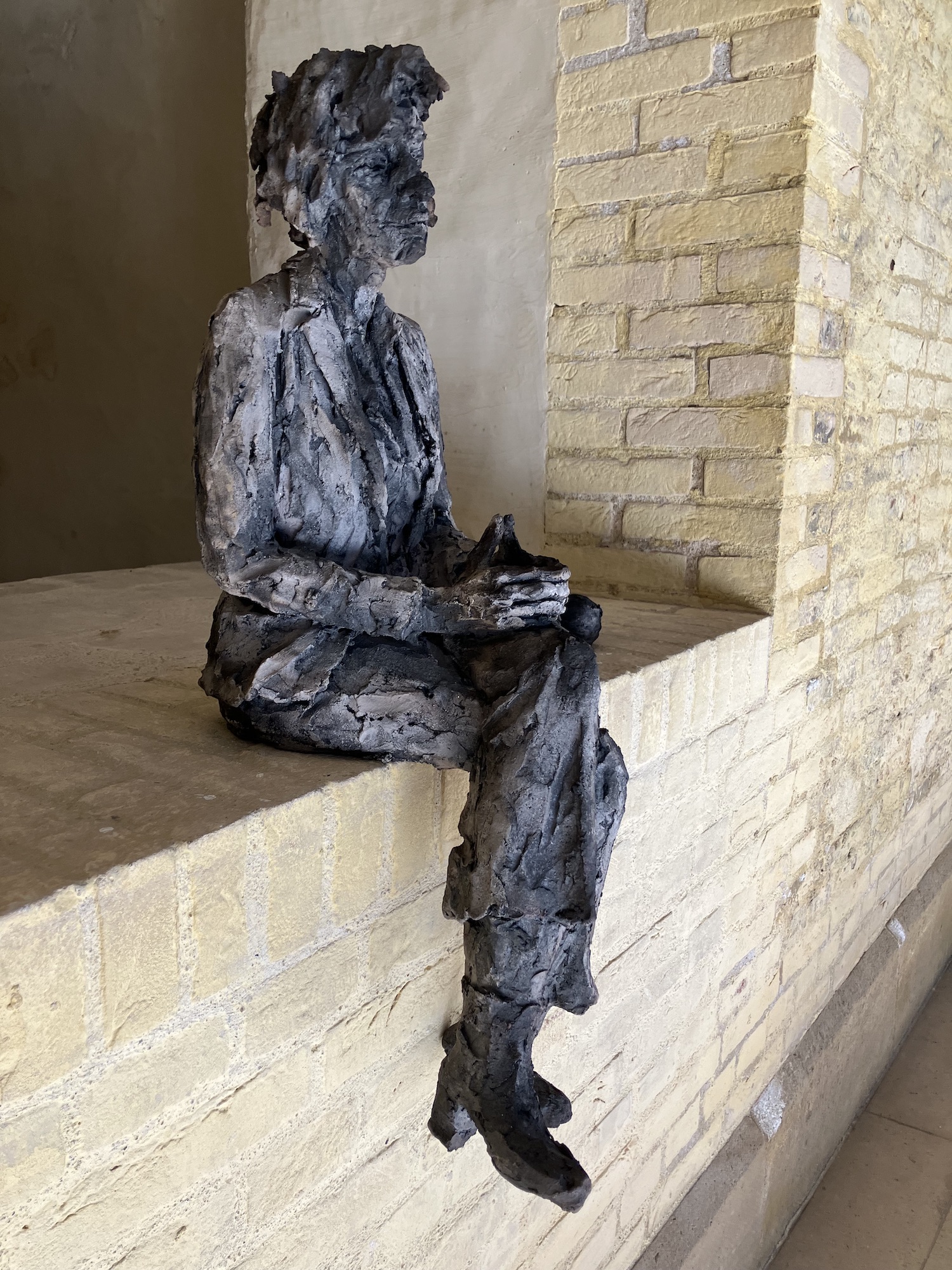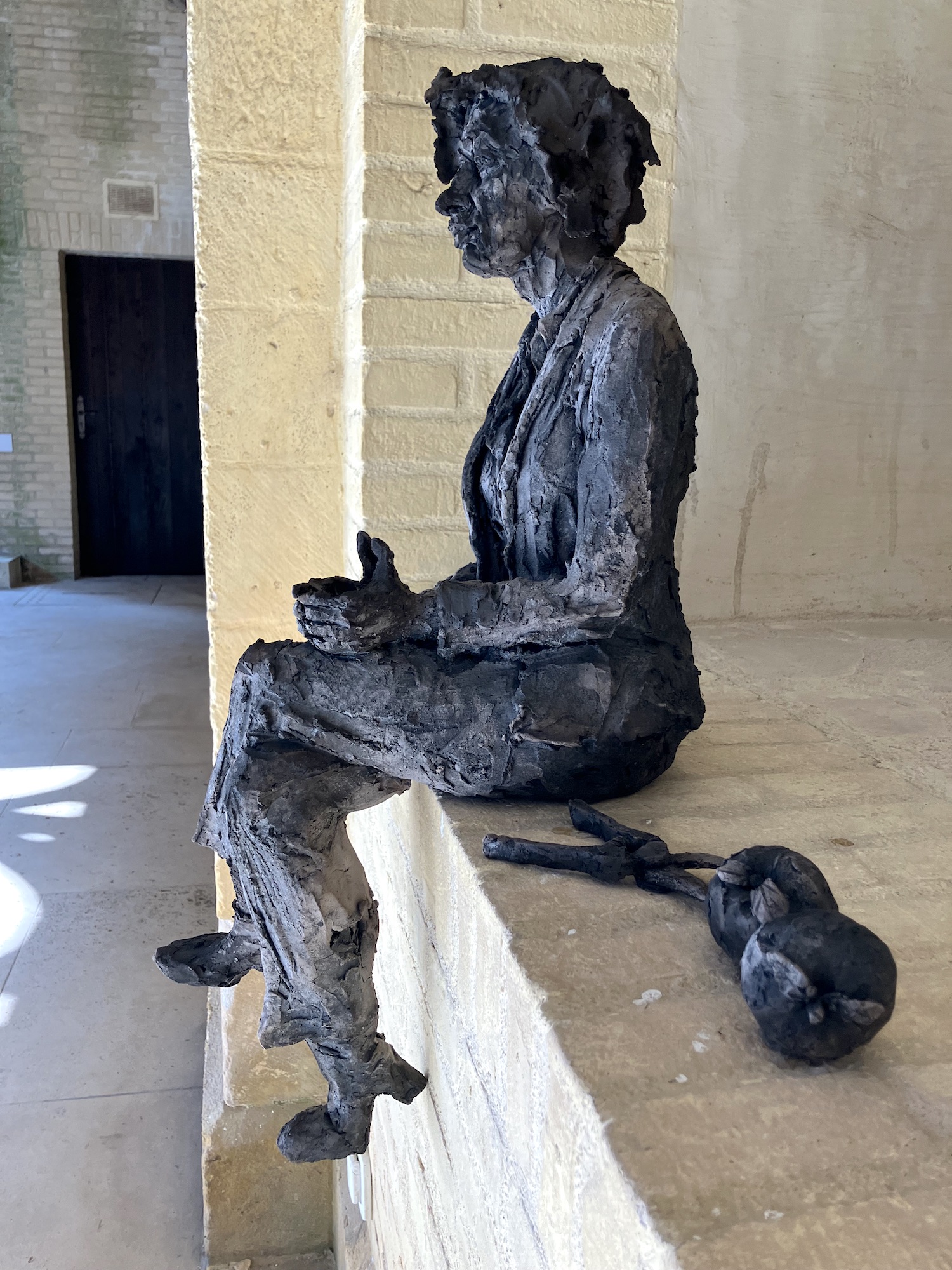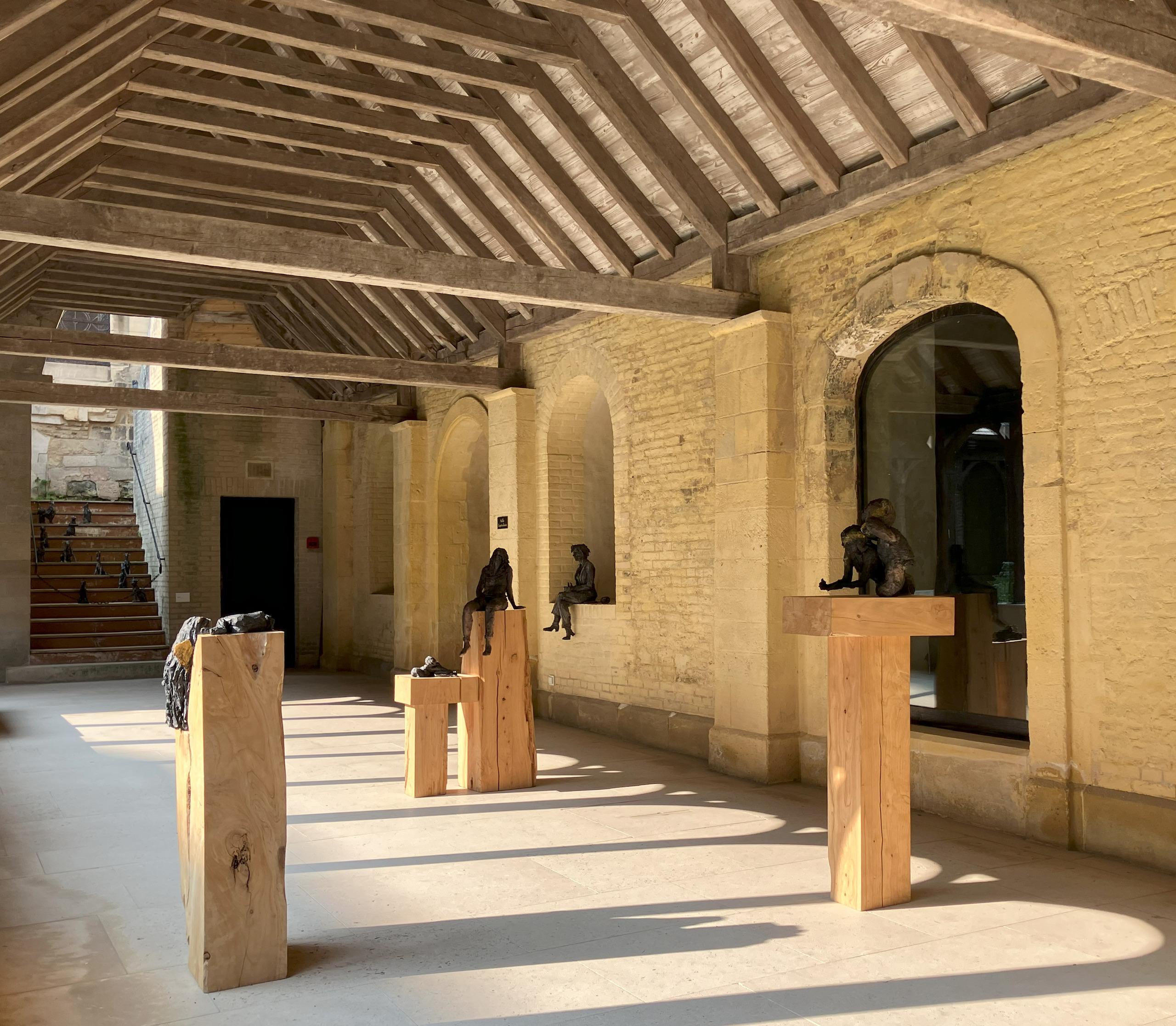 Cette sculpture a été exposée à l’exposition personnelle de Cécile Raynal à l’Abbaye de Montivilliers, en Normandie (2025). Dans ce lieu historique où vécurent il y a longtemps femmes, sœurs et abbesses, la sculptrice a choisi de présenter des œuvres réunissant portraits de femmes et de bêtes. Les sculptures de Cécile Raynal ne cherchent pas à séduire, elles peuvent même parfois paraître inquiétantes. Rugueuses, elles portent en elles les traces d’un passage par la matière, par l’épreuve, et pourtant elles se dressent, debout, vivantes. Elles convoquent un monde où la part animale, féminine, instinctive ou rebelle est assumée comme une force essentielle. Dans les espaces restaurés de l’Abbaye, l’exposition retrace les quinze dernières années du parcours singulier de l’artiste française (plus d’informations sur cette exposition ici).