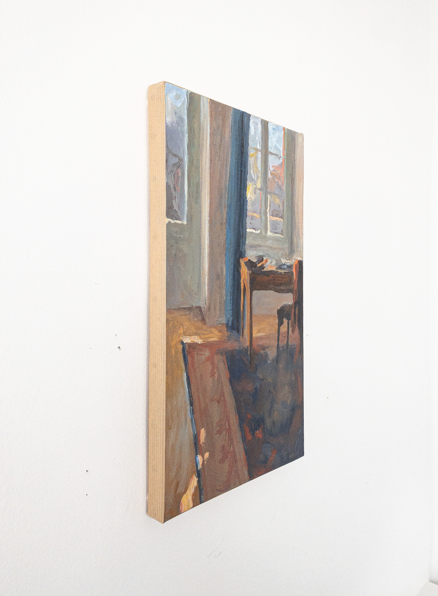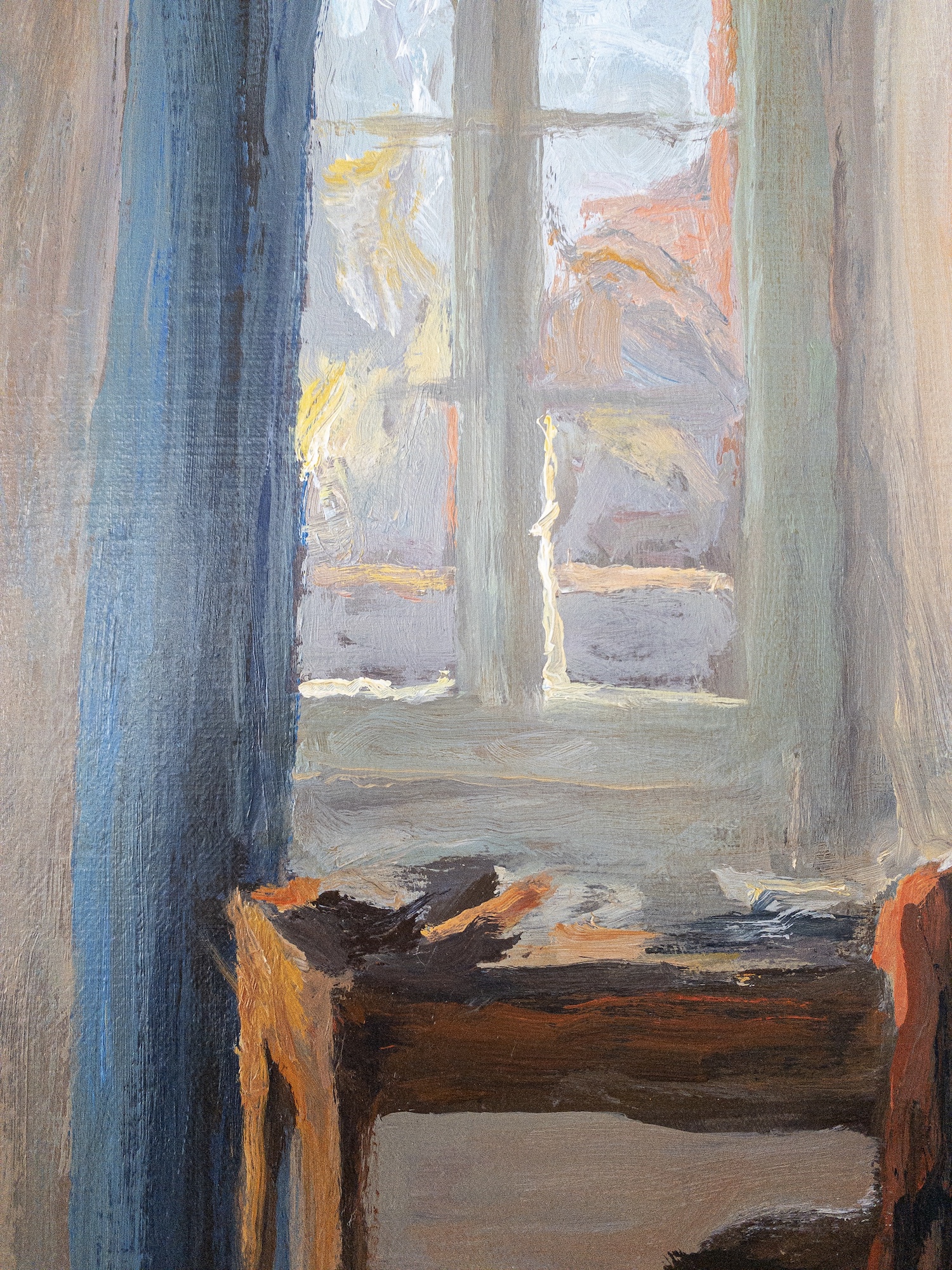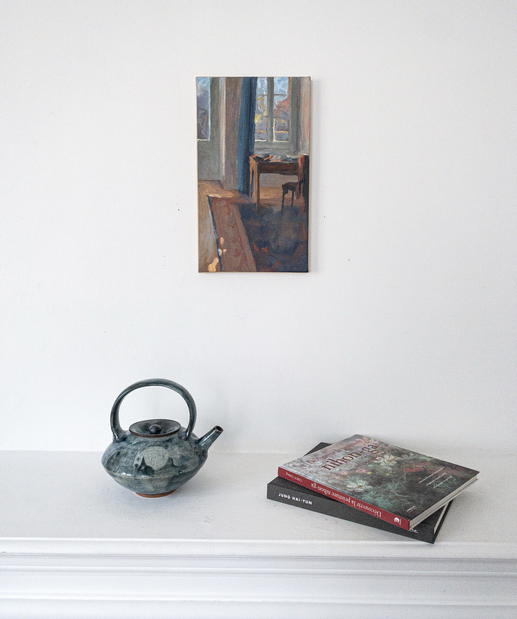 Majoritairement composée de tableaux de paysages naturels, cette représentation d’un environnement domestique fait figure d’exception dans l’œuvre picturale de Valérie de Sarrieu. Cependant, la nature est toujours omniprésente : les plantes en dehors de la fenêtre ou la lumière du jour qui rentre dans la pièce.