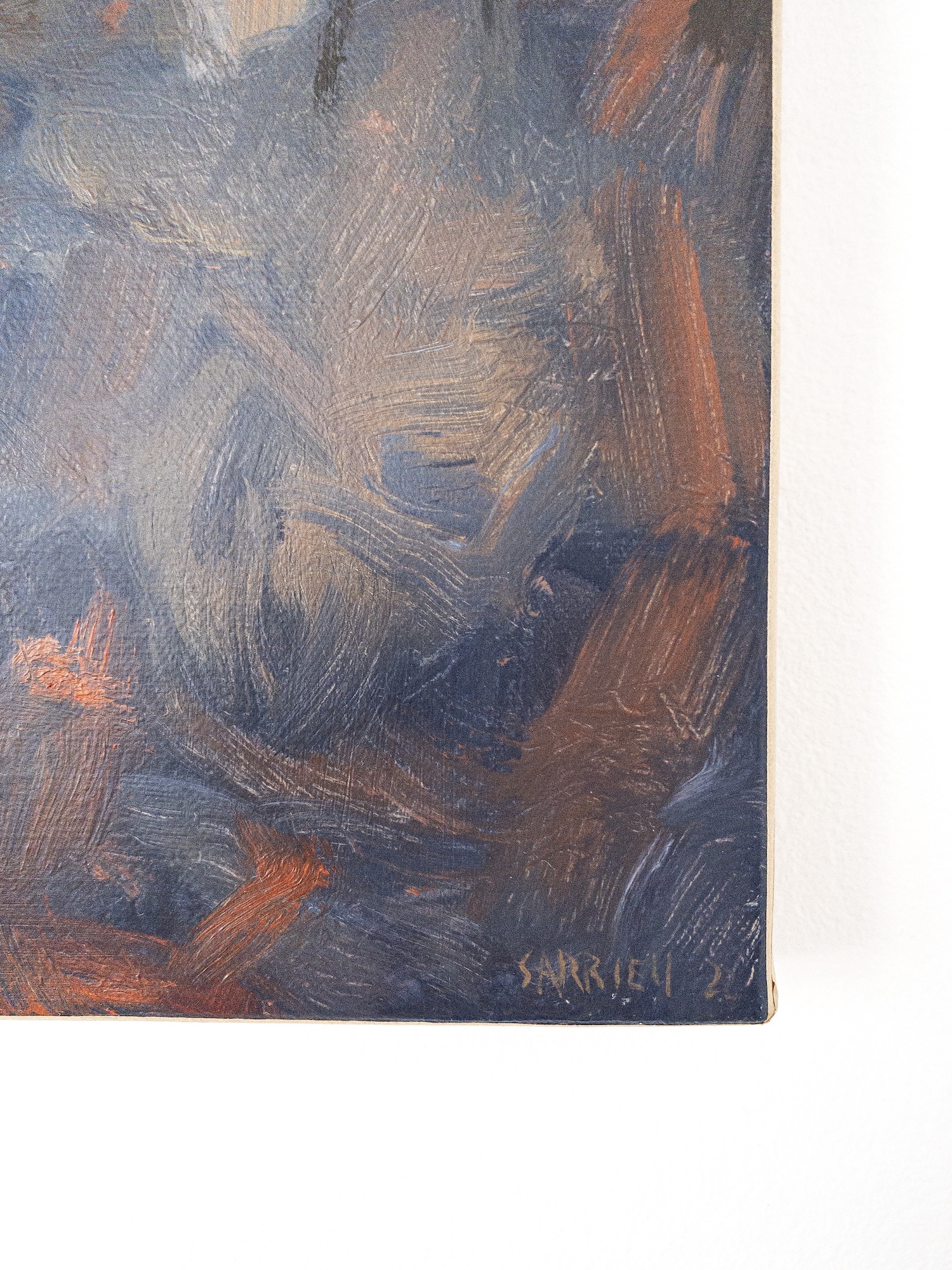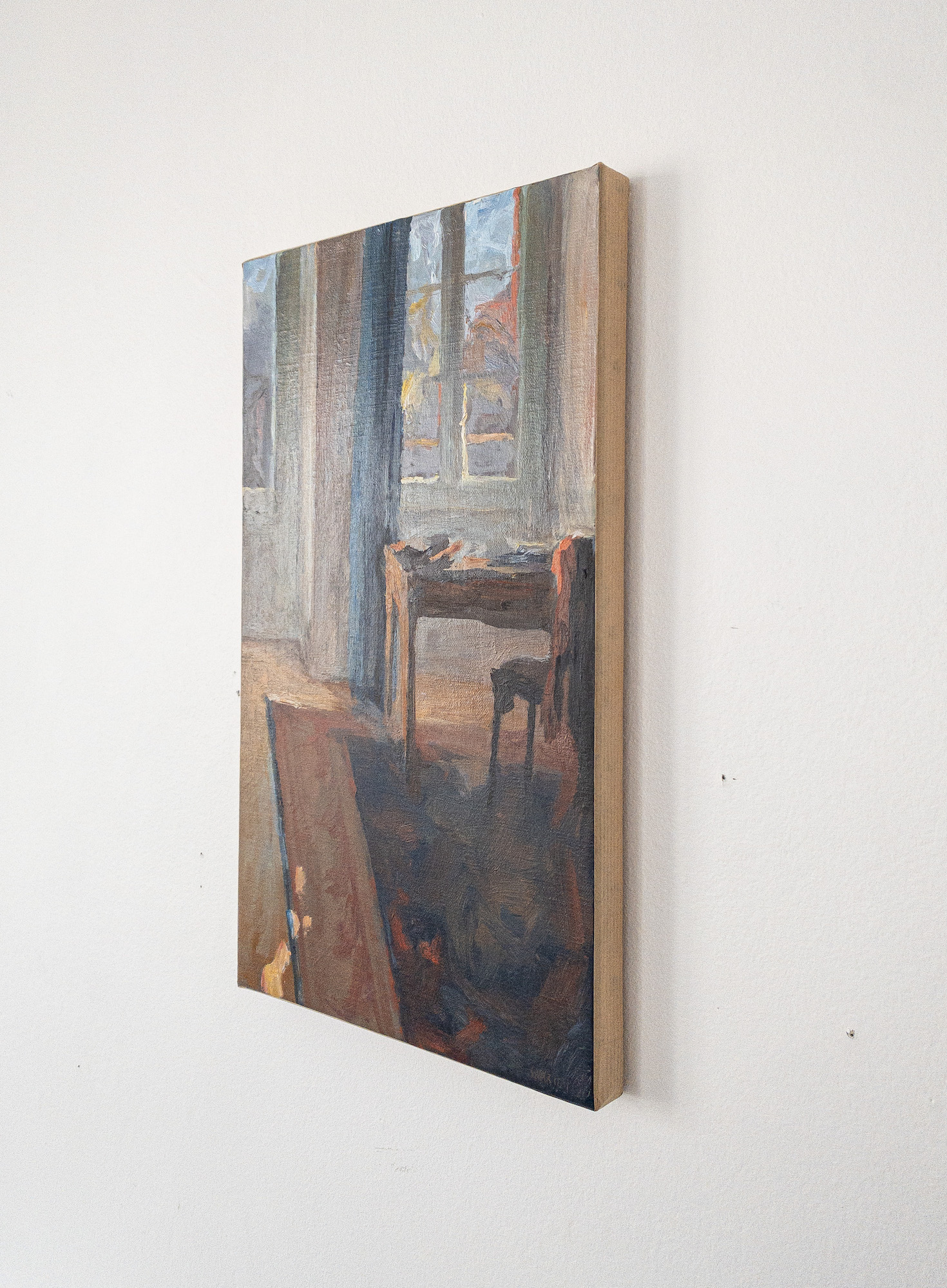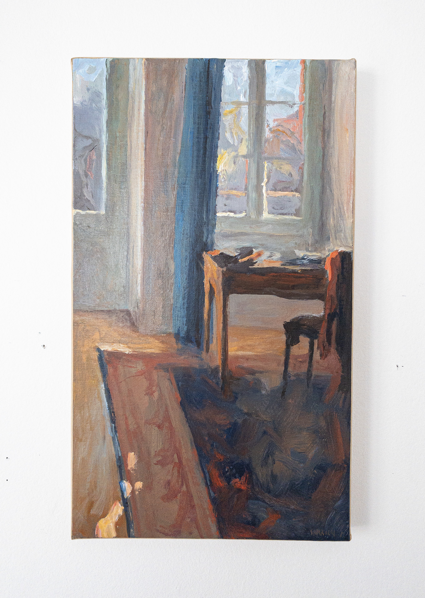 Majoritairement composée de tableaux de paysages naturels, cette représentation d’un environnement domestique fait figure d’exception dans l’œuvre picturale de Valérie de Sarrieu. Cependant, la nature est toujours omniprésente : les plantes en dehors de la fenêtre ou la lumière du jour qui rentre dans la pièce.