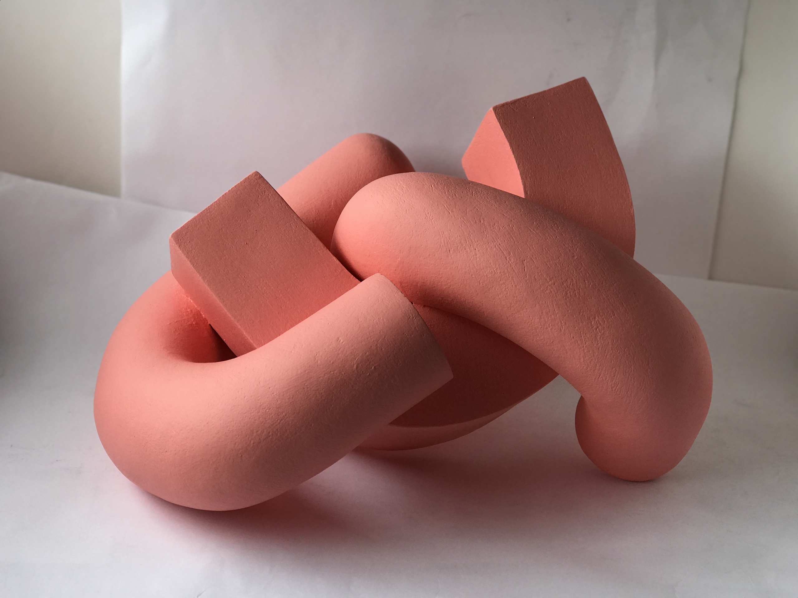 Les sculptures abstraites de Patricia Volk naissent de la combinaison unique entre deux éléments : la forme et la couleur. L’artiste débute son processus de création en découpant des morceaux de terre, son matériau de prédilection, à la recherche de la ligne parfaite qui pour elle est une ligne simple et dynamique. Successivement, les morceaux sont cuits et assemblés pour construire la forme finale de la sculpture. Pour cette œuvre, l’artiste a monté la céramique sur une base en MDF. Elle explique : « Il n’y a pas d’idée préconçue, soit (la pièce) marche soit elle ne marche pas. Il y a tellement de simplicité dans une bonne ligne, c’est complètement sous-estimé, car c’est incroyablement difficile […] mais tellement plaisant d’un point de vue esthétique ».