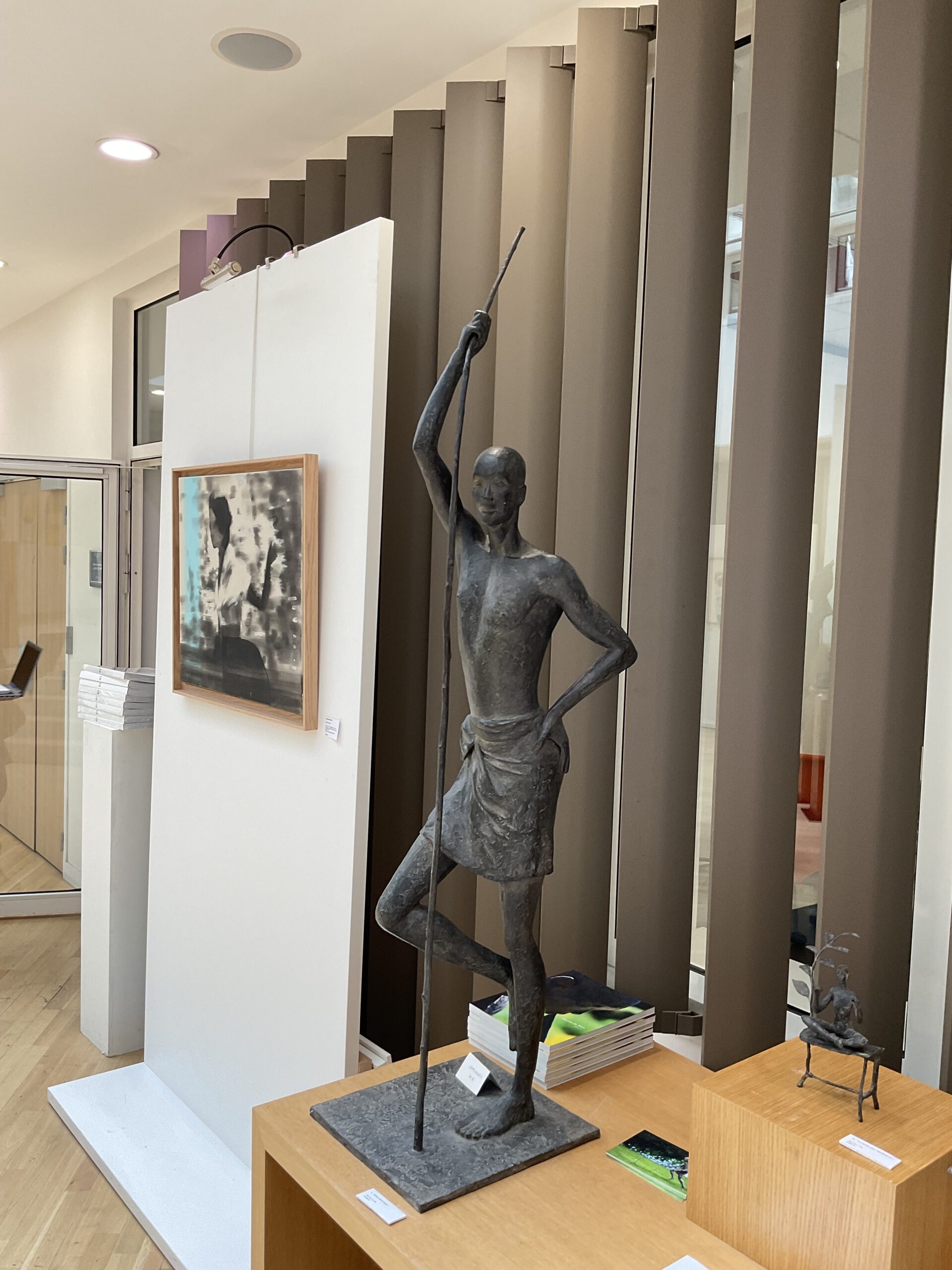 Entre ciel et terre est une sculpture en bronze de l’artiste contemporaine française Marine de Soos. Cette œuvre d’art figuratif représente un jeune homme, simplement vêtu et torse nu, tenant un bâton dans sa main. Le titre de cette sculpture introduit une dimension spirituelle, souvent présente dans les œuvres de Marine de Soos.