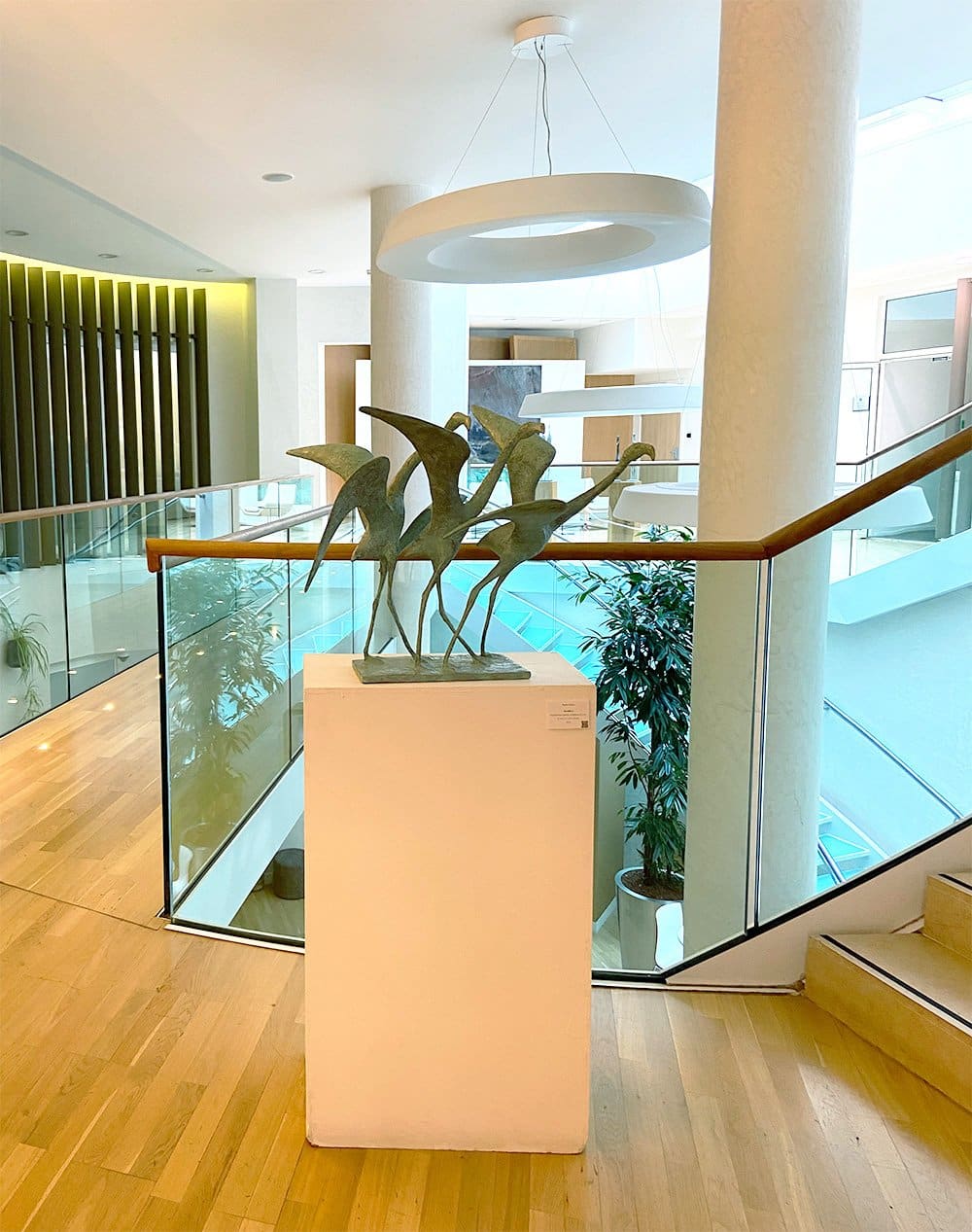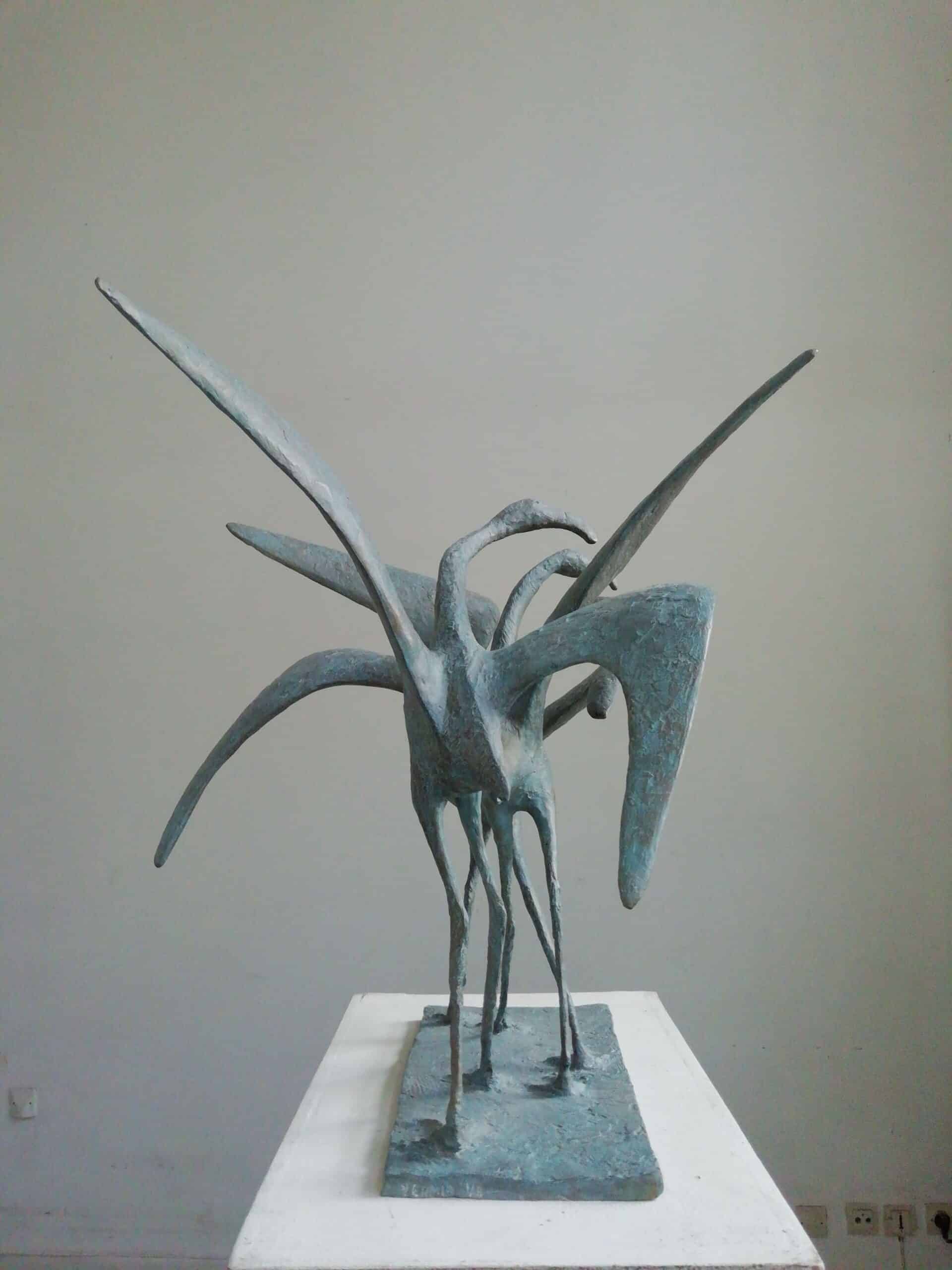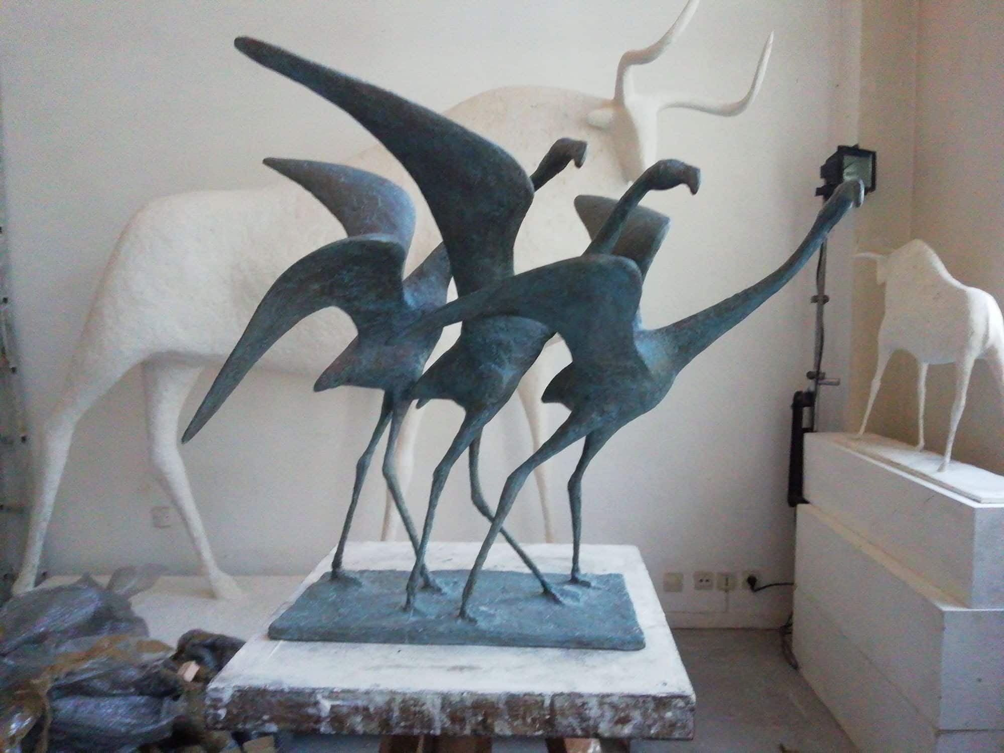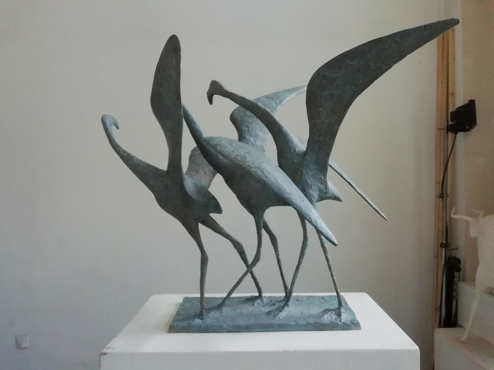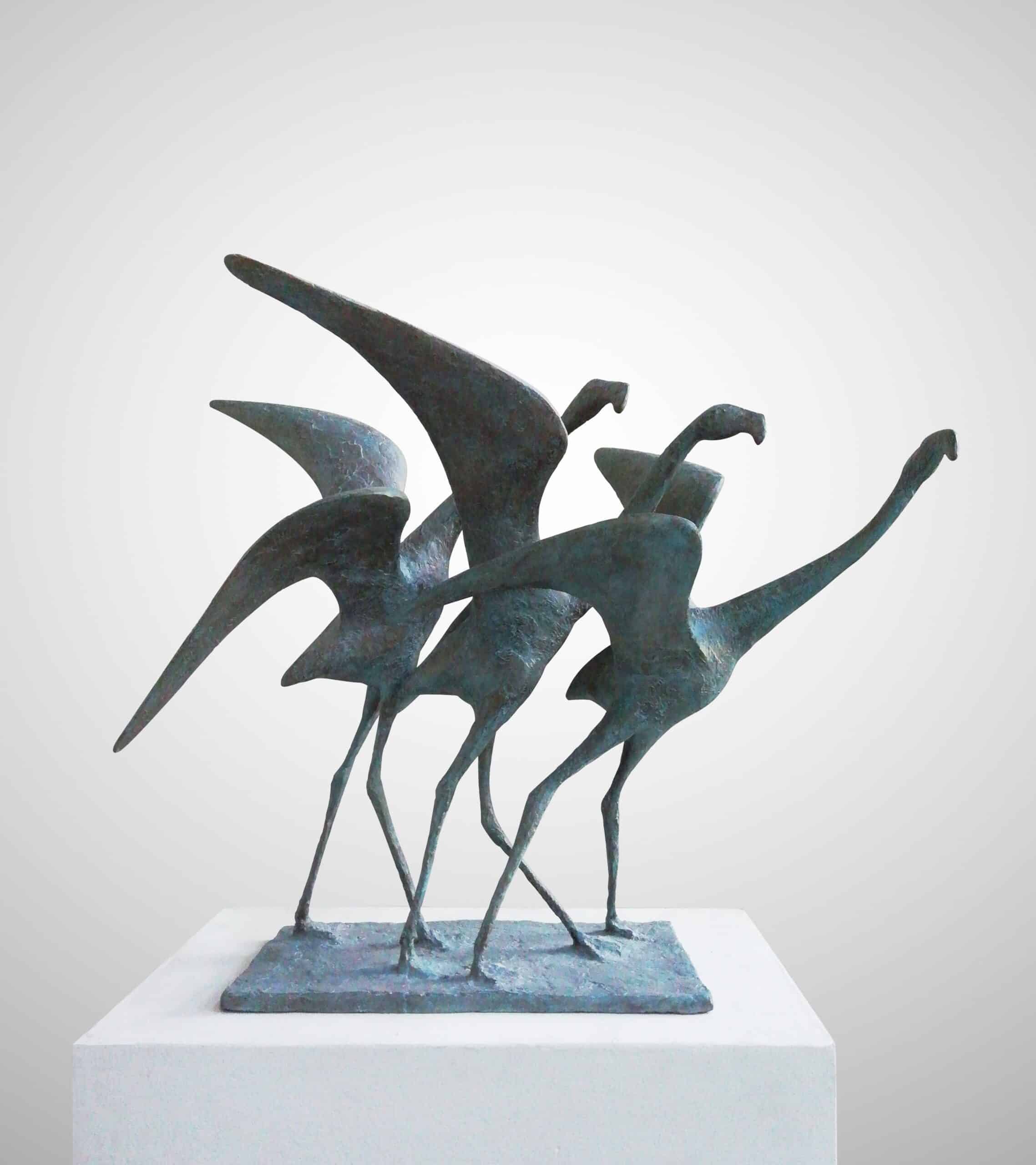 Le thème de l’envol s’est imposé à l’artiste dans sa recherche d’équilibre. Ici le mouvement gracieux des échassiers se dessine avec vigueur et légèreté. Le cou tendu vers le ciel, perchés sur de longs membres frêles, ils s’élancent avec audace, les ailes généreusement déployées. Les rythmes dynamiques et contrastés de leurs formes leur donnent un souffle aérien et créent un espace ouvert.